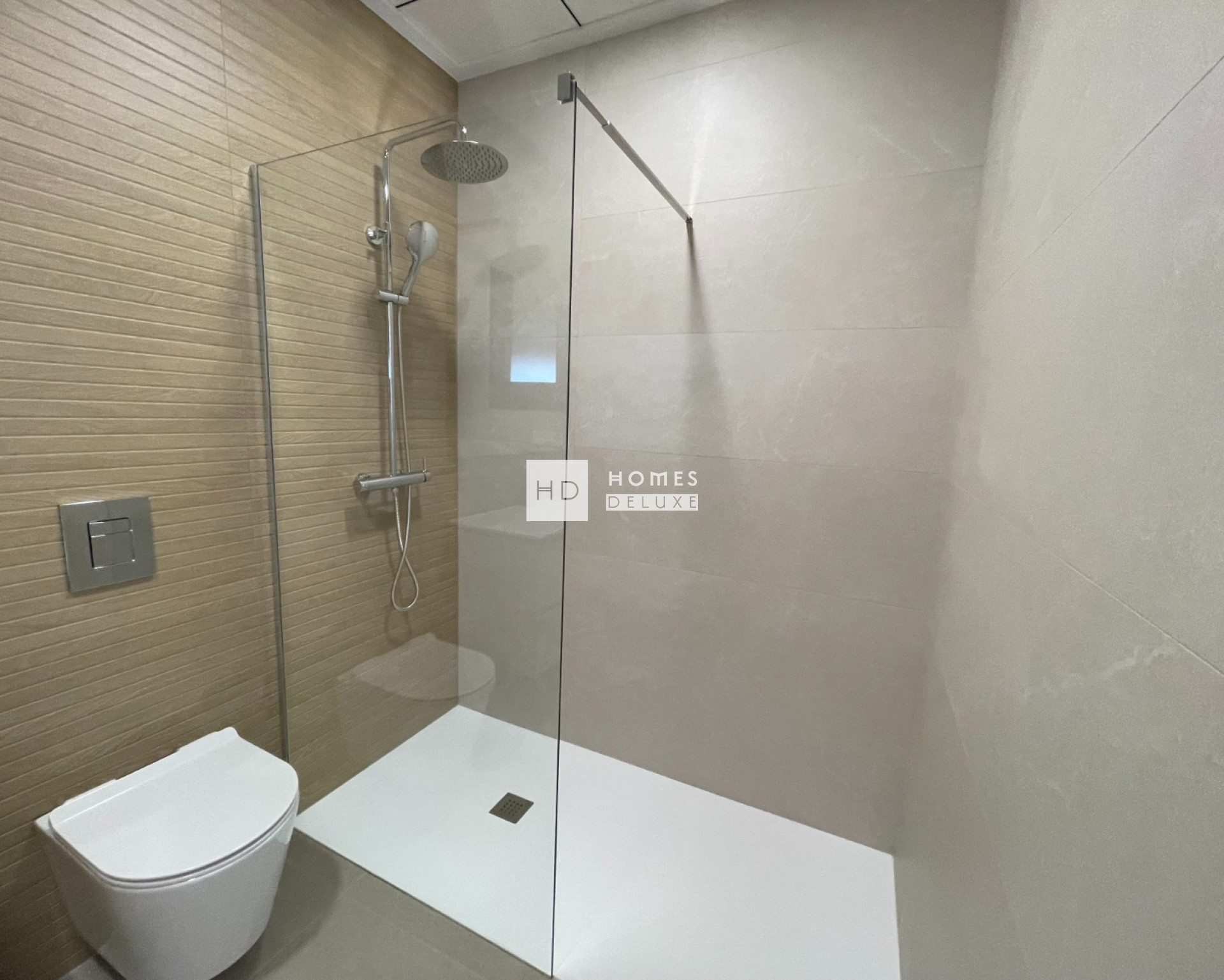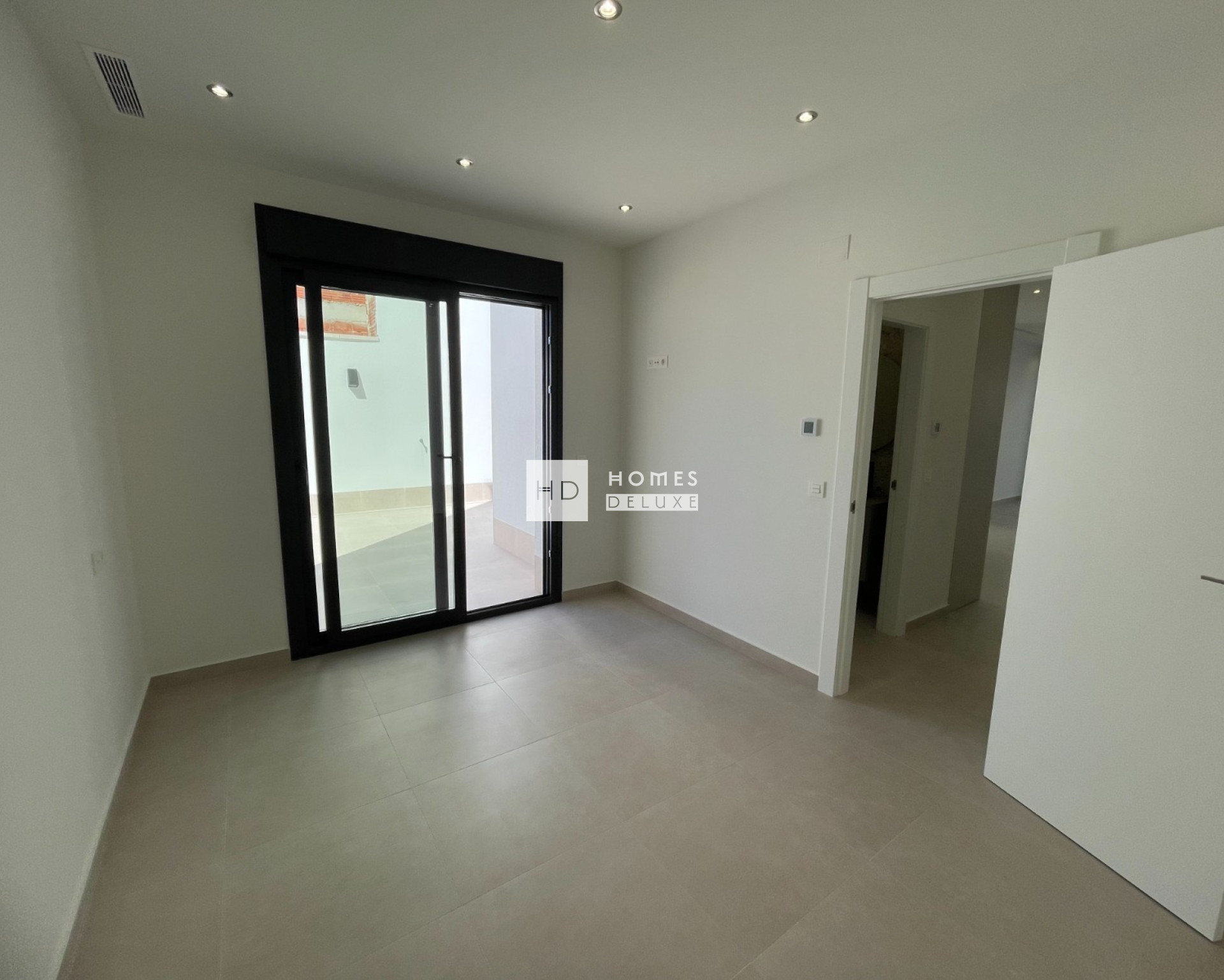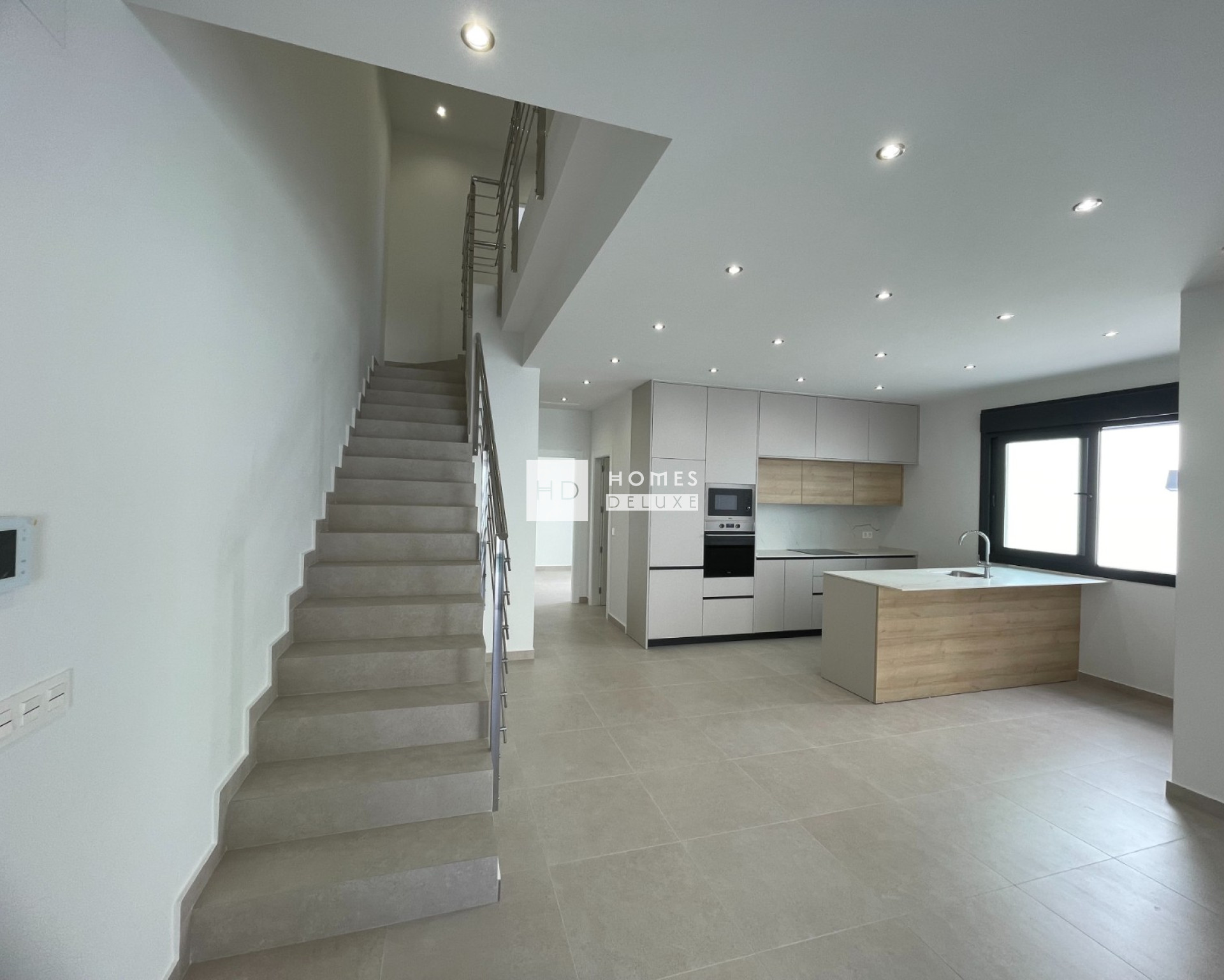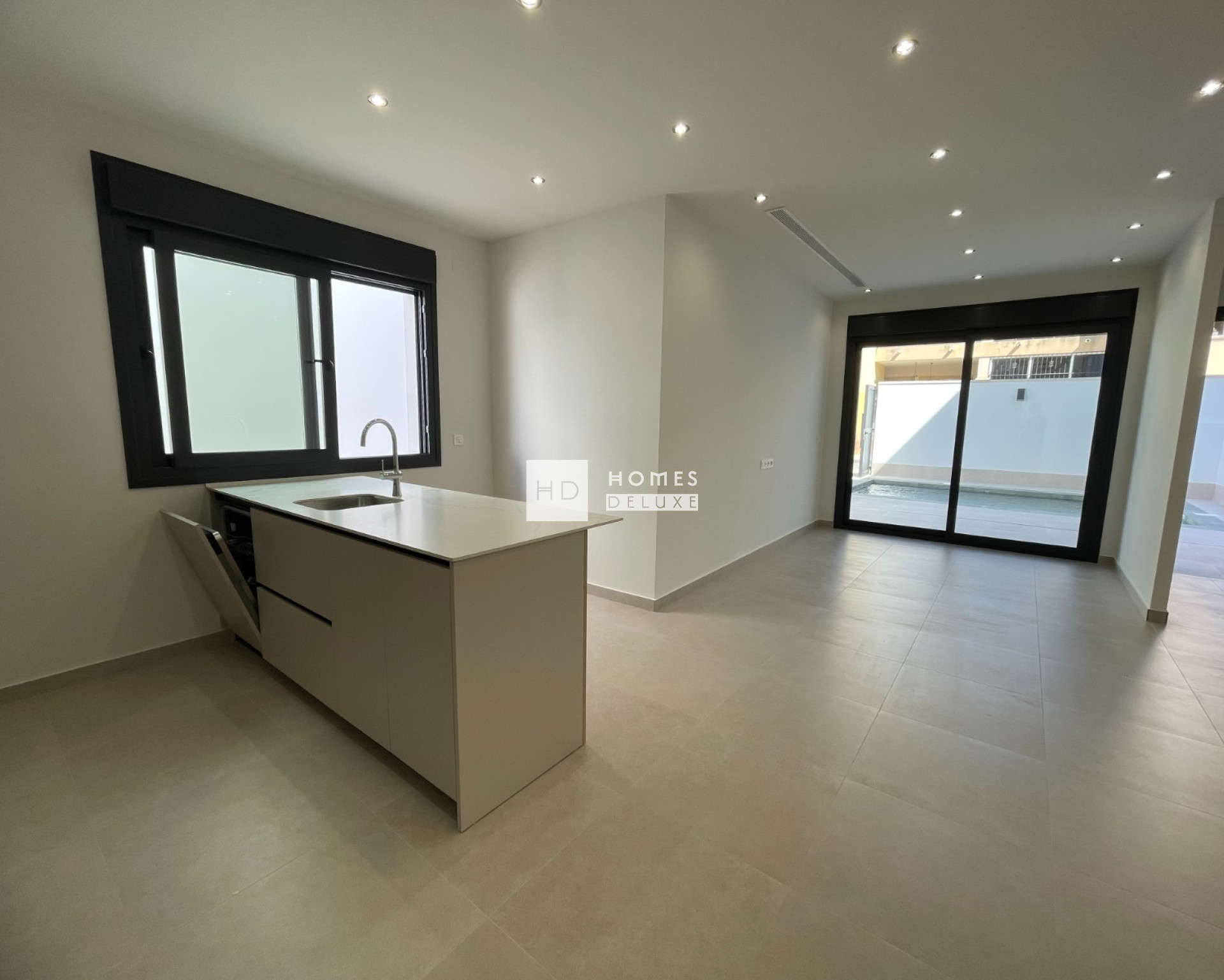 The interior layout comprises of a bright and spacious open plan lounge and dining area with patio doors opening on to the terrace, within the main living space is a fully fitted modern American style kitchen including a centre island, and there is a useful separate laundry room. The ground floor level also includes a good sized double bedroom with patio door access onto a garden area, and there is a separate guest bathroom. The interior staircase leads you to the first floor level with two impressive Suite bedrooms both with en-suite bathrooms and walk-in-wardrobes / dressing areas. The bedroom suite located at the front of the property has access to a private terrace overlooking the garden and pool area. The properties come including ducted air conditioning with zone control, kitchen electrical appliances, built in wardrobes in all bedrooms, interior and exterior LED lighting, garden with automatic irrigation system, private swimming pool, and private parking on the plot.
