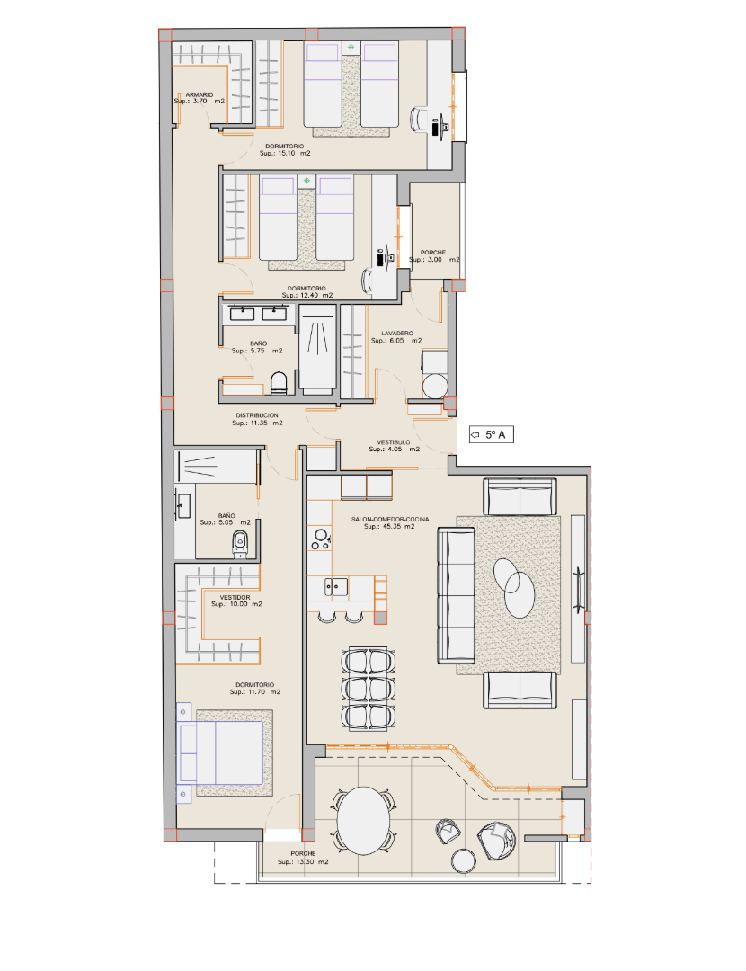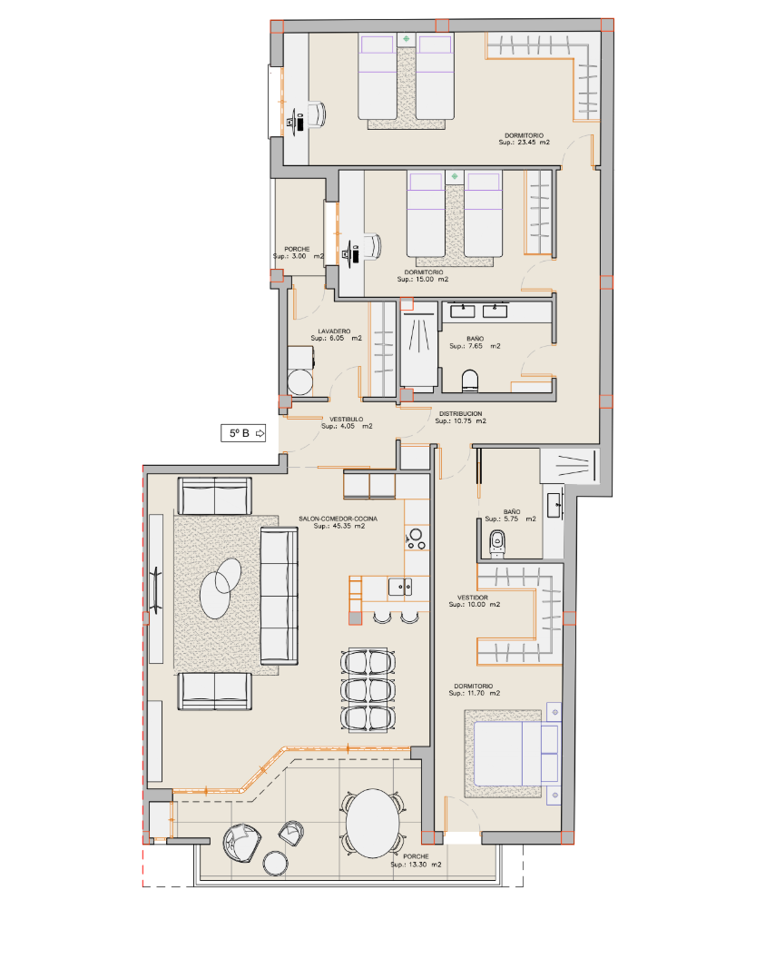 On the ground floor, the building incorporates a commercial space with high visibility, as well as parking spaces and storage rooms, which provide added convenience for residents. In addition, there is a basement with more parking spaces, optimising the available space and facilitating mobility in one of the city’s busiest streets. This comprehensive approach ensures that every need of future owners is covered, from the comfort of the home to the practical aspects of everyday life.