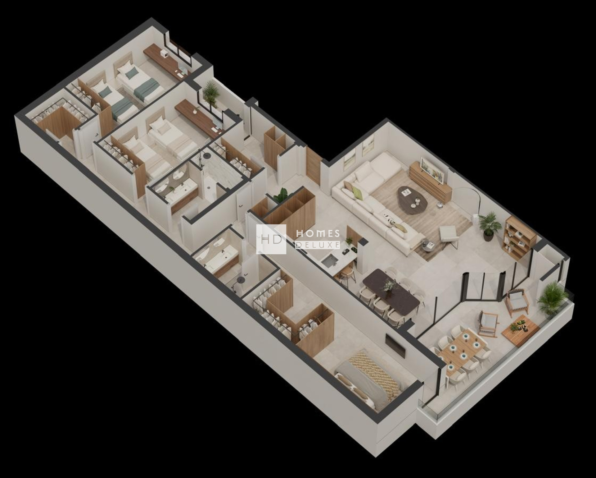 The complex has a total of six floors of homes, most of which feature spacious and balanced layouts. The penthouses also have large terraces with private swimming pools, creating authentic urban homes with unobstructed views and maximum privacy. The usable areas range from 115 to over 156 square metres, reflecting the spaciousness and versatility of the residential offering.