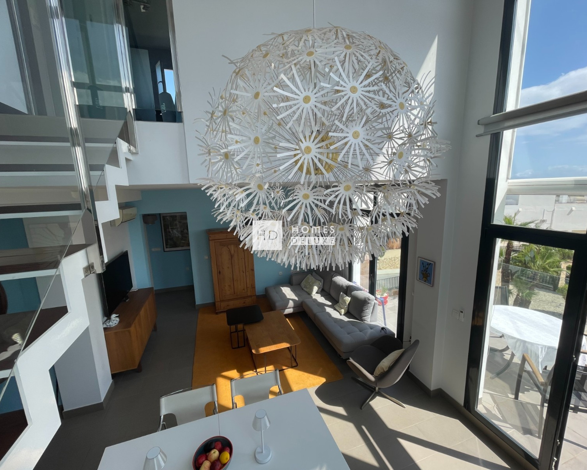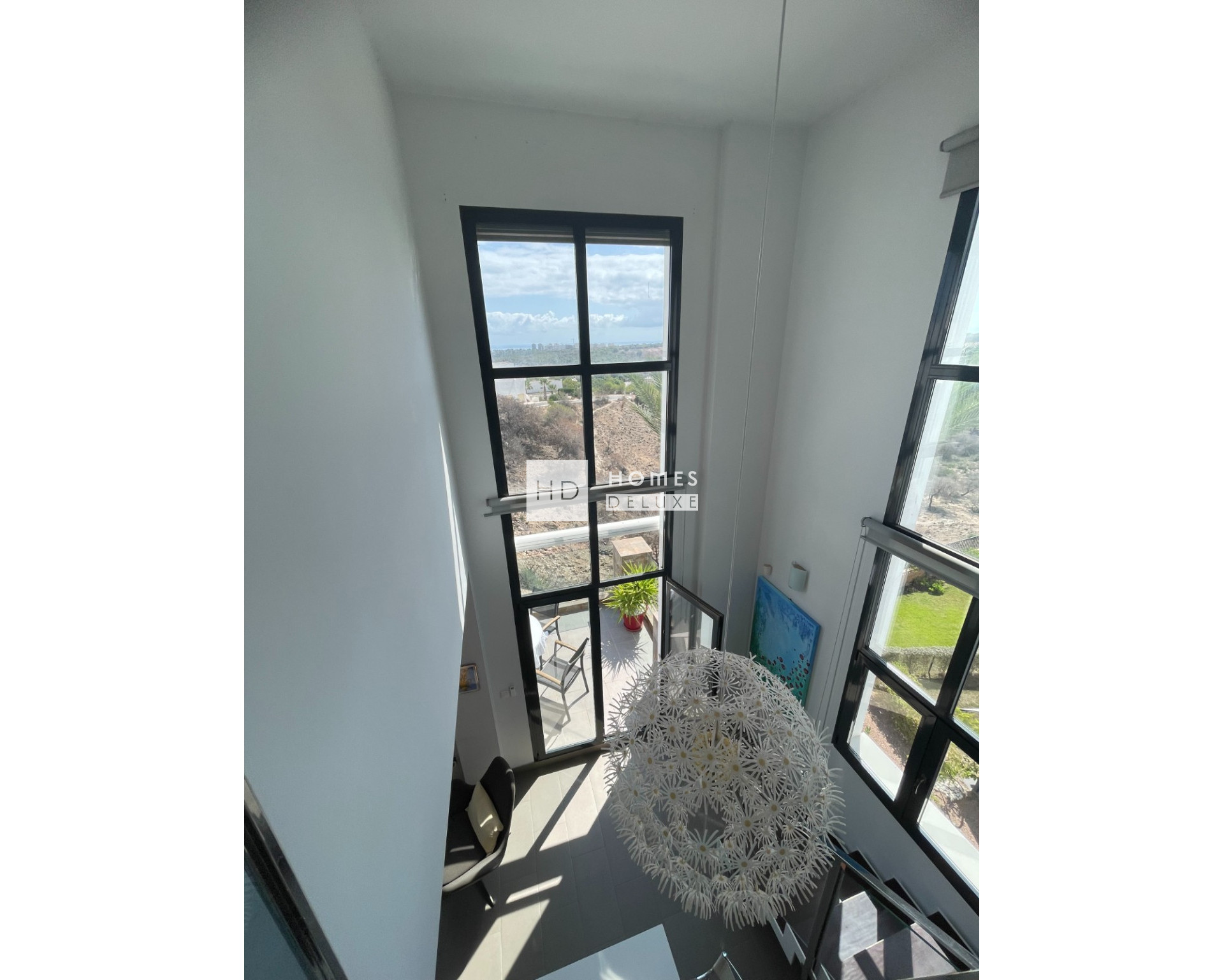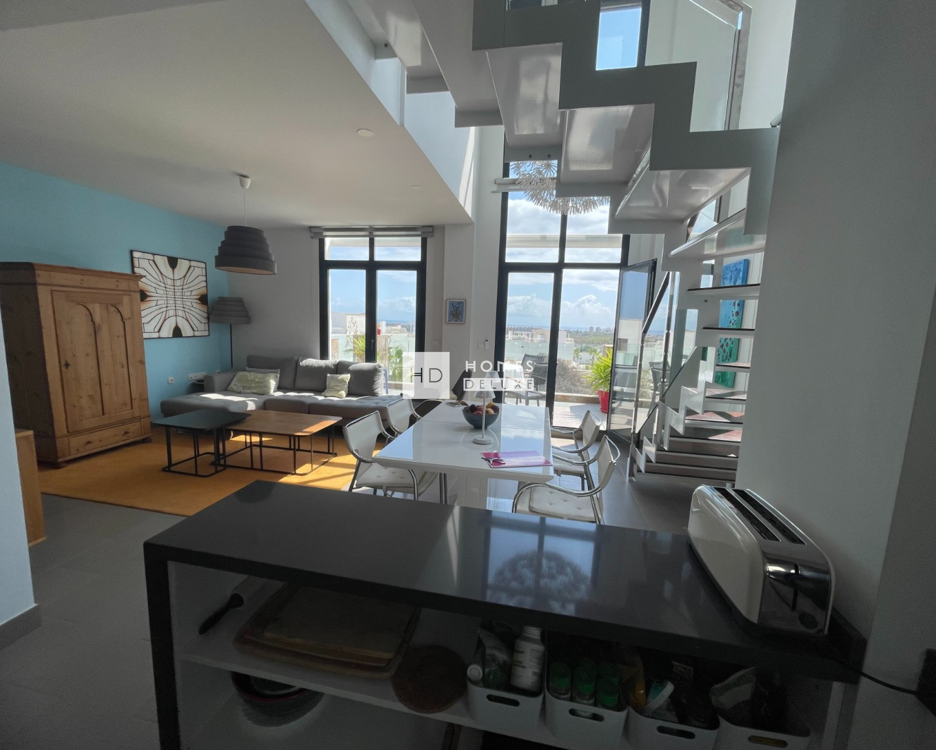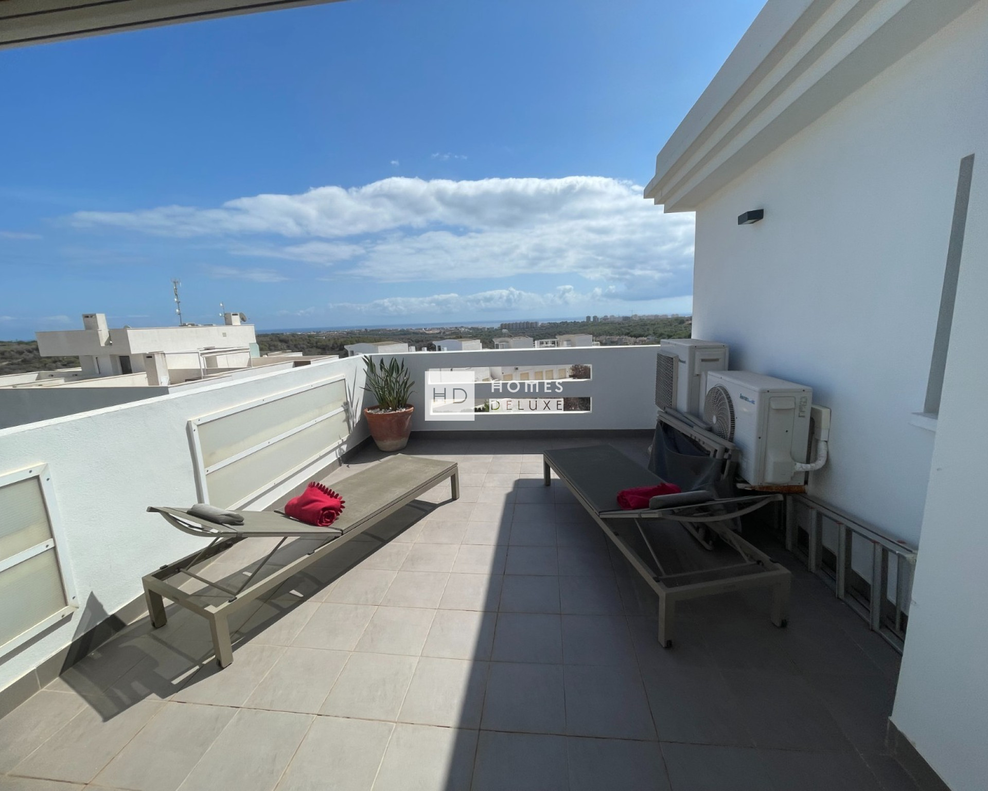 The property has a spacious build size of 97m2 and the interior layout comprises of an entrance hallway leading to the bright lounge and dining area with feature high ceilings and windows that maximise the natural light to flow through the space. The windows also open onto a 12m2 terrace with glass panels allowing you to take in the lovely open views. Within the main living space is a fully fitted American style kitchen finished in sleek white and grey tones. The ground floor level also has two good sized double bedrooms and a separate guest bathroom. The interior staircase leads you to the first floor level with the Primary bedroom and second bathroom. The penthouse also enjoys a large solarium of 79m2 with pergola adding to the exterior space with areas to chill out and enjoy the sunshine all day long as well as taking in the spectacular views of the surrounding green areas and the sea. The property is in excellent condition and is being sold fully furnished including air conditioning for maximum comfort.