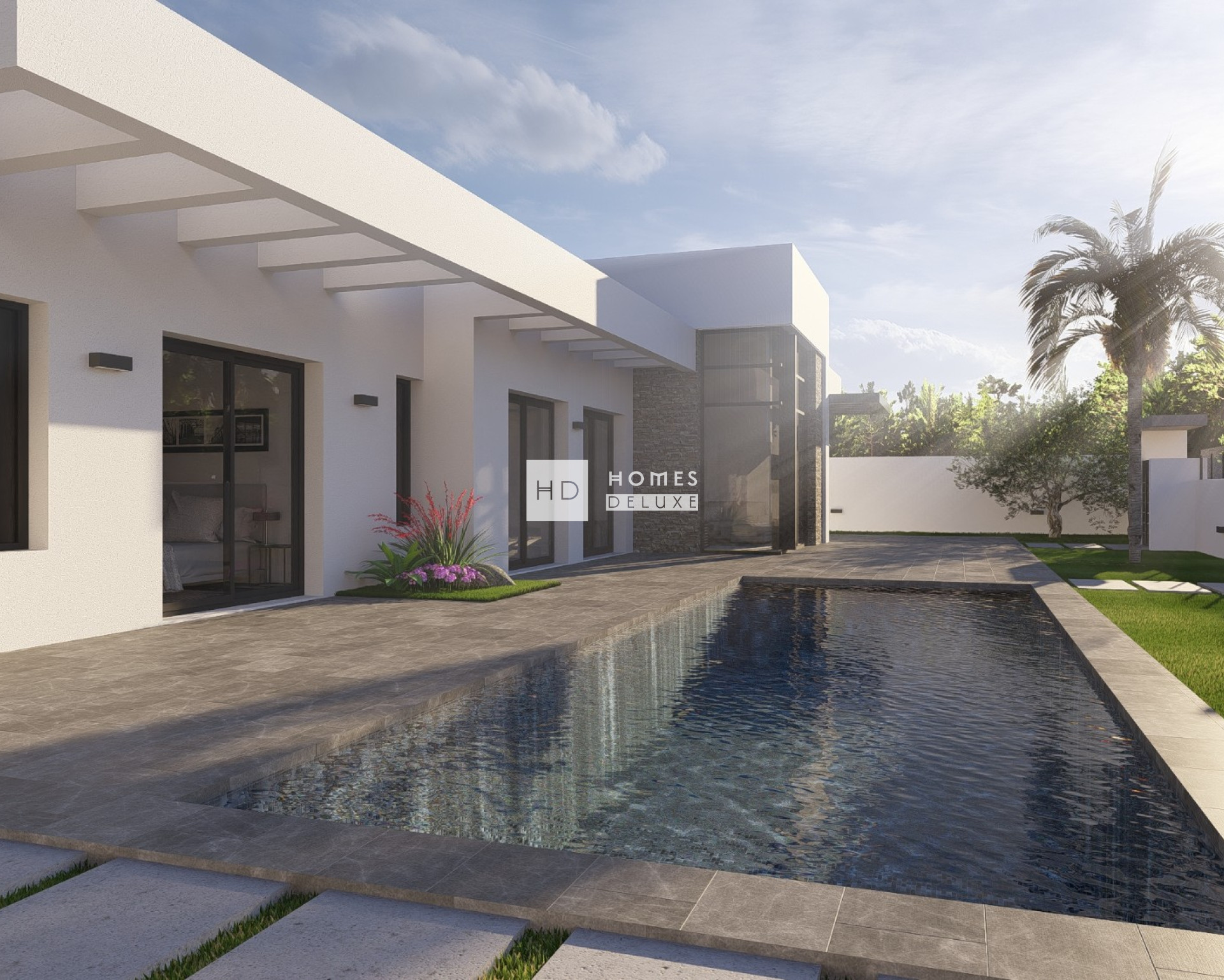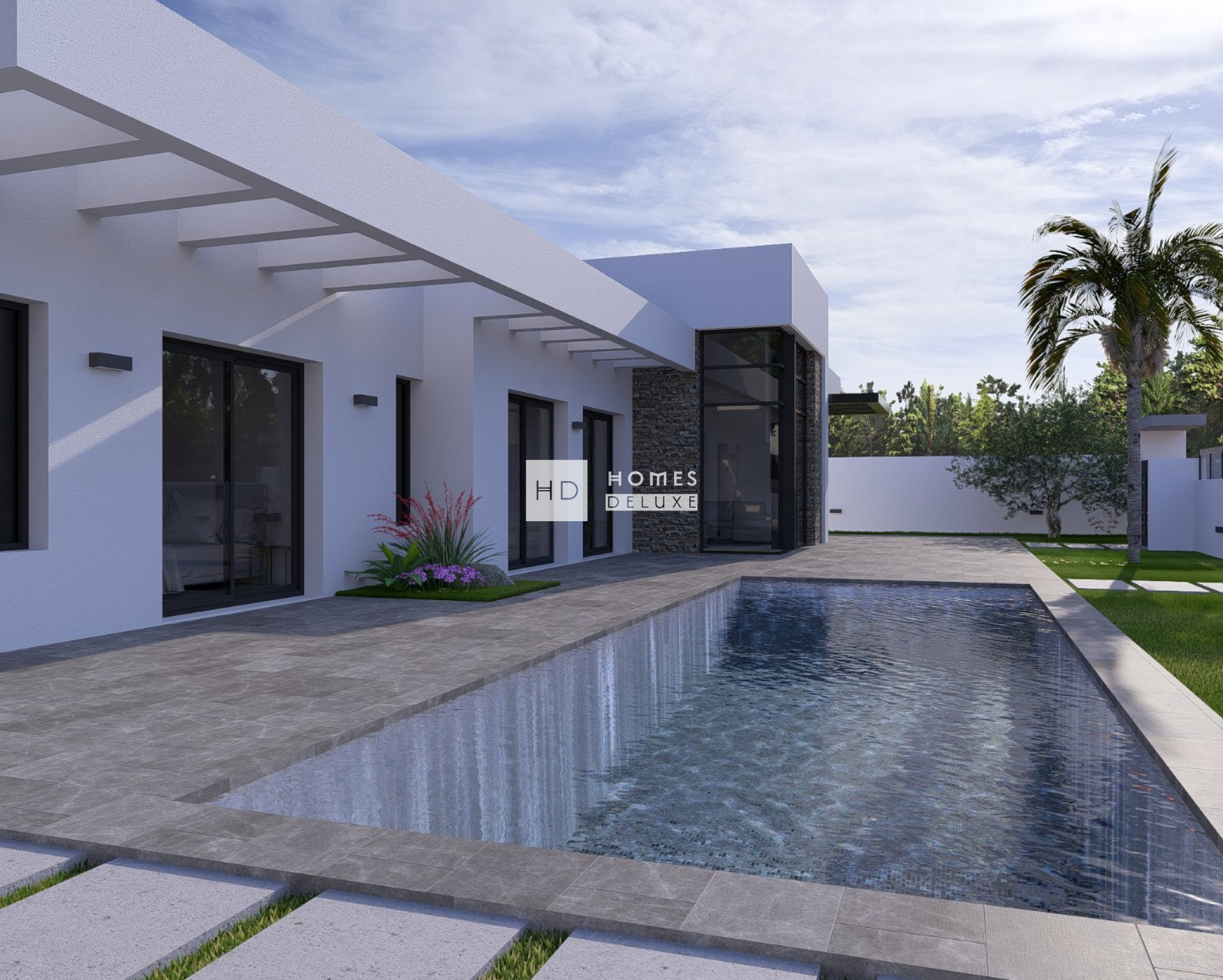 The house is delivered complete both inside and outside including air conditioning, underfloor heating in all bathrooms, kitchen electrical appliances, built in wardrobes in all bedrooms, interior and exterior LED lighting, garden finished with artificial grass and white gravel, private swimming pool with pre-installation for a heat pump, exterior shower and private garage.