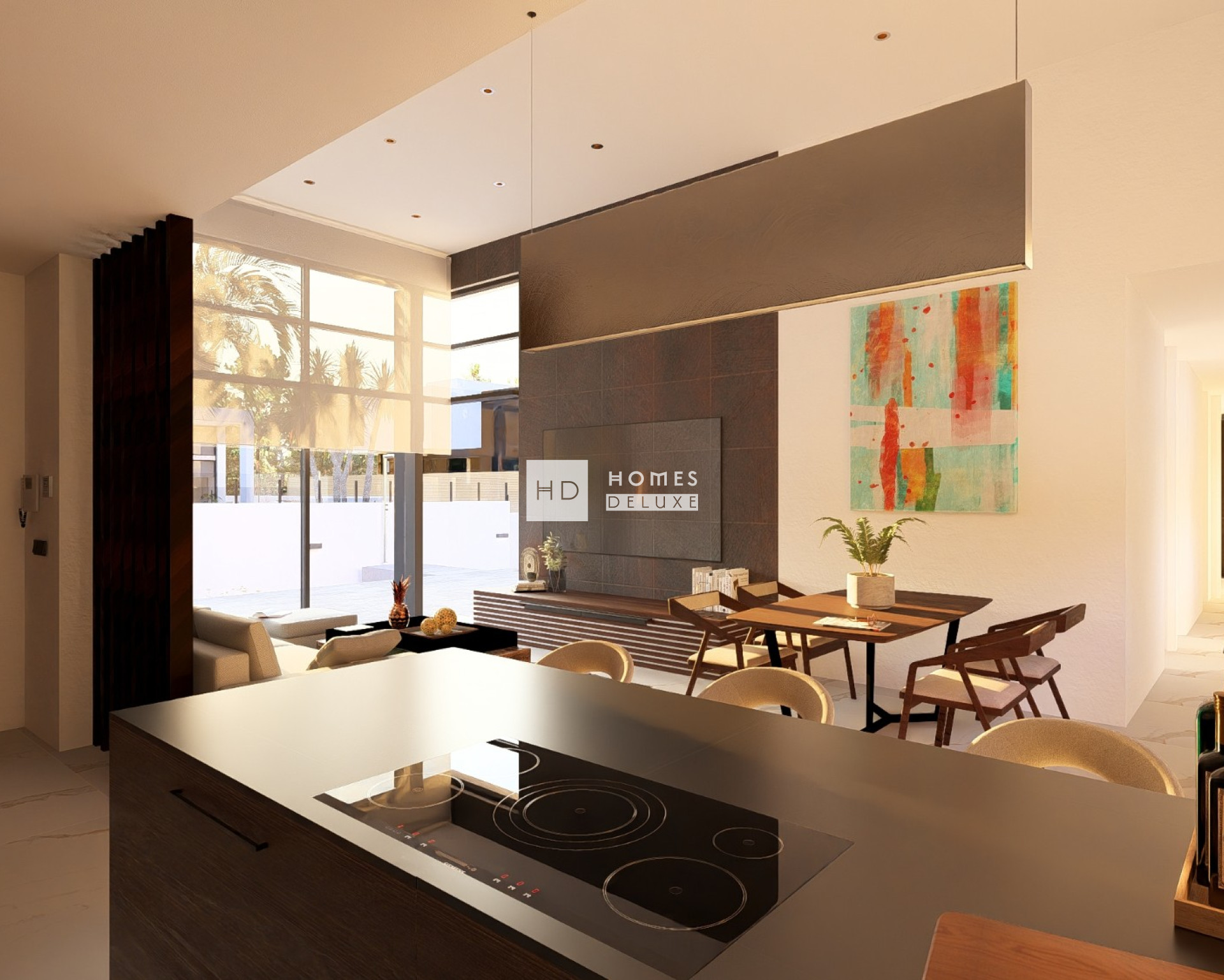 The interior layout comprises of an entrance hallway leading to the bright and spacious open plan lounge and dining area with feature high ceilings and large windows creating plenty of natural light and giving access to the exterior terrace. Within the main living area is a fully fitted American style kitchen with high and low cupboard space and a centre island. There is also a useful guest toilet located near the entrance door. The other side of the villa has the bedroom areas, including the stunning Primary suite boasting a large bedroom with en-suite bathroom. There are a further two good sized double bedrooms, all bedrooms have patio door access onto the main terrace, and there is a separate guest bathroom.