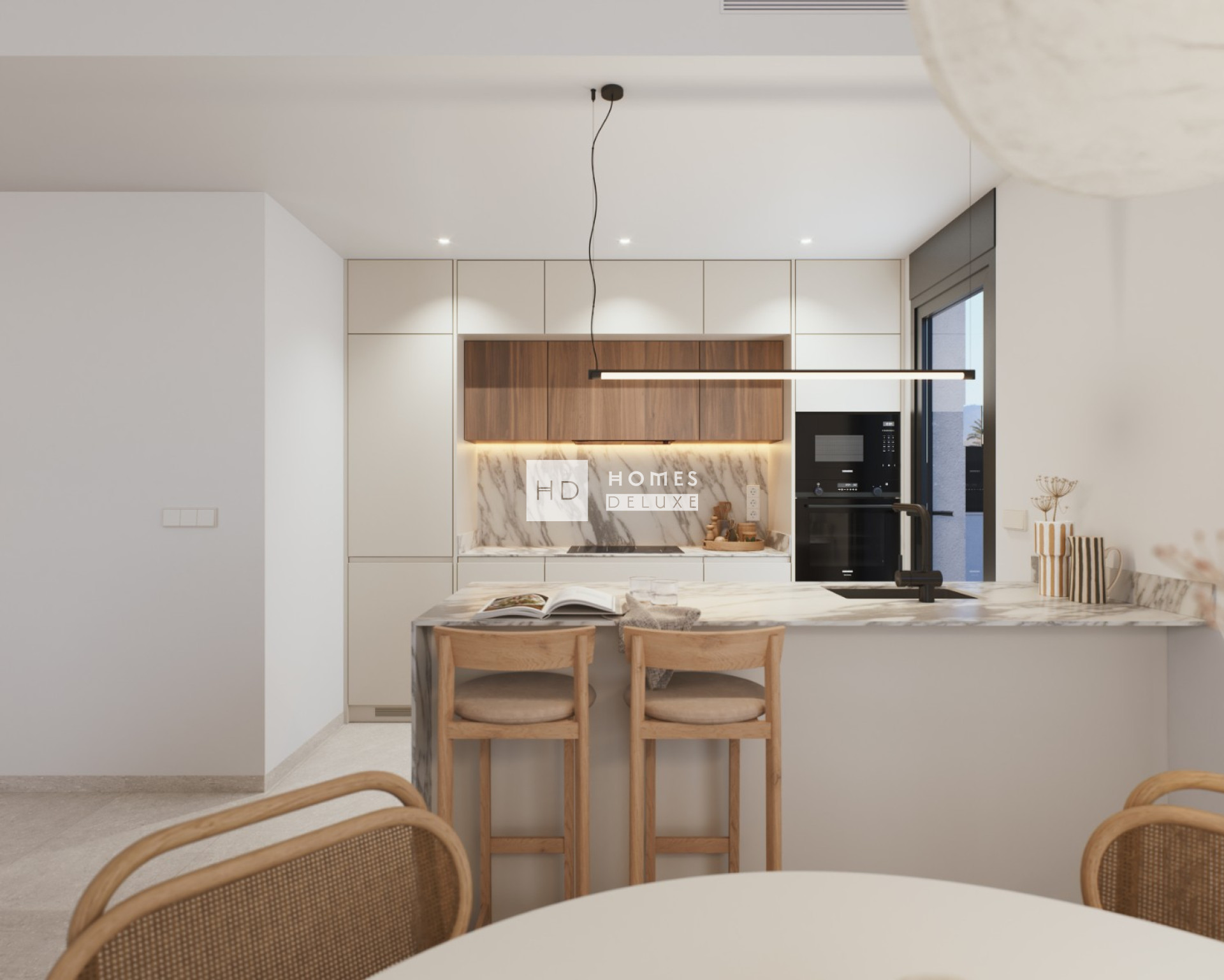 The properties are built to the highest standards and designed with a functional and beautiful contemporary style with feature stone walls. The villas are over two levels and also include a basement level as well as a large rooftop solarium. The interior layout comprises of a bright and spacious open plan lounge and dining area with large windows throughout allowing plenty of natural light to flow throughout the space and also overlooking the lovely private garden. Within the main living space is a fully fitted modern American style kitchen with designer kitchen units and a centre island. The kitchen also has an access door onto the terrace. The ground floor level also includes a good sized double bedroom and a bathroom with double door access from the bedroom or living area. The interior staircase leads you up to the first floor level with the impressive Primary bedroom with en-suite bathroom, walk in wardrobe / dressing area offering ample storage space. The Primary suite also has patio doors opening onto the wonderful sun terrace. There are a further two large double bedrooms both with en-suite bathrooms on the first floor. The villas boast a large basement level of 74m2 with an English patio allowing ventilation and natural lighting, this creates extra living space within the property to suit your needs and requirements.