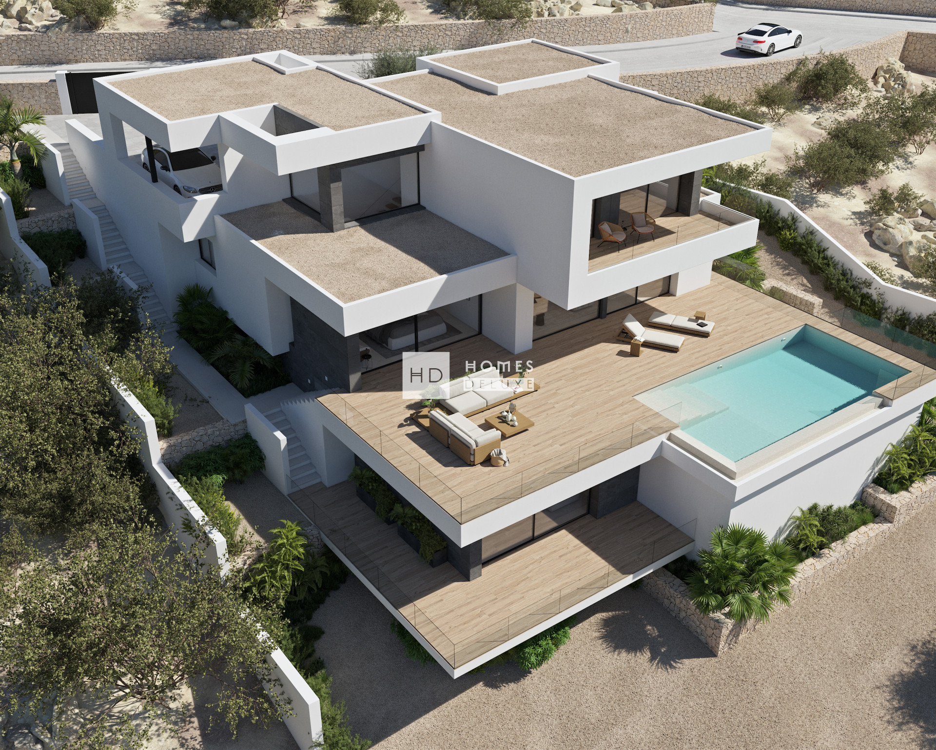 Villa Delfin is a luxurious, newly constructed residence located on the prestigious plot 137 of Residencial Jazmines, in the Cumbre del Sol estate. Its contemporary design features clean lines and cantilevered volumes, highlighting its spectacular elevated location, facing the sea, with unobstructed views extending from the Peñón de Ifach to the horizon. The highlight of Villa Delfin is its spacious main terrace, which surrounds a minimalist infinity pool, creating a visual effect that merges with the sea. This terrace offers a unique atmosphere both during the day and at night, providing a full panorama of the Mediterranean coast, the Calpe skyline, and the inland mountains. The porch and various outdoor spaces, including chill-out zones and outdoor dining areas, create a seamless connection between indoor and outdoor living. The house is designed on three levels: Top floor: The main entrance to the house is located on this level, which features three double bedrooms, all with en-suite bathrooms and built-in wardrobes. The master bedroom also includes a spacious dressing room and a private terrace overlooking the sea. Main floor: Features the daytime living areas, including a spacious open-plan living-dining room and a fully equipped kitchen with a central island. This space is directly connected to the terrace and the pool, enhancing brightness and a sense of connection with the surroundings. Also on this same level there is a courtesy toilet and a pantry next to the kitchen. Basement: A versatile space with an extra living room, a full bathroom, and a spacious open area perfect for a gym, home theatre, office, or other customisable uses. Villa Delfin ensures privacy and convenience with both vehicle and pedestrian access from the rear of the property. It features a spacious outdoor parking area and a secure garage with a motorised door, capable of accommodating several vehicles. From this level, a private staircase and a lift provide easy access to the main floor and the other levels of the house. The house is constructed using high-quality materials and finishes, including: Large-format porcelain floor and wall tiling. A fully equipped kitchen with built-in appliances from premium brands. Aluminium exterior carpentry with thermal break and safety glass. Recessed LED lighting and pre-installation for a home automation system. Underfloor heating and ducted air conditioning with an aerothermal system. A completed garden featuring Mediterranean plants and an automatic irrigation system.