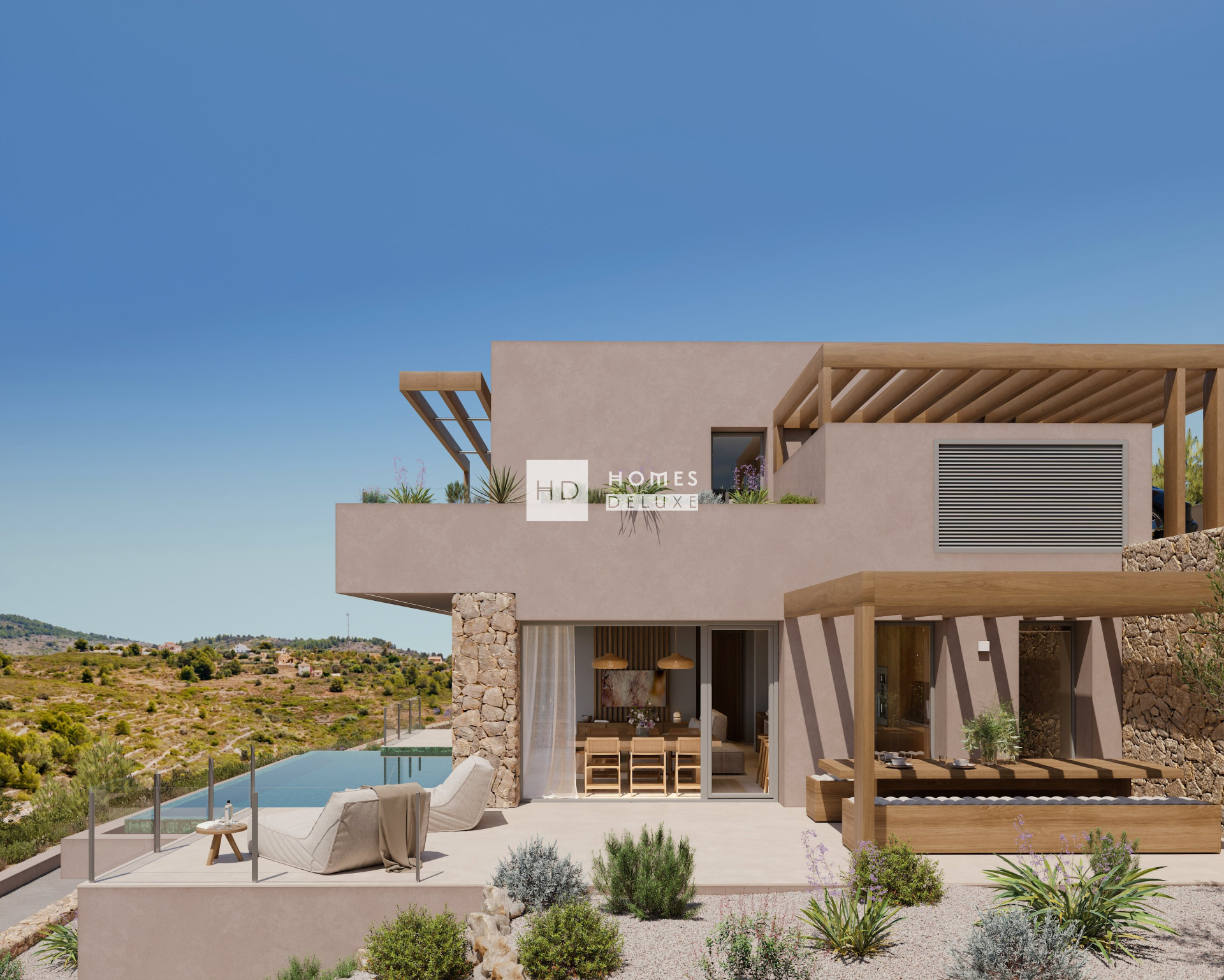 Discover Elements EcoResidences in Llíber, at the very heart of the Vall de Pop — a development that transcends architecture to offer a lifestyle in complete harmony with nature. Set amidst rolling mountains, lush vineyards, and villages steeped in tradition, this exclusive residential enclave reimagines Mediterranean living with a modern, sustainable approach, seamlessly blending with the breathtaking landscape. From its very foundations, the infrastructure has been designed using innovative and efficient techniques, aimed at creating a responsible and enduring environment. At Elements, every corner is crafted to enhance well-being and foster a sense of community: a social club with a restaurant, spa, and gym; community gardens that connect residents with the earth; outdoor sports facilities; and green spaces that invite you to enjoy fresh air and tranquillity. Within this setting, the Airen Collection emerges — the first phase of the project, featuring villas that perfectly blend authenticity, warmth, and modernity. The Airen A model is designed for those seeking ultimate comfort in everyday living. The main floor brings together all the essentials: a spacious living-dining area opening onto the terrace and pool, an open-plan designer kitchen, and a master bedroom with an en-suite bathroom. Upstairs, two additional bedrooms feature private terraces framing stunning valley views, ideal for family or guests. Outside, the experience is completed with a private pool, terraced gardens, and sun-soaked terraces that seamlessly integrate the home into the Mediterranean landscape. All of this is complemented by features that ensure both comfort and sustainability: aerothermal heating, underfloor heating, photovoltaic panels, a ventilation system with heat recovery, home automation, and an electric car charger. Airen A is more than a house — it is a home where every day is lived in harmony with nature, in an environment that invites you to savour the authentic.