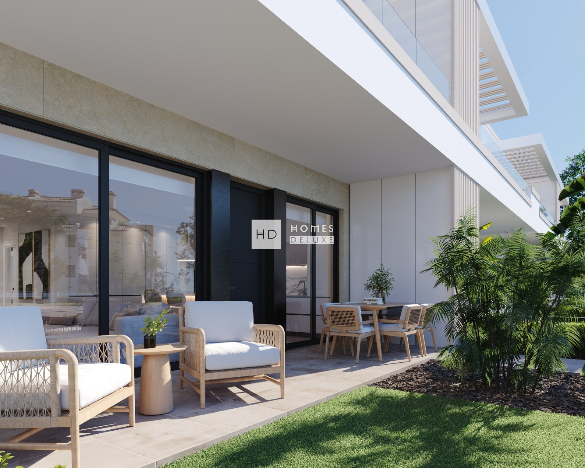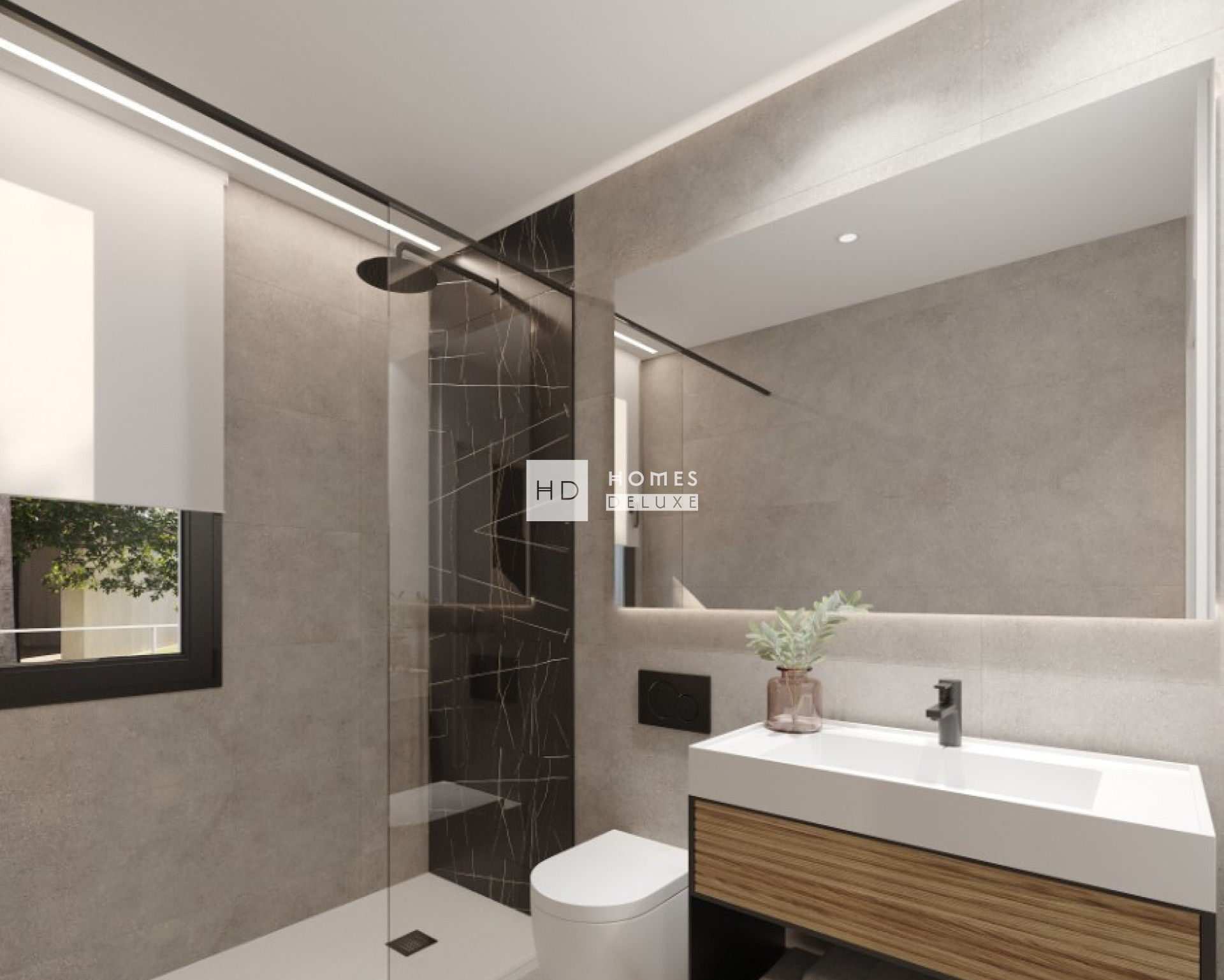 The complex consists of five apartment blocks with eight apartments per block, ground floor apartments (3 bedrooms 2 bathrooms) with a private garden, first and second floor apartments (2 bedrooms 2 bathrooms) with a spacious terrace, and penthouses (3 bedrooms 2 bathrooms) and a large rooftop solarium of 56m2. There are six blocks of the bungalow style apartments all with 2 bedrooms and 2 bathrooms each with a private garden (ground floor) or a rooftop solarium (top floor). All with refined architecture, premium finishes, and the superior construction standards, ensuring the maximum comfort for the owners.