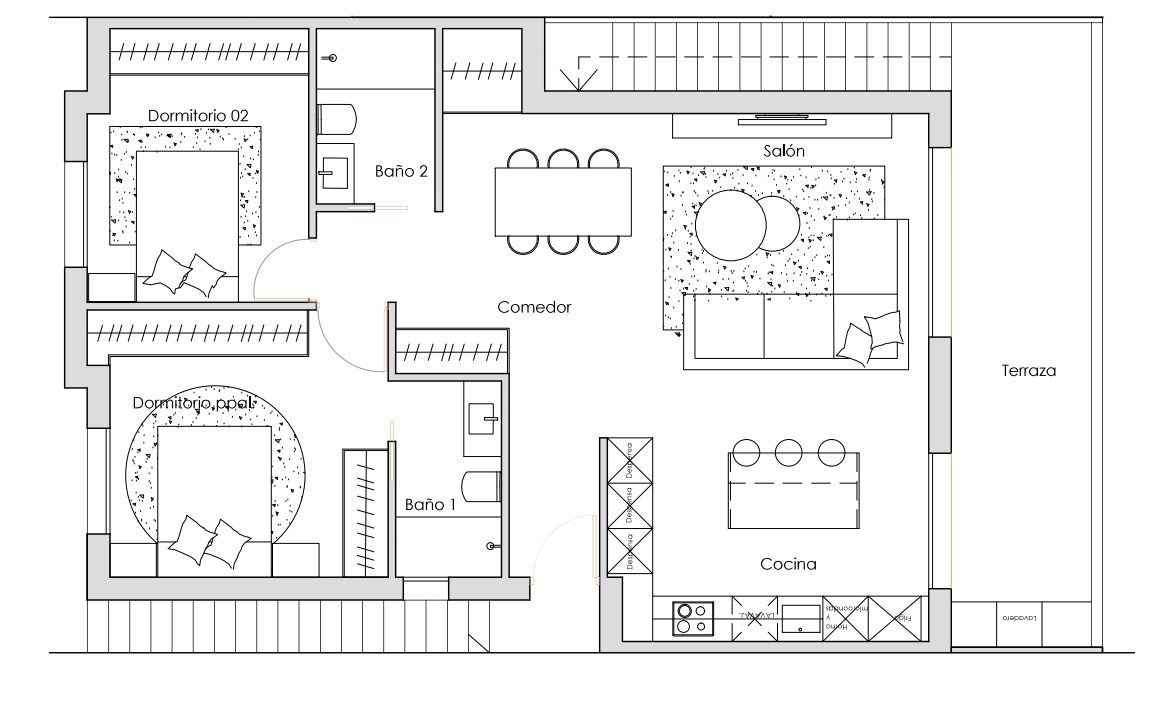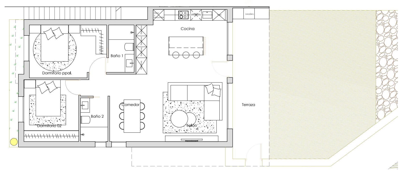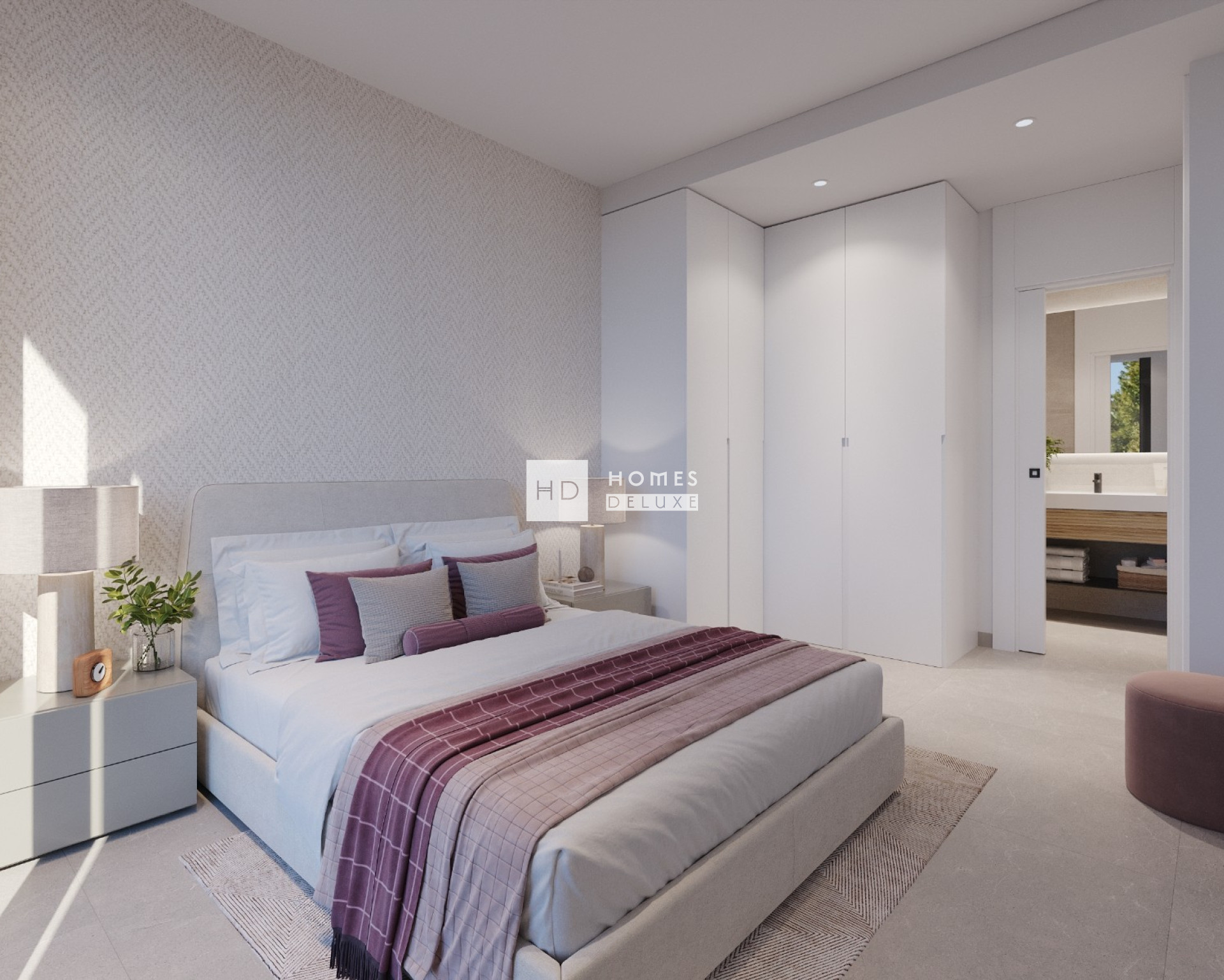 This particular design is the bungalow style apartments, and the interior layout comprises of a spacious open plan lounge and dining area with large windows allowing plenty of natural light to flow throughout the living space as well as giving access to the terrace area. Within the main living space is a sleek modern American style kitchen with centre island. The large Primary bedroom includes an en-suite bathroom, there is another good sized double bedroom, all bedrooms include ample storage space with built in wardrobes, and there is also a separate guest bathroom. The top floor apartments have an exterior staircase on the terrace leading up to the extensive rooftop solarium to enjoy the sun all day long. The project is within a gated community and the residents have the enjoyment of the beautiful communal gardens and large inviting swimming pool, the perfect area to relax and unwind in the glorious sunshine. All the properties include a private parking space, and a storage room.