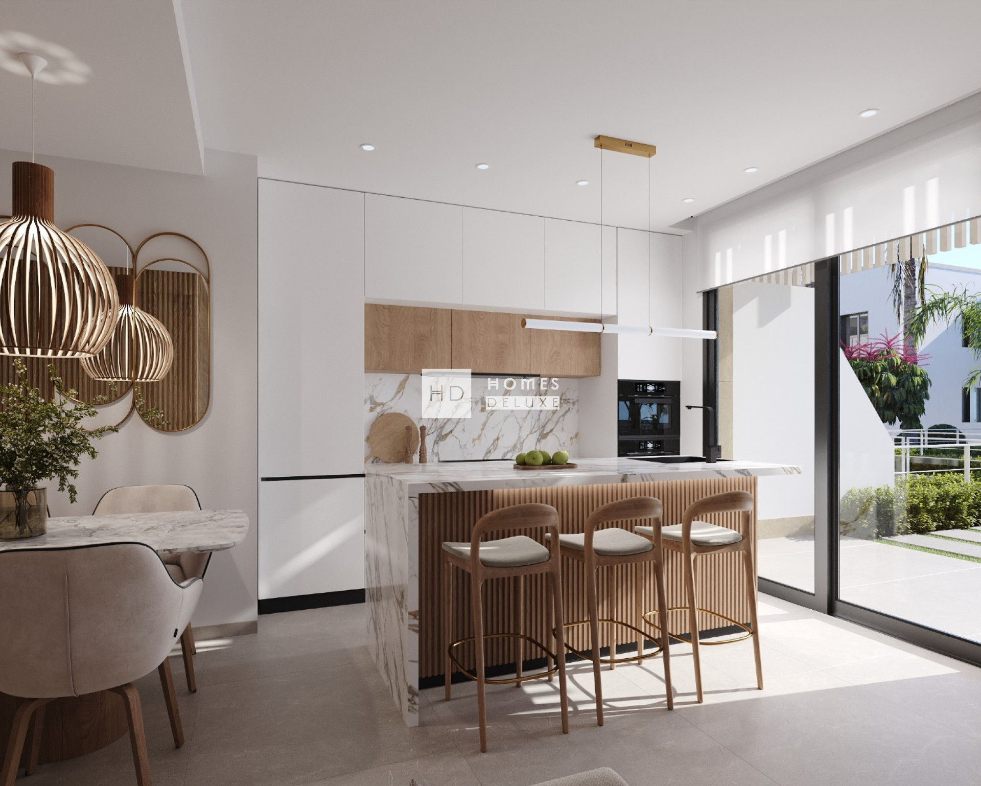 The complex consists of five apartment blocks with eight apartments per block, ground floor apartments (3 bedrooms 2 bathrooms) with a private garden, first and second floor apartments (2 bedrooms 2 bathrooms) with a spacious terrace, and penthouses (3 bedrooms 2 bathrooms) and a large rooftop solarium of 56m2. There are six blocks of the bungalow style apartments all with 2 bedrooms and 2 bathrooms each with a private garden (ground floor) or a rooftop solarium (top floor). All with refined architecture, premium finishes, and the superior construction standards, ensuring the maximum comfort for the owners.
