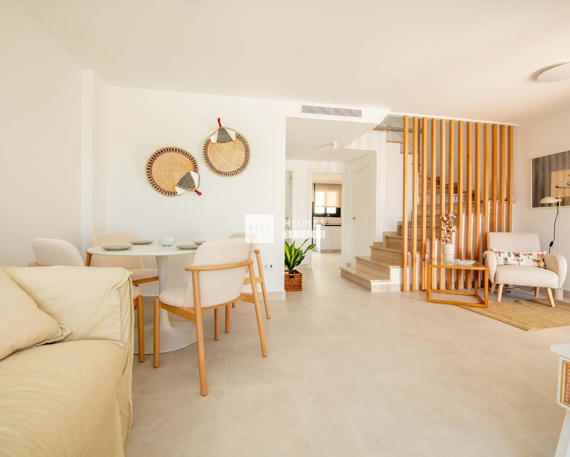 This particular model is the townhouse option and the property is over two levels with a rooftop solarium. The interior layouts comprise of a spacious open plan lounge and dining area with large windows overlooking the private garden. The independent kitchen includes lower and upper cupboard space and there is an access door to the rear patio of 12m2 where you have a laundry area. The ground floor level also includes a good sized double bedroom and a separate guest bathroom. The interior staircase leads you to the first floor level with the large Primary bedroom with patio doors opening onto a private terrace at the front of the property. There is another double bedroom and a family bathroom. The first floor also has access to a 12m2 terrace at the rear of the property which has an exterior staircase leading up to the extensive rooftop solarium of 32m2 including a Summer kitchen, perfect to enjoy al-fresco dining in the sun all day long.
