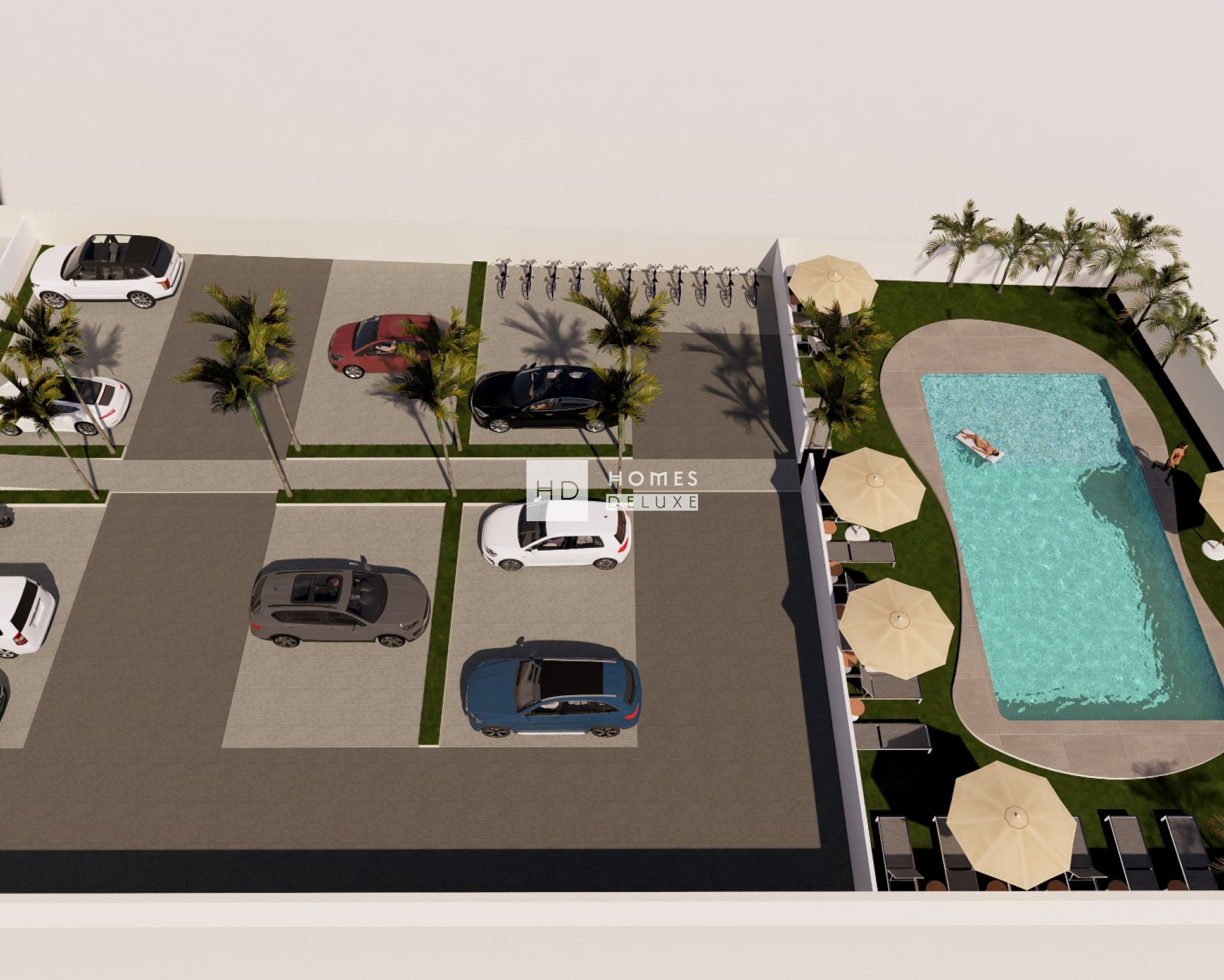 The interior layouts comprise of an entrance hallway leading to the spacious open plan lounge and dining area with large windows which open onto the private terrace. Within the main living space is a fully fitted modern American style kitchen in a white lacquered finish with glass doors. The large Primary bedroom includes an en-suite bathroom, there are a further two good sized double bedrooms and a separate guest bathroom. The penthouse options have an interior staircase leading up to the extensive rooftop solarium expanding the outdoor space further. The properties come including pre-installation for ducted air conditioning, kitchen electrical appliances (oven, hob, extractor fan, microwave, and fridge-freezer), built in wardrobes in all bedrooms, and private outdoor parking.