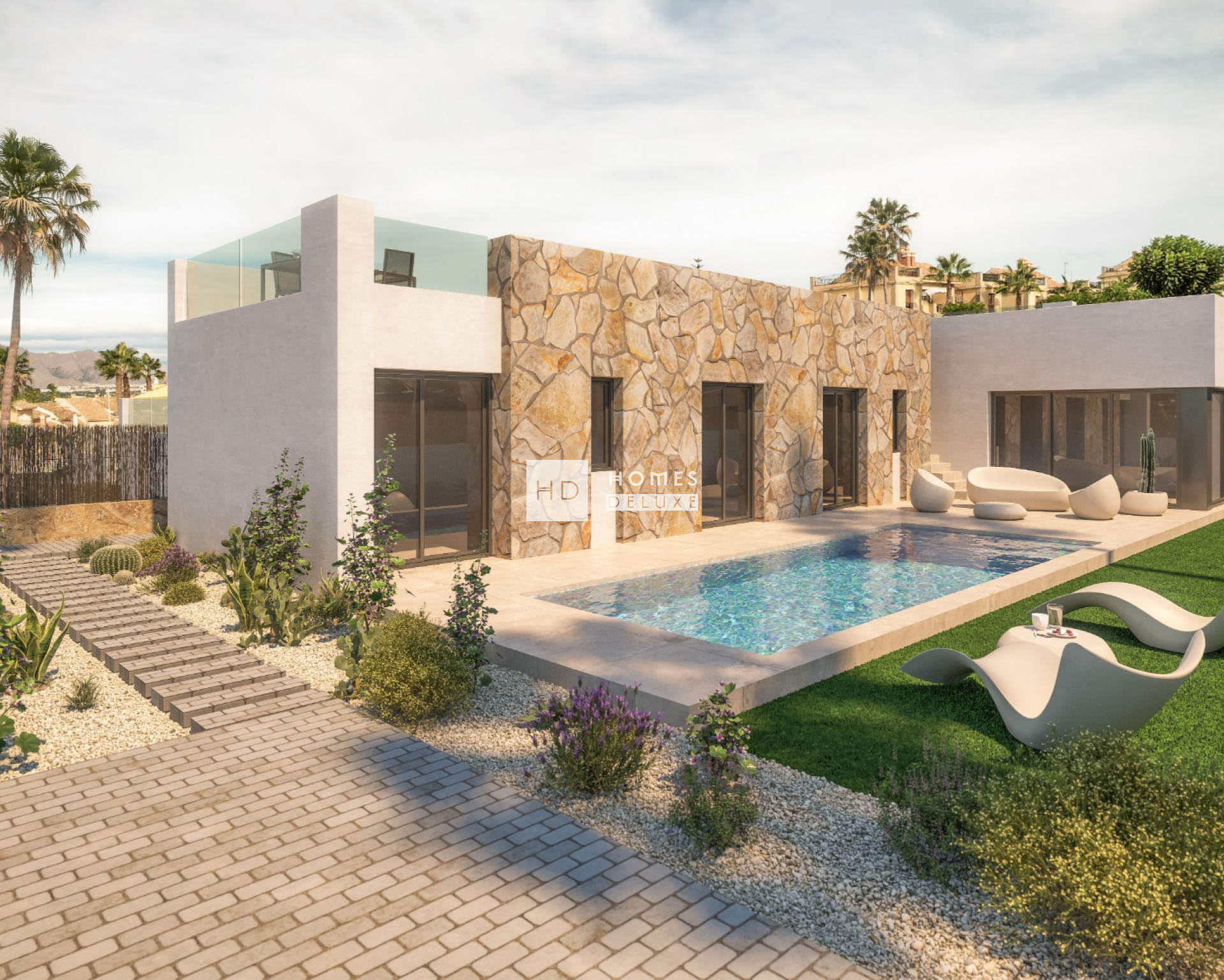 Discover this exclusive complex of villas which are built to the highest standards with all the latest modern equipment and including a private swimming pool, parking space and landscaped garden. Detached villas all on one level offering 3 bedrooms 2 bathrooms, designed to enjoy a natural and privileged environment. The design combines modern lines with traditional elements such as stone on the facade, adding the warmth of traditional construction. The properties make the most of outdoor living in Spain with a large private garden and terrace with the 8 x 3m private swimming pool being the focal point. Extending the outdoor space further is the extensive rooftop solarium of 61m2.