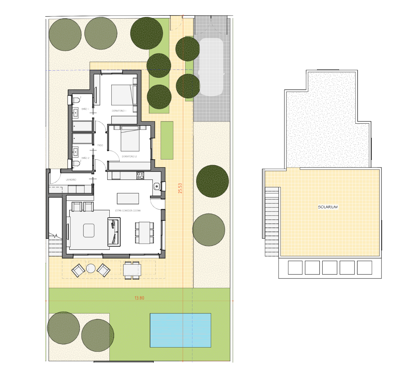 The properties make the most of outdoor living with a large private garden and terrace area which are perfect to relax by the inviting private swimming pool. Extending the exterior space further is the extensive rooftop solarium to enjoy the sun all day long. The villas are all on one level and the interior layouts comprise of a bright and spacious open plan lounge and dining area with large windows throughout the space creating plenty of natural light as well as opening onto the terrace and garden. Within the main living space is a stylish American style kitchen with centre island as well as a useful separate laundry room. The large Primary bedroom includes an en-suite bathroom. There is also another good sized double bedroom and a separate guest bathroom. An exterior staircase at the side of the property leads you up to the rooftop solarium of 53m2.
