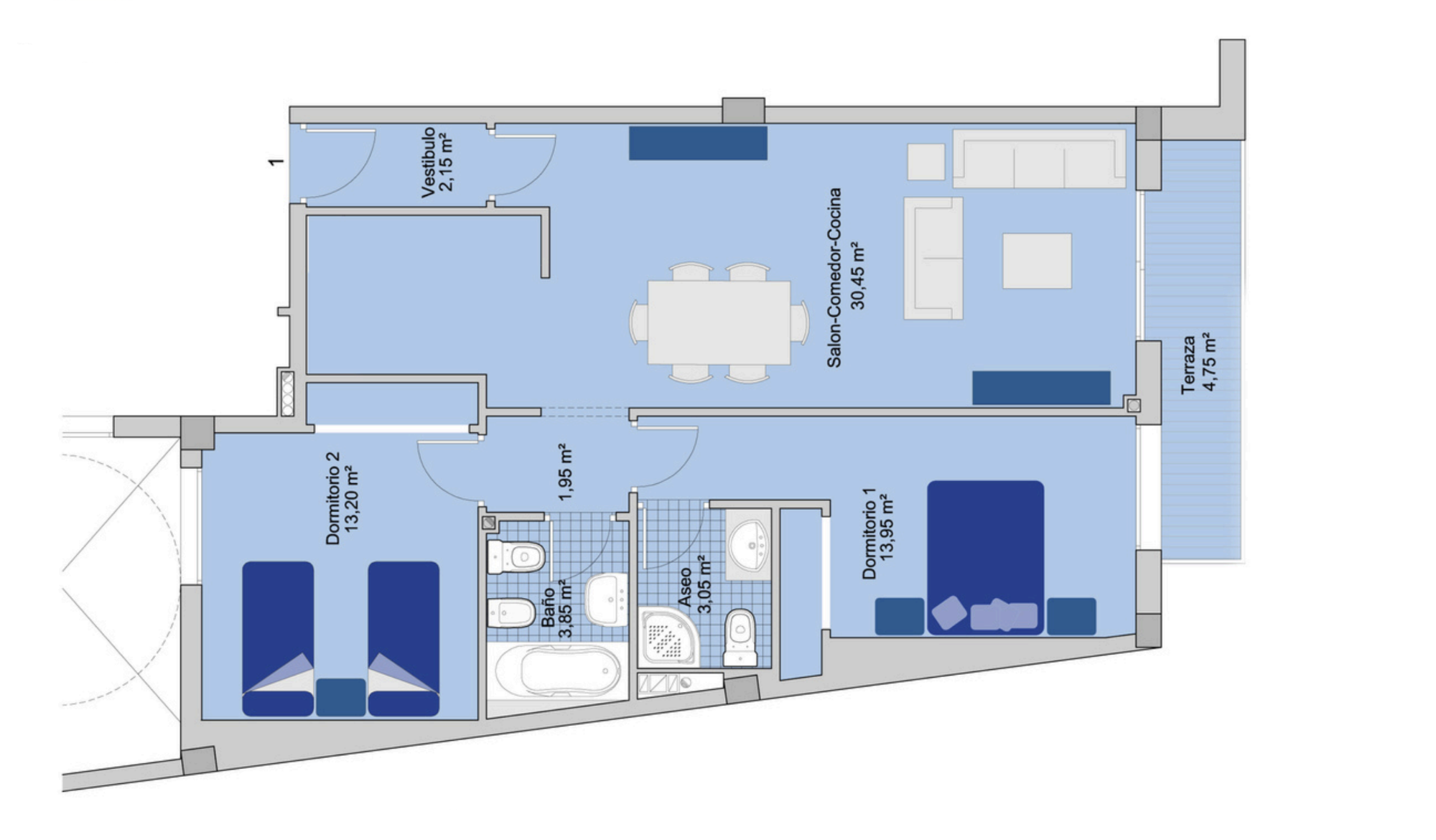 The interior layout comprises of an entrance hallway leading to the spacious open plan lounge and dining area with an independent kitchen area. The large Primary bedroom includes an en-suite bathroom and has patio doors opening onto the 5m2 terrace as well as from the lounge area. There is another good sized double bedroom and a separate guest bathroom. The property comes including pre-installation for ducted air conditioning, built in wardrobes in all bedrooms, a private parking space in the underground garage, and 2 storage rooms.