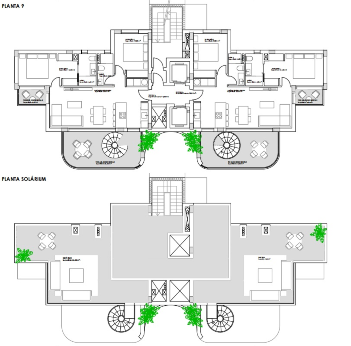 The interior layouts comprise of a bright and spacious open plan lounge and dining area with large windows opening onto the ample terrace of approximately 20m2. Within the main living space is a fully fitted modern American style kitchen including high and low cupboards with centre island. The large Primary bedroom boasts an en-suite bathroom, dressing area and a private terrace. There is another good sized double bedroom and a separate guest bathroom. The penthouse apartments access their extensive private rooftop solarium via an exterior spiral staircase on their terrace where you can enjoy the sun all day long and take in the amazing open views. The properties come including pre-installation for ducted air conditioning, kitchen electrical appliances, built in wardrobes in all bedrooms, underground parking and storage room.