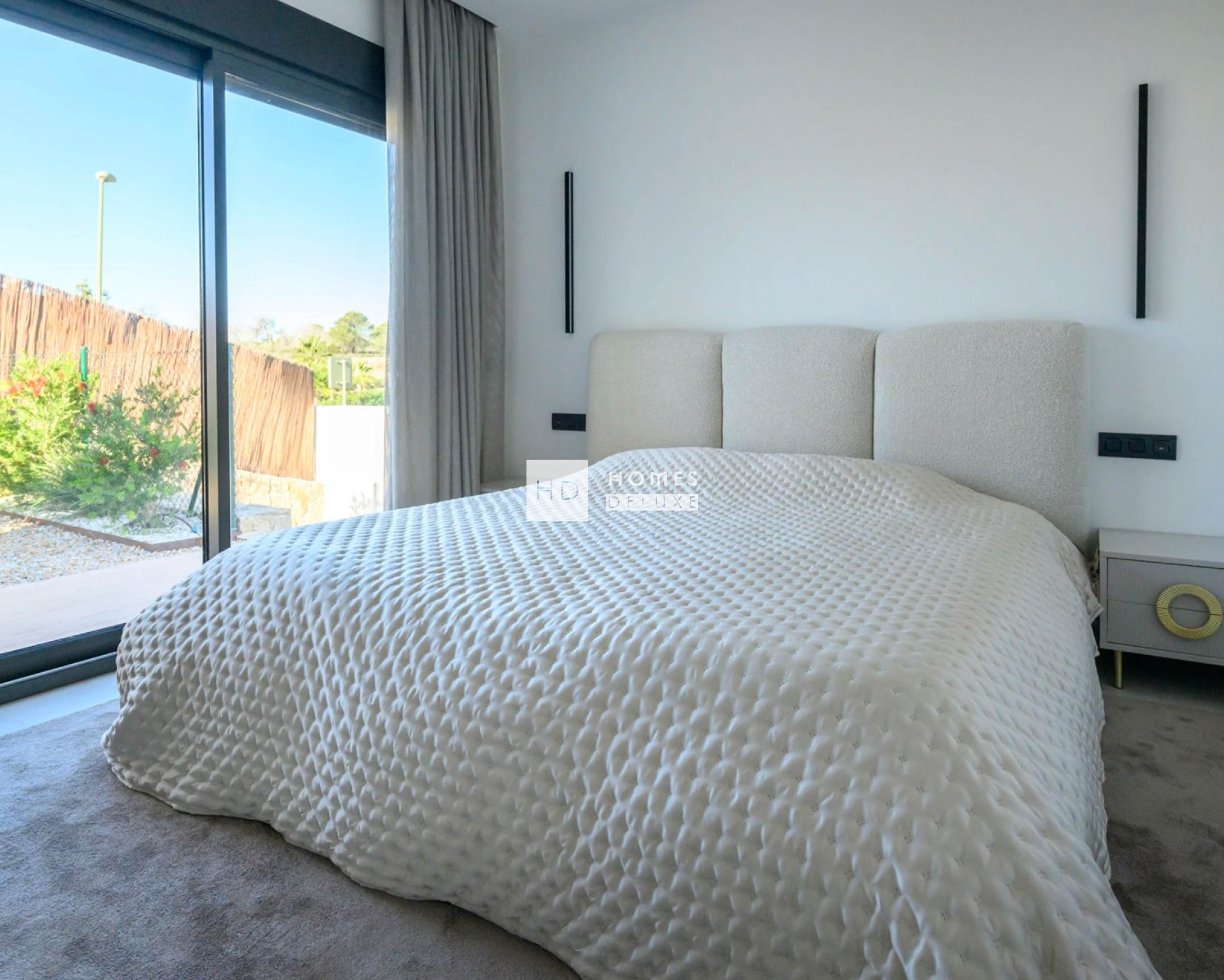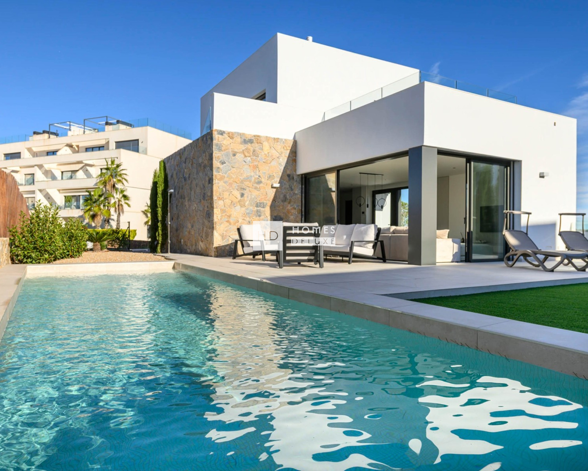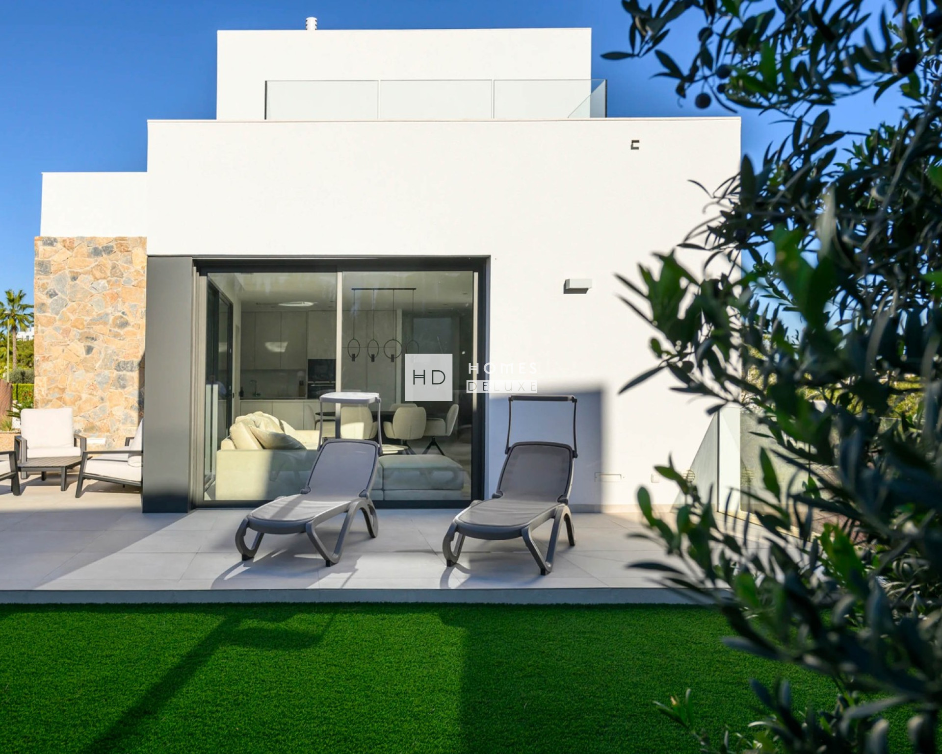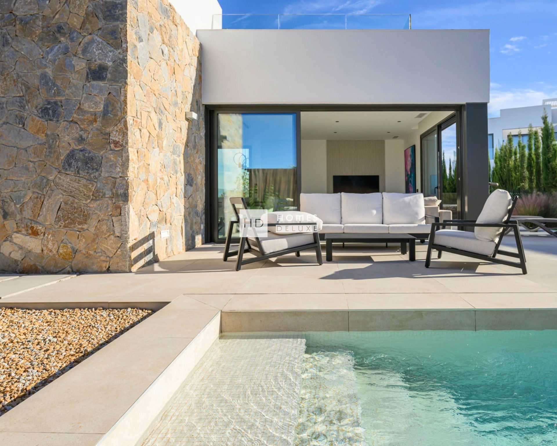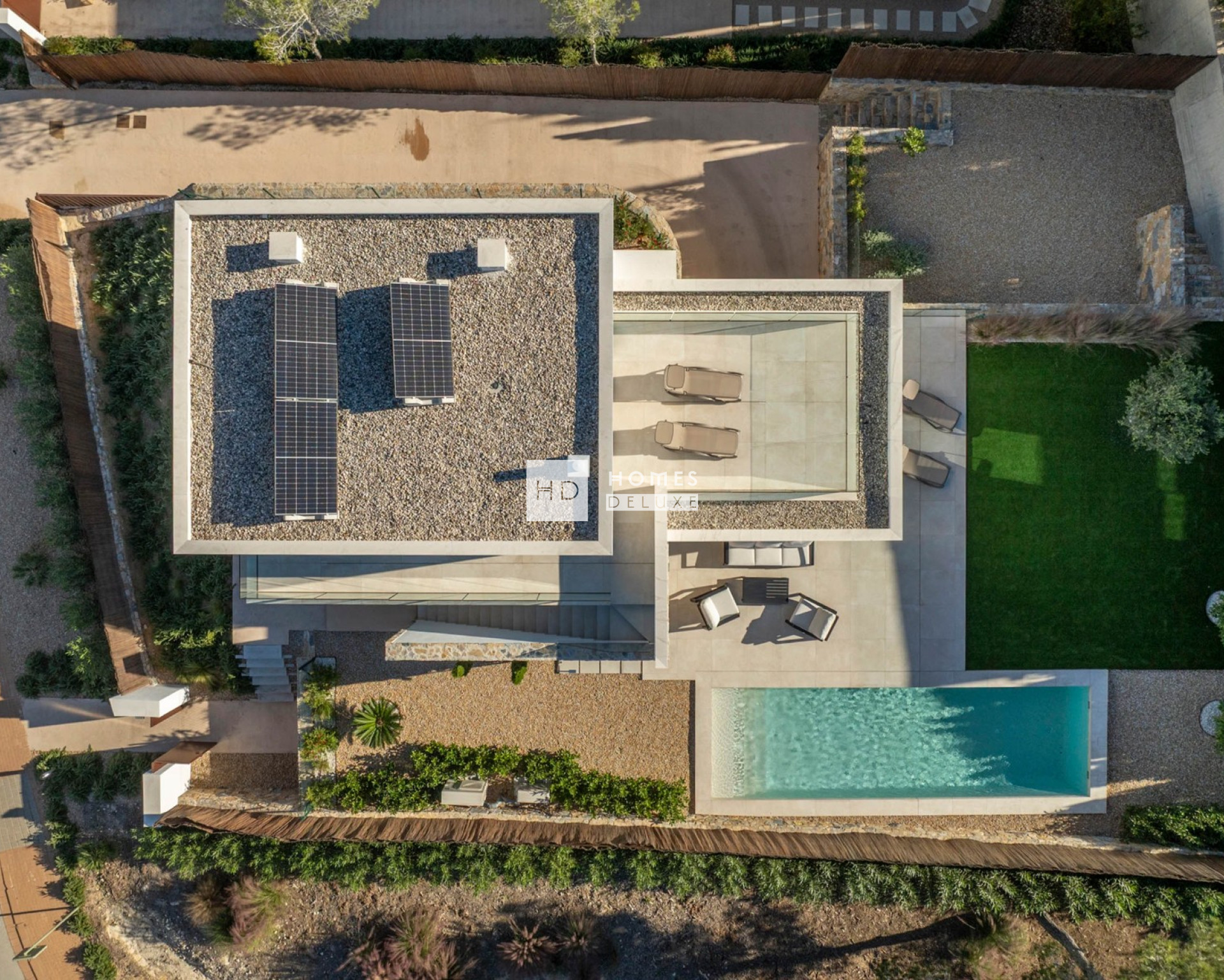 Modern detached Villa with 3 bedrooms and private pool situated in community Orquidea in Las Colinas Golf. Available fully furnished, build on two levels with spacious terraces and open views. Huge garage/basement and perfect orientation for the winter sun.