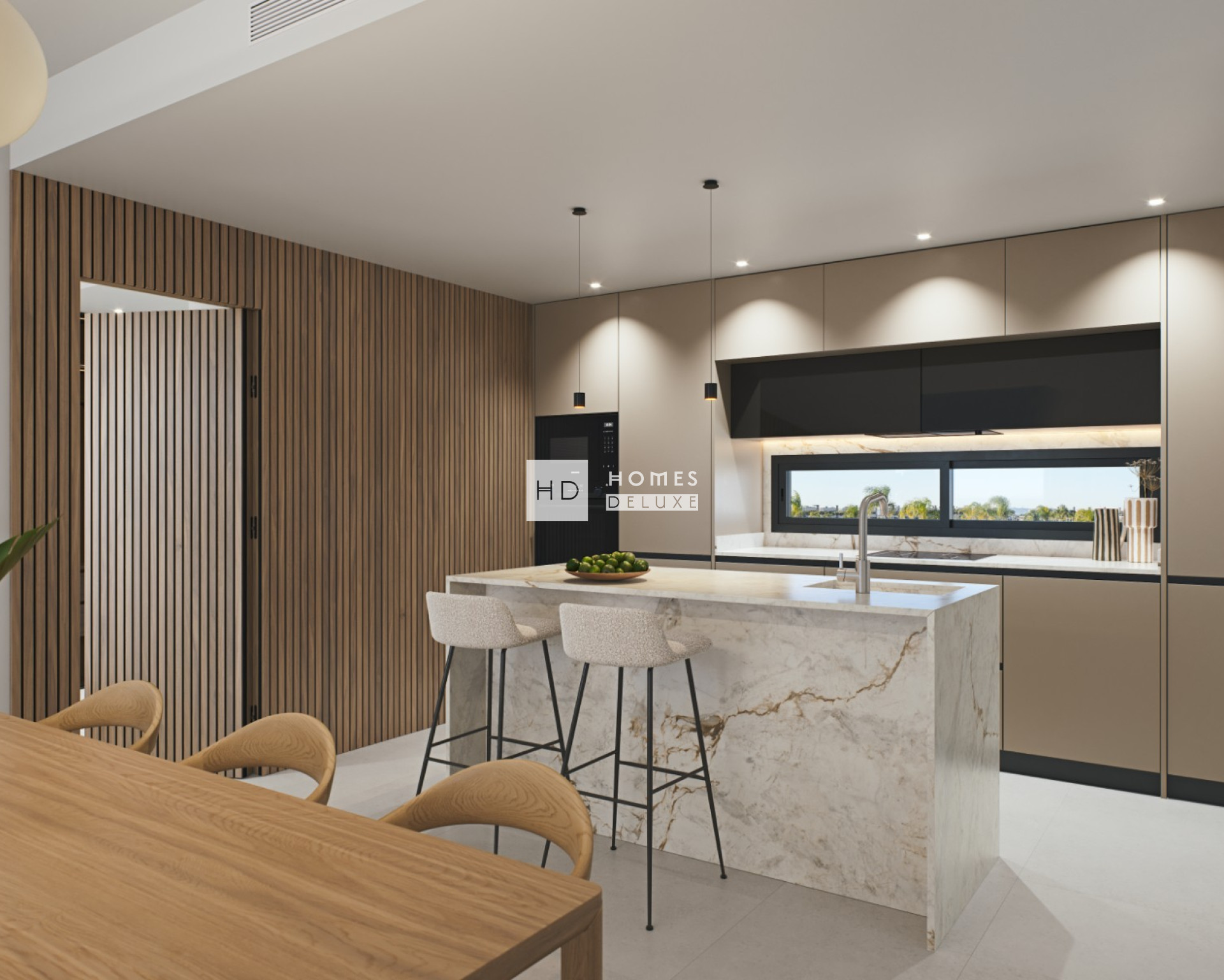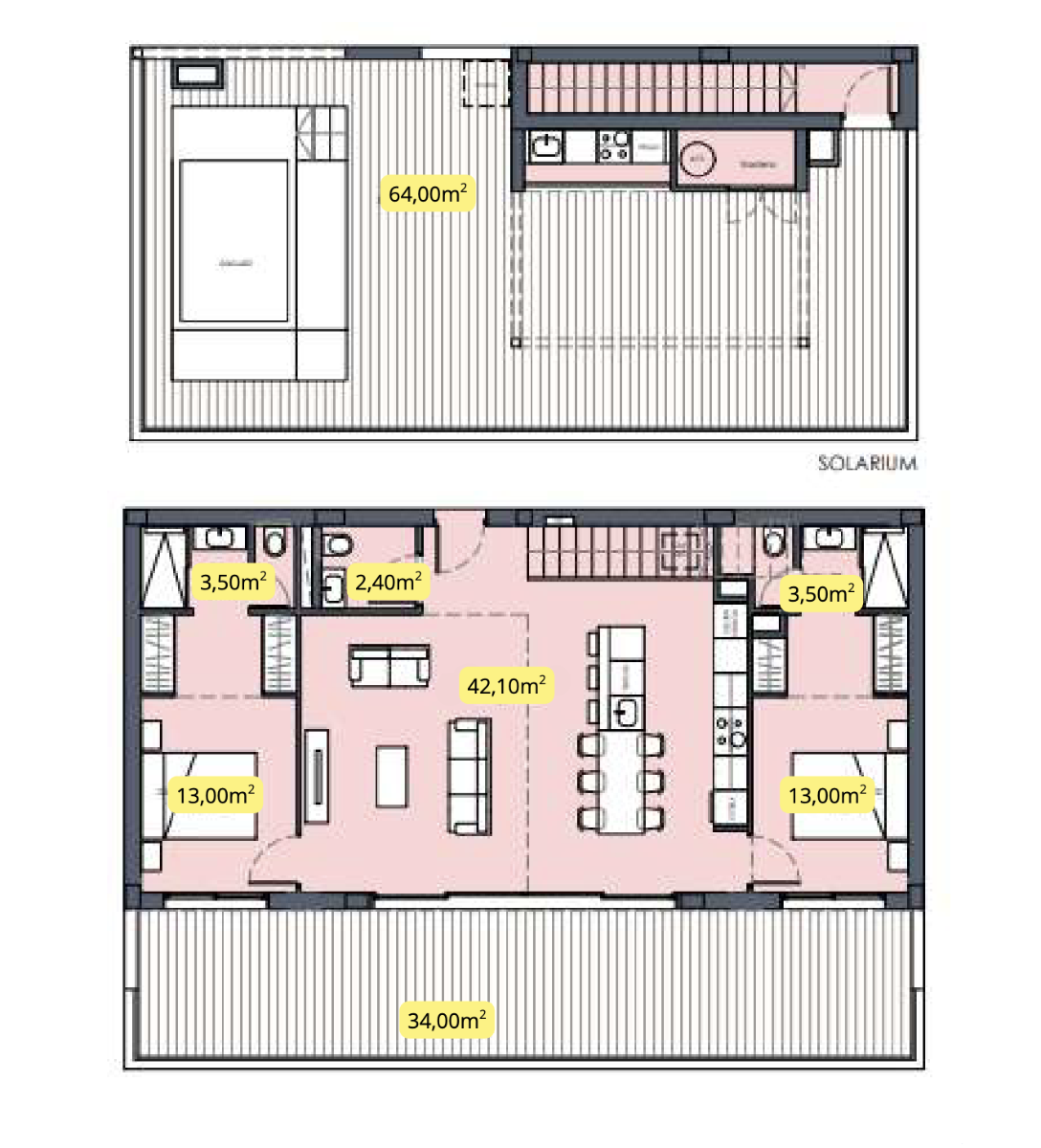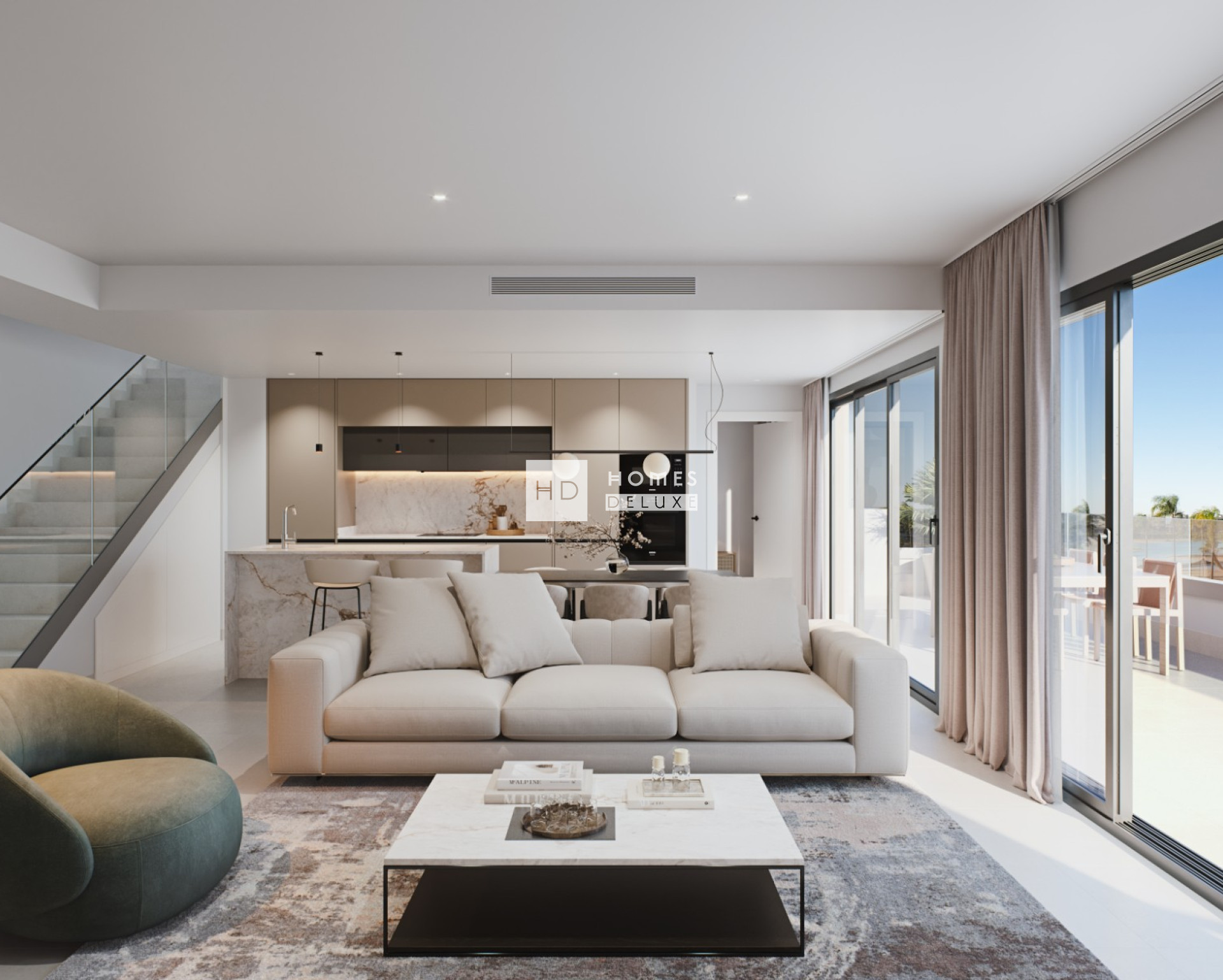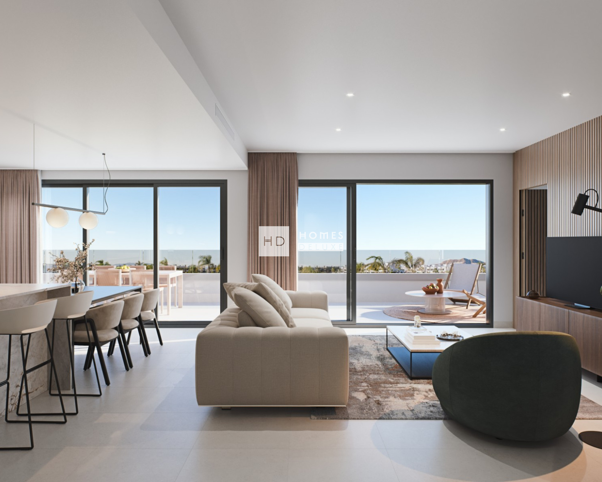 The interior layouts comprise of an entrance hallway leading to the spacious open plan living space with a bright lounge and dining area with large patio windows opening onto the terrace. Within the main living area is a fully fitted American style kitchen with a large storage capacity and a centre island. The impressive Primary bedroom includes an en-suite bathroom and dressing area. There is another good sized double bedroom that also has an en-suite bathroom and dressing area. The penthouses have either an interior or exterior staircase leading up to the extensive rooftop solarium of 64m2 (2 bedrooms) or 75m2 (3 bedrooms) to enjoy the sun all day long. The rooftop solariums boast stunning open views and make the most of outdoor living with a private swimming pool and large chill out area with a Summer kitchen.