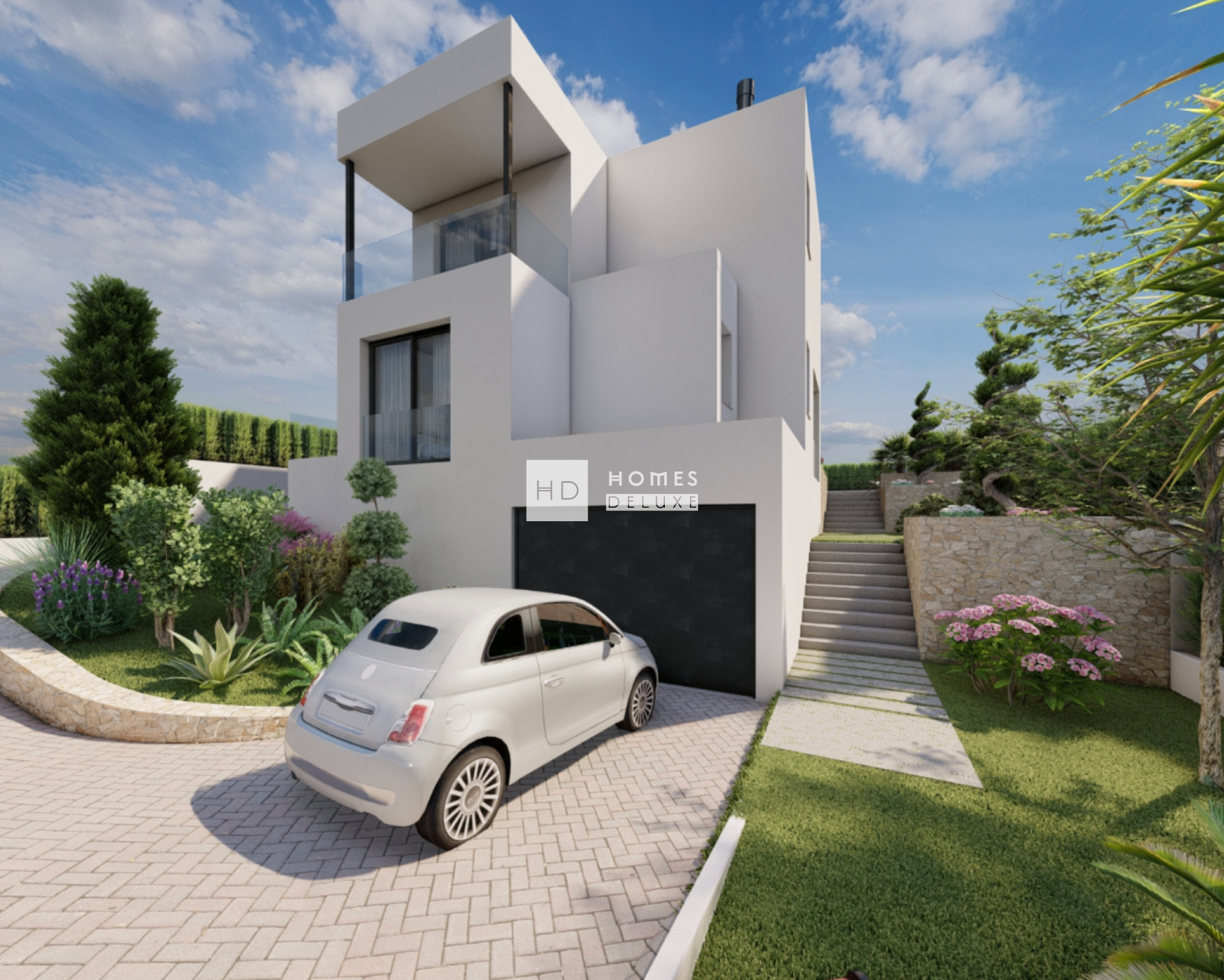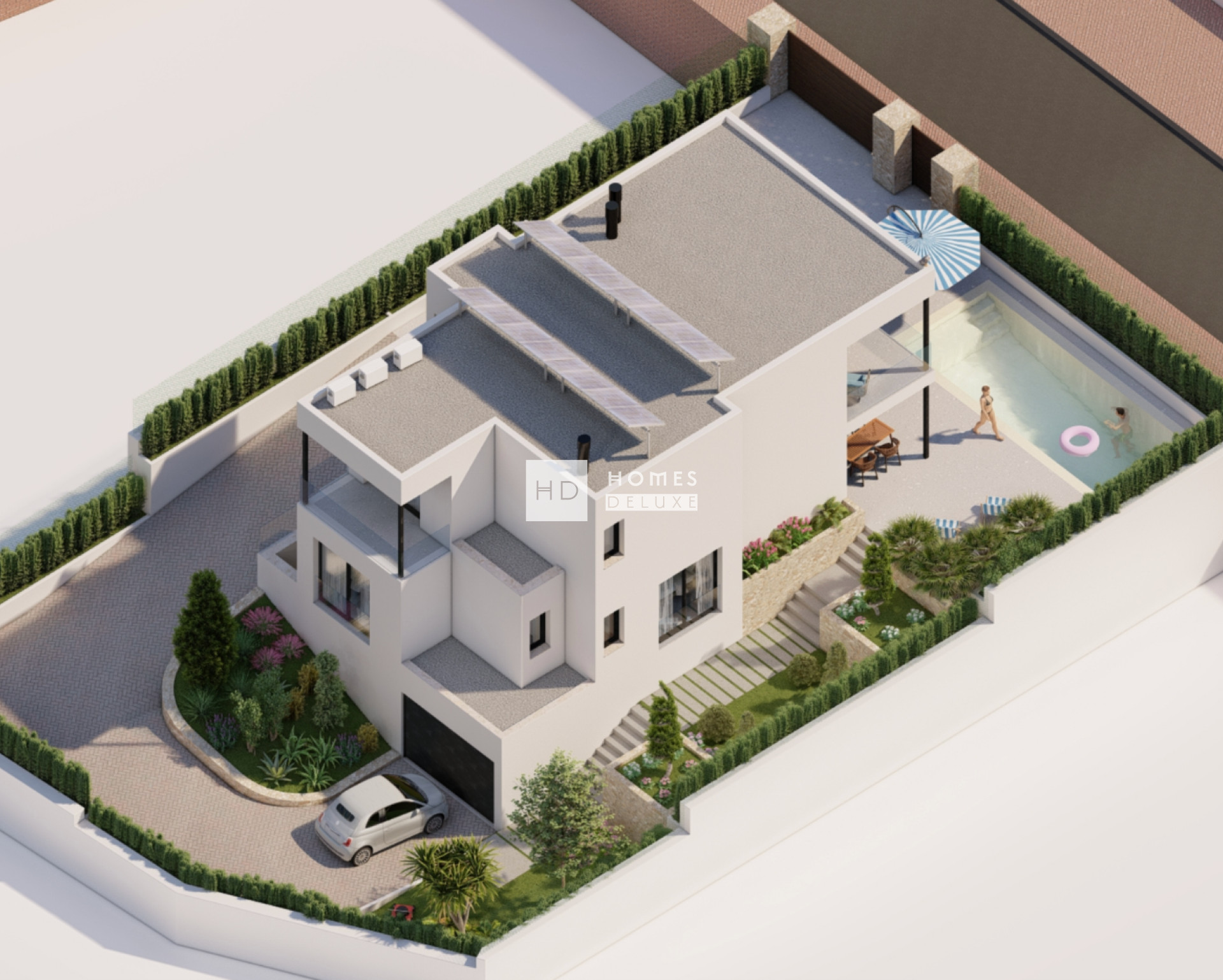 This particular villa project offers a stunning 5 bedroom 5.5 bathroom property over two levels with an additional basement level where you have a private garage. The interior layout comprises of an entrance hallway leading to the bright and spacious open plan lounge and dining area with feature heigh ceilings and large windows opening onto the exterior terrace. Within the main living space is a large kitchen with ample storage and worktop space, and there is also a useful guest toilet. The ground floor level also includes two good sized double bedrooms both with en-suite bathrooms. The interior staircase leads you to the first floor level the impressive Primary suite with large bedroom, en-suite bathroom and extra large dressing area. The Primary suite also enjoys its own private terrace. The first floor level also includes another bedroom suite with en-suite bathroom, dressing area, and access to its own private terrace. The basement level of the property extends the living space further with another double bedroom and a separate guest bathroom, which is useful for larger families or when guests come to stay. The basement level has natural light and ventilation from the feature English patio, and also has direct access to the spacious garage for two vehicles and a storage room.