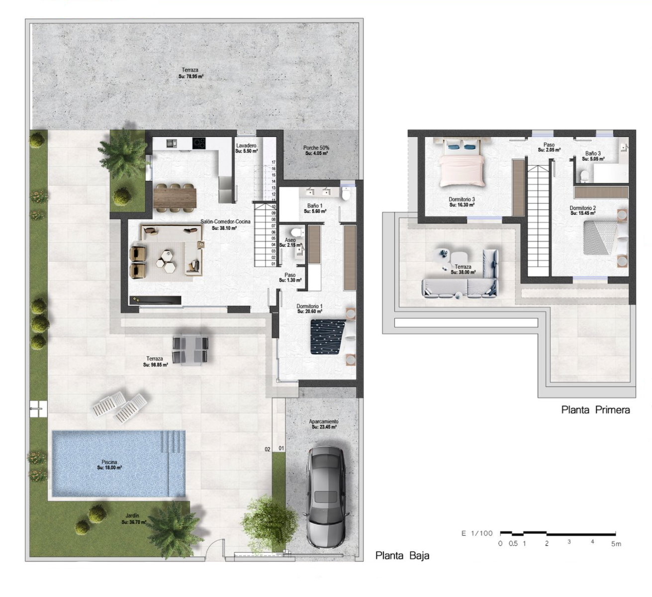 The residential has various types of detached villas all on one level or over two levels with 2, 3 or 4 bedrooms, 2 or 3 bathrooms and a private swimming pool, with multiple options to choose from as well as being built with all high quality finishes. The villas have been designed to integrate the exterior with the interior of the living space. The villas boast plenty of exterior spaces to enjoy outdoor living in Spain with a private garden, large front and rear terrace areas, and an inviting 18m2 private swimming pool.
