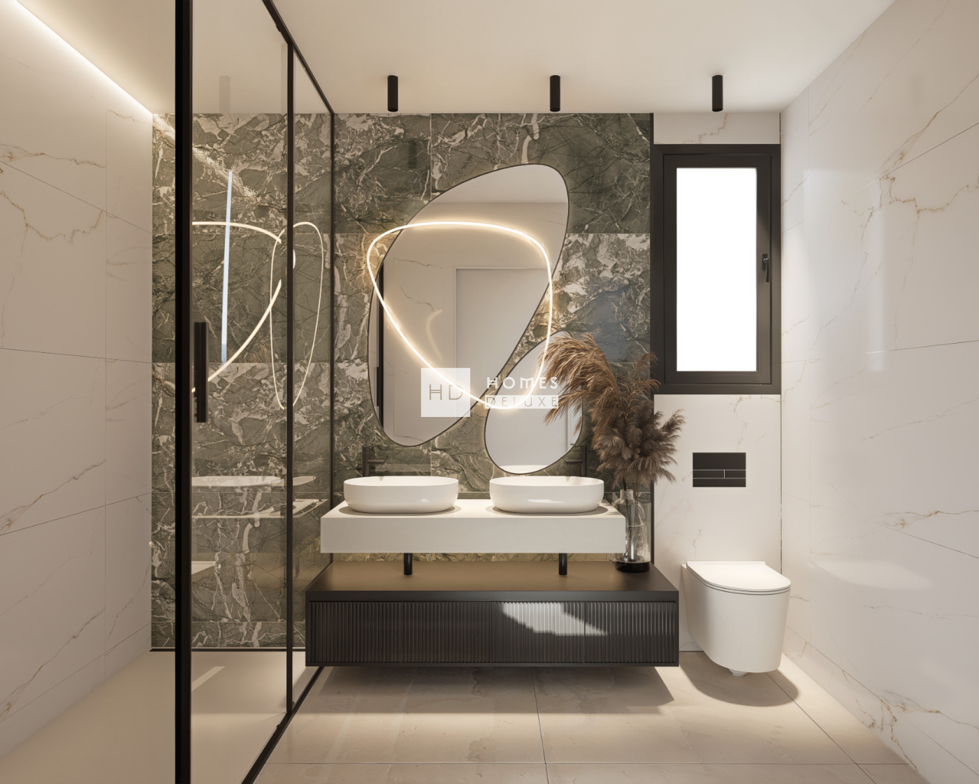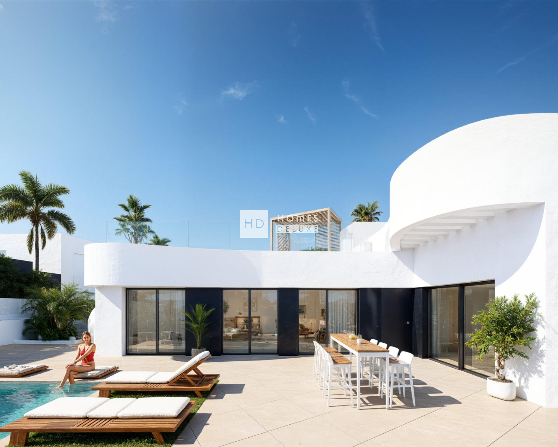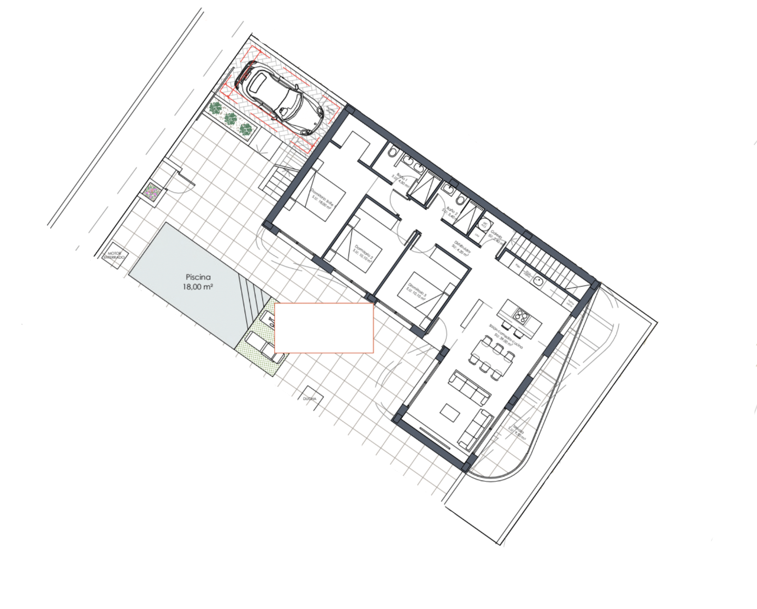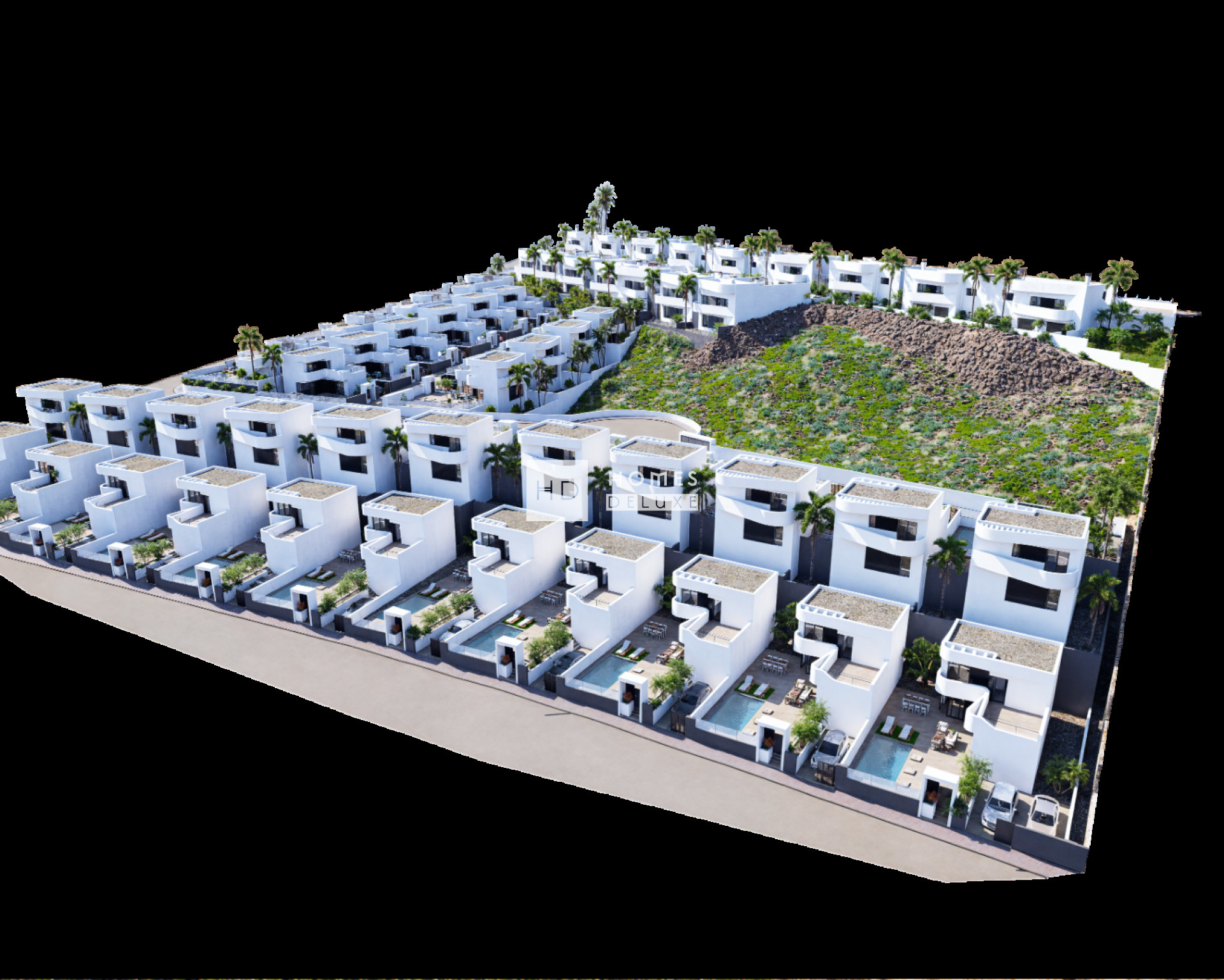 This particular villa has an L-shape design that allows practically the entire house to have views and access to the spacious and luxurious garden with a 6 x 3m private swimming pool. There is the optional extra of adding a basement level to this villa design. The villa is all on one level and the interior layout comprises of a bright and spacious open plan lounge and dining area with large windows throughout the living space creating plenty of natural light as well as opening onto the terrace. Within the main living space is a fully fitted modern American style kitchen with low and high cupboards and a centre island, and there is also a useful separate laundry room. The impressive Master suite boasts a large bedroom with en-suite bathroom, and walk in wardrobe / dressing area. There are a further two good sized double bedrooms, all bedrooms have patio door access onto the main terrace, and there is a separate guest bathroom. An exterior staircase at the side of the property leads you up to the extensive rooftop solarium which is perfect to enjoy the sun all day long. The properties come including pre-installation for air conditioning, built in wardrobes with drawer units in all bedrooms, interior and exterior LED lighting, an optional domotic system, garden finished with paved areas, artificial grass with available space for landscaping, and private parking on the plot.