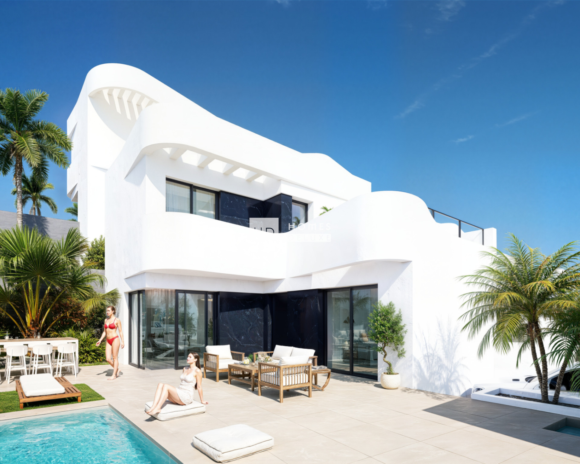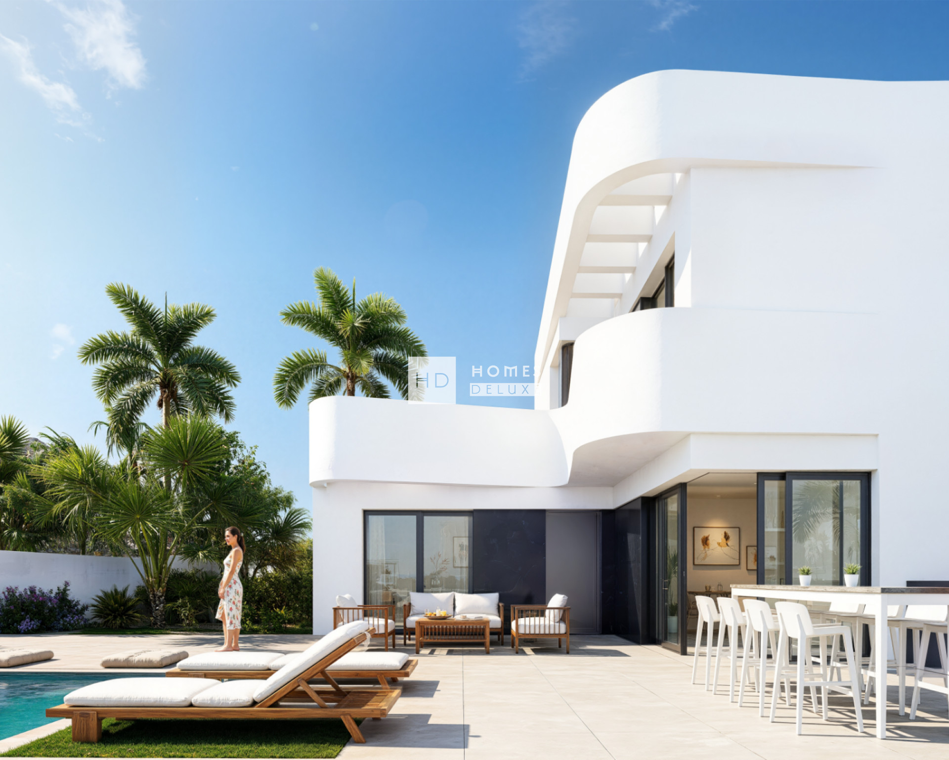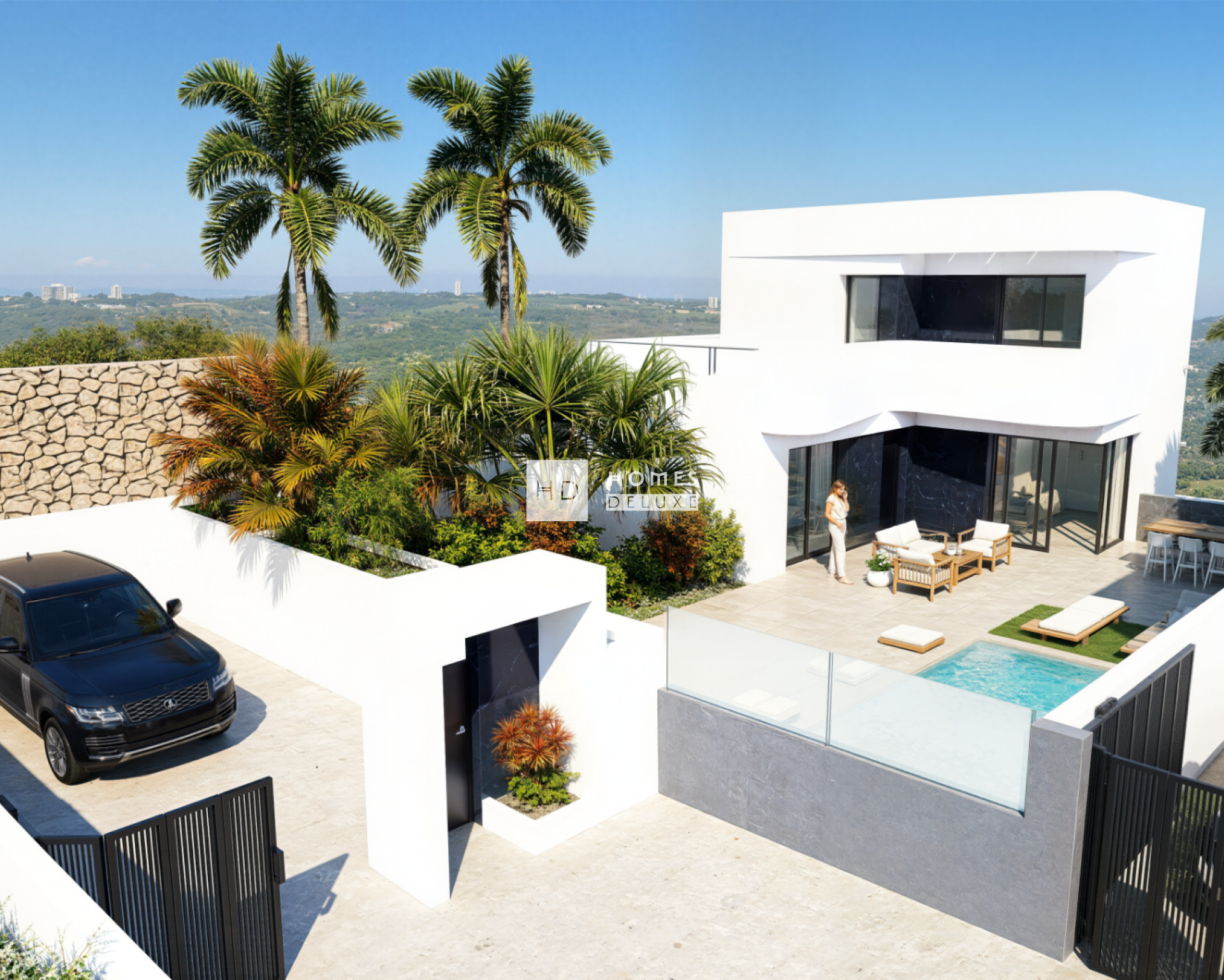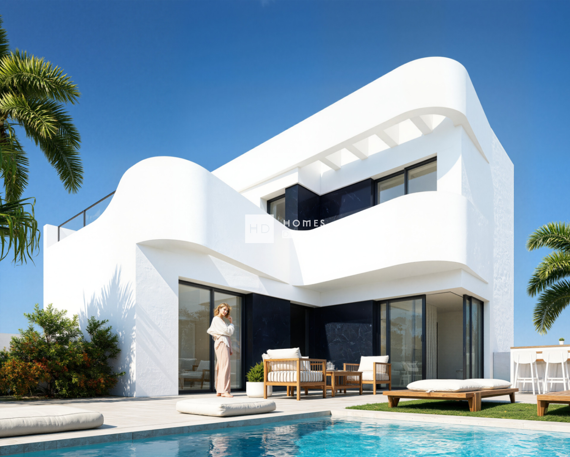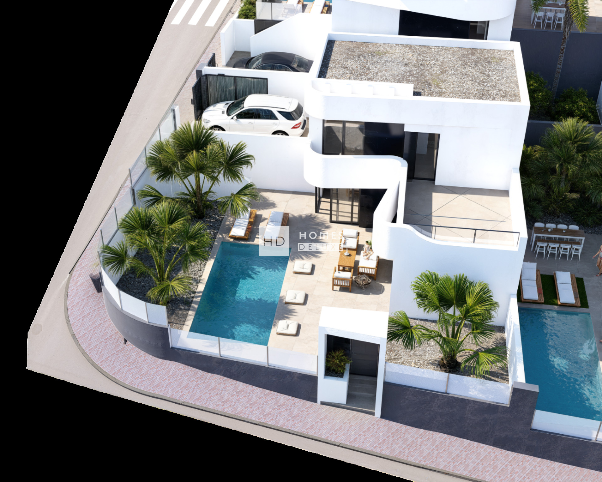 This particular villa is over two levels and boasts a luxurious garden with a 6 x 3m private swimming pool. There is the optional extra of adding a basement level to this villa design on certain plots. The interior layout comprises of an entrance hallway leading to the bright and spacious open plan lounge and dining area with large corner windows creating plenty of natural light as well as opening onto the terrace. Within the main living space is a fully fitted modern American style kitchen with low and high cupboards and a centre island. The ground floor also includes the large Primary bedroom with en-suite bathroom and patio door access onto the main terrace area. The interior staircase leads you up to the first floor level with a further two good sized double bedrooms and a separate guest bathroom. The first floor has access to a lovely sun terrace overlooking the private garden and pool. The properties come including pre-installation for air conditioning, built in wardrobes with drawer units in all bedrooms, interior and exterior LED lighting, an optional domotic system, garden finished with paved areas, artificial grass with available space for landscaping, and private parking on the plot.