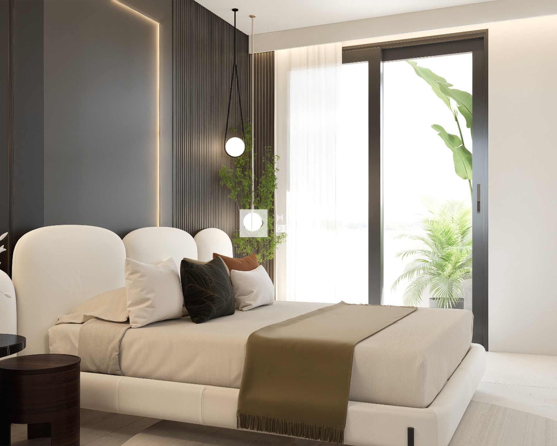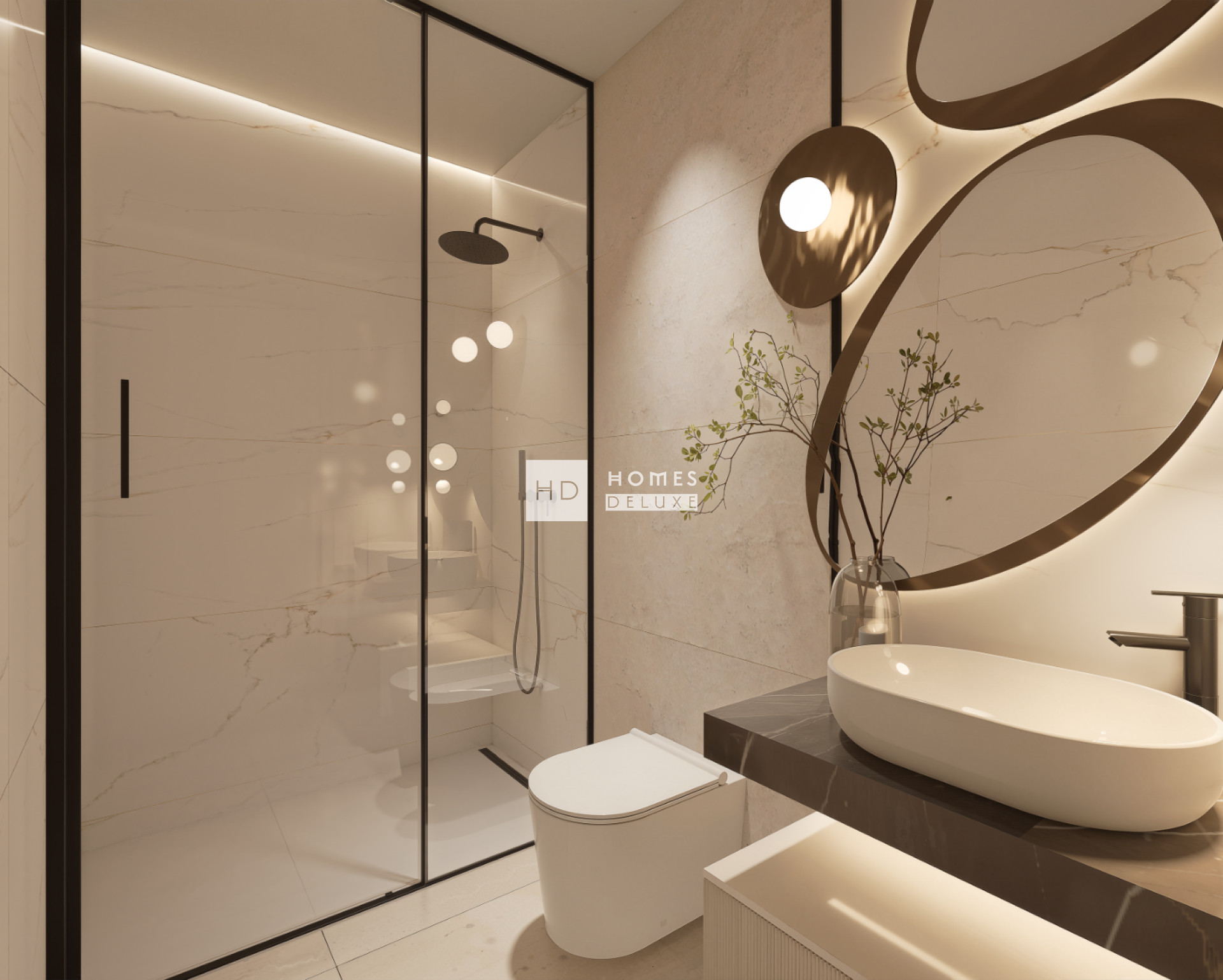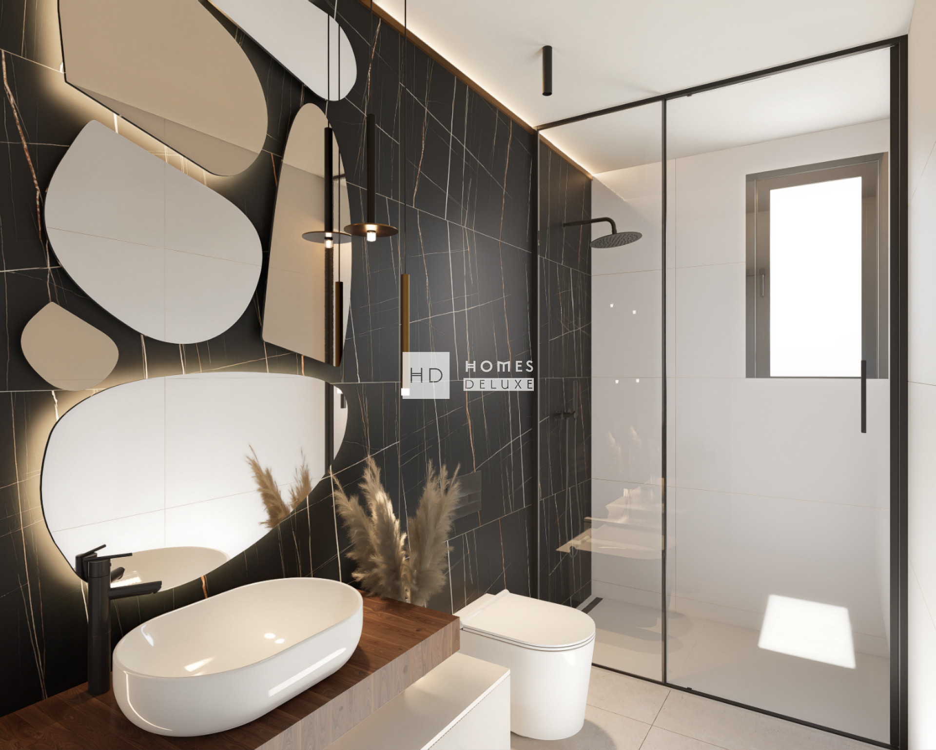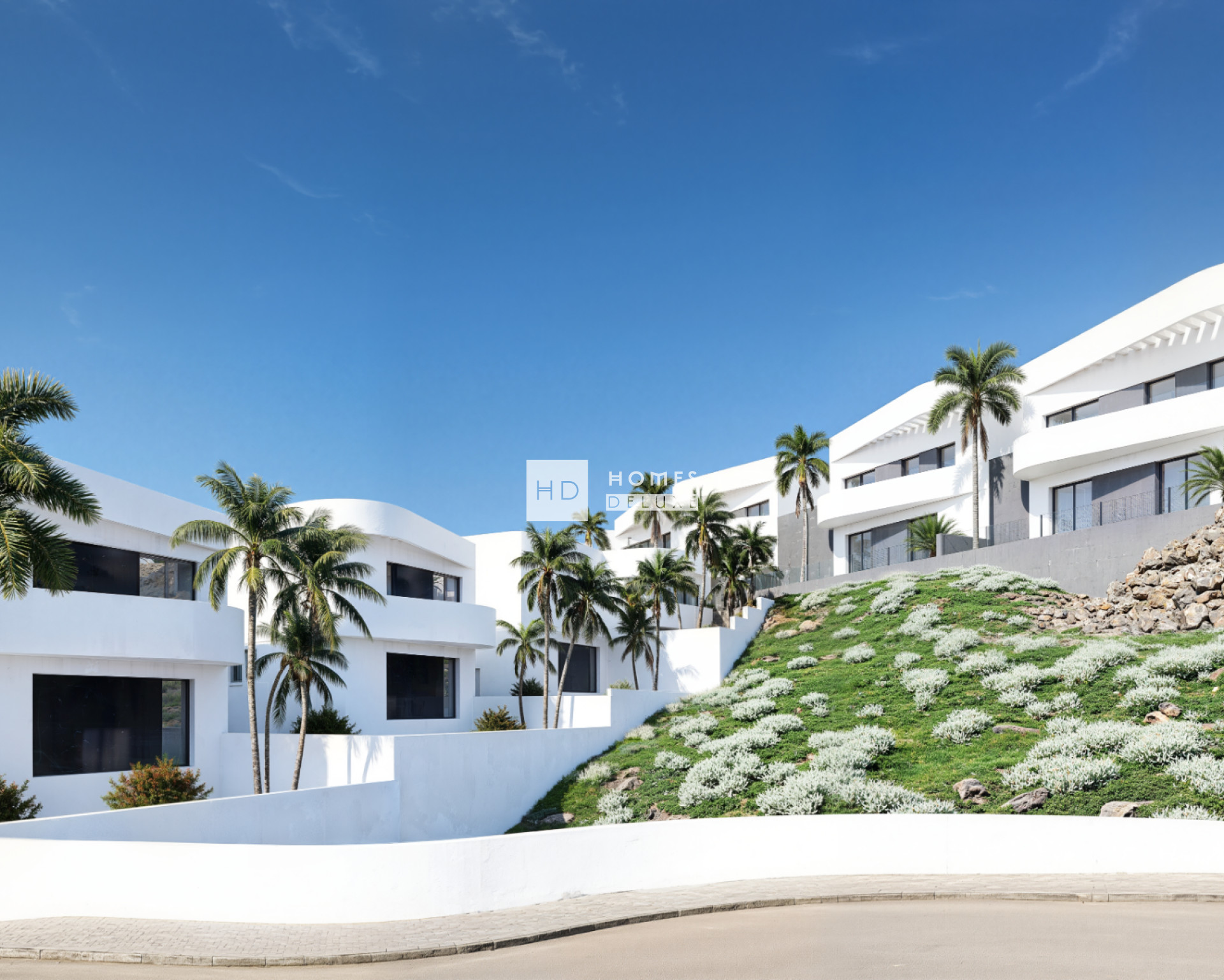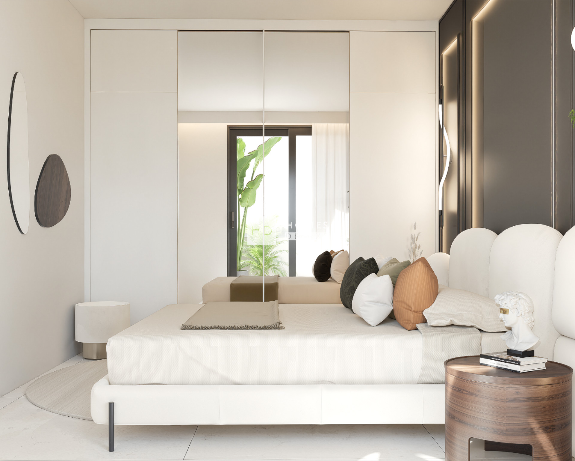 This particular villa is over two levels and boasts a luxurious garden with a 6 x 3m private swimming pool. There is the optional extra of adding a basement level to this villa design on certain plots. The interior layout comprises of an entrance hallway leading to the bright and spacious open plan lounge and dining area with large corner windows creating plenty of natural light as well as opening onto the terrace. Within the main living space is a fully fitted modern American style kitchen with low and high cupboards and a centre island. The ground floor also includes the large Primary bedroom with en-suite bathroom and patio door access onto the main terrace area. The interior staircase leads you up to the first floor level with a further two good sized double bedrooms and a separate guest bathroom. The first floor has access to a lovely sun terrace overlooking the private garden and pool. The properties come including pre-installation for air conditioning, built in wardrobes with drawer units in all bedrooms, interior and exterior LED lighting, an optional domotic system, garden finished with paved areas, artificial grass with available space for landscaping, and private parking on the plot.