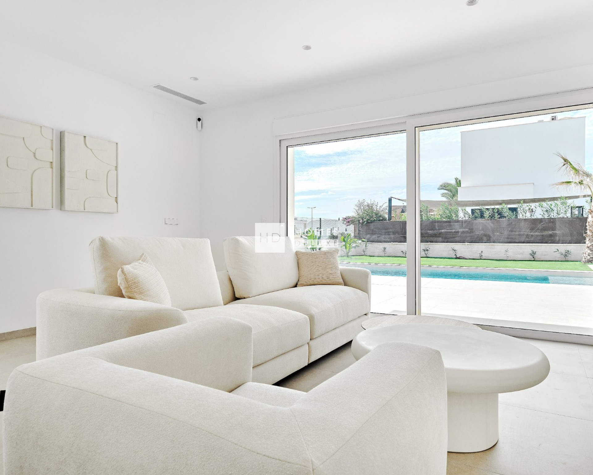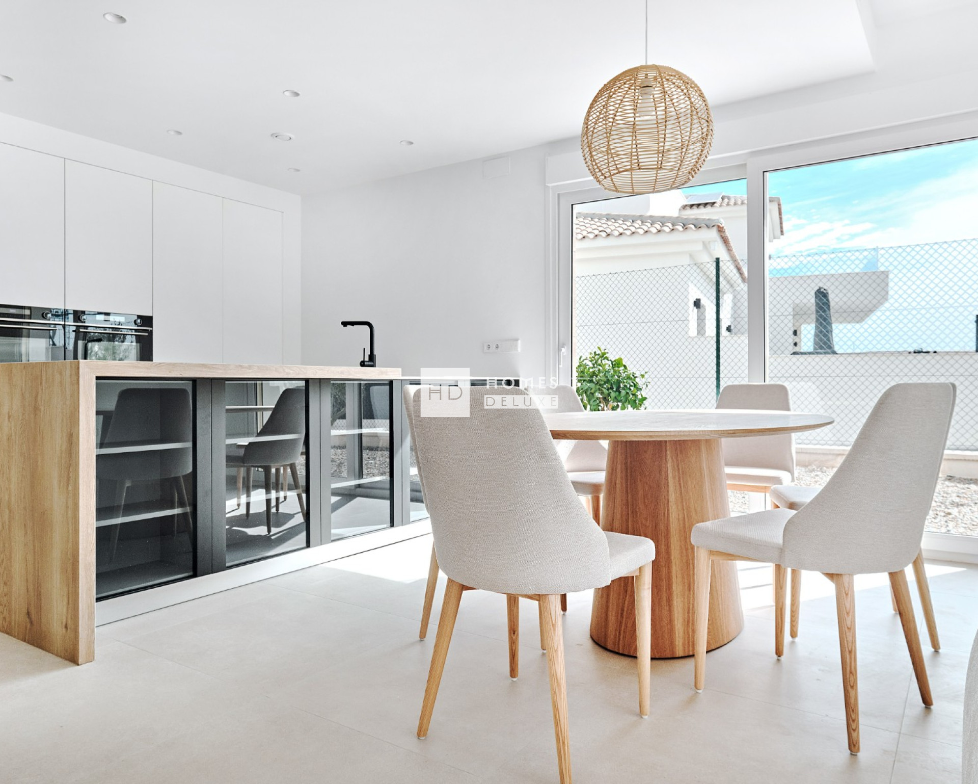 The villas are all on one level and the interior layout comprises of a bright and spacious open plan lounge and dining area with large windows creating plenty of natural light to flow through the property as well as opening onto the terrace and garden. Within the main living space is a fully fitted American style kitchen with centre island offering a choice of colours, and there is a useful separate laundry room. The ample Primary bedroom includes an en-suite bathroom and has patio doors opening onto the rear garden area. There are a further two good sized double bedrooms and a separate guest bathroom. All villas come including ducted air conditioning, kitchen electrical appliances (oven, induction hob, extractor fan, microwave, fridge-freezer, dishwasher and washing machine) , underfloor heating and pre-installation for electric towel rails in the bathrooms, built in wardrobes in all bedrooms, interior and exterior LED lighting, electric shutters, intercom system, private swimming pool and private parking on the plot.