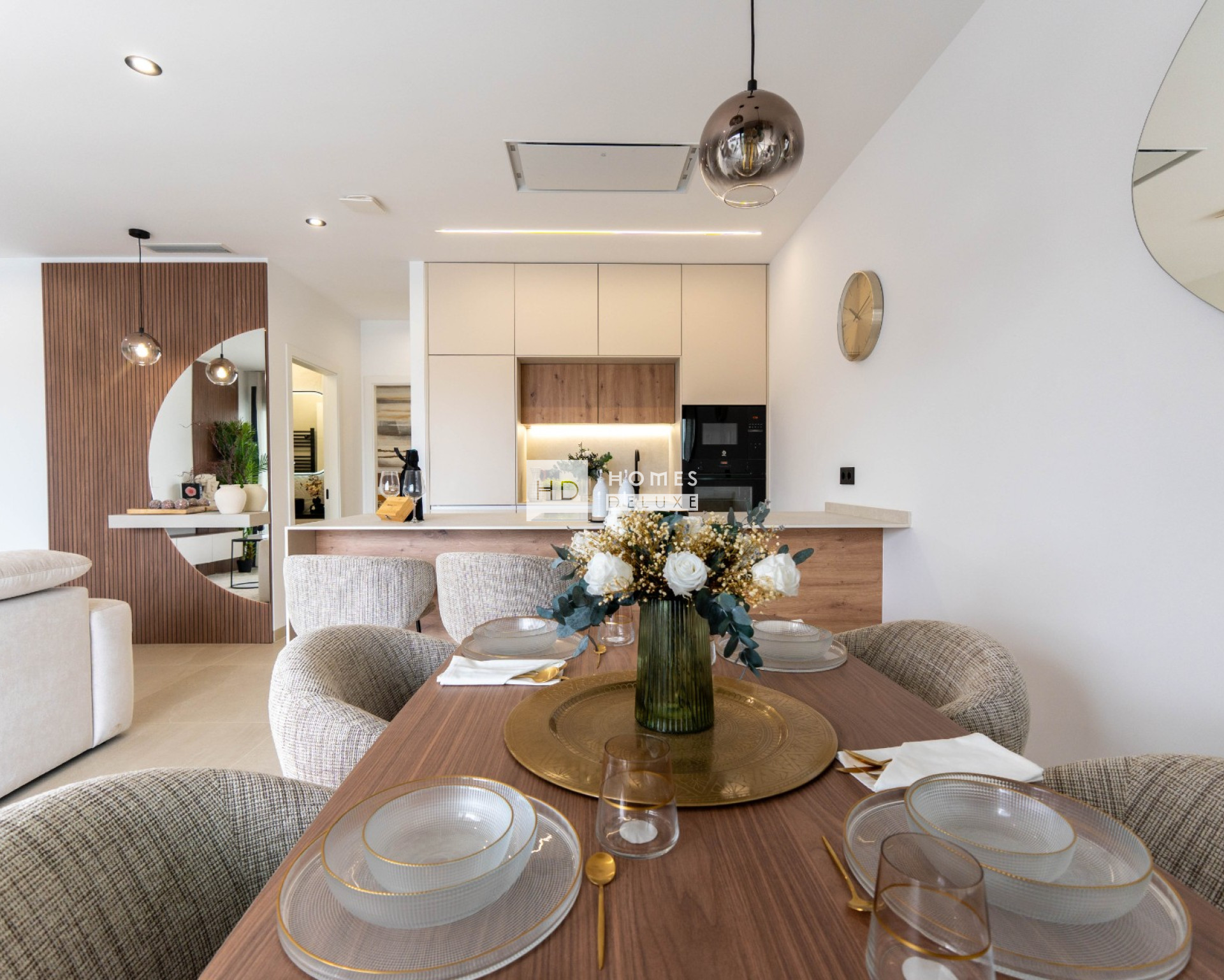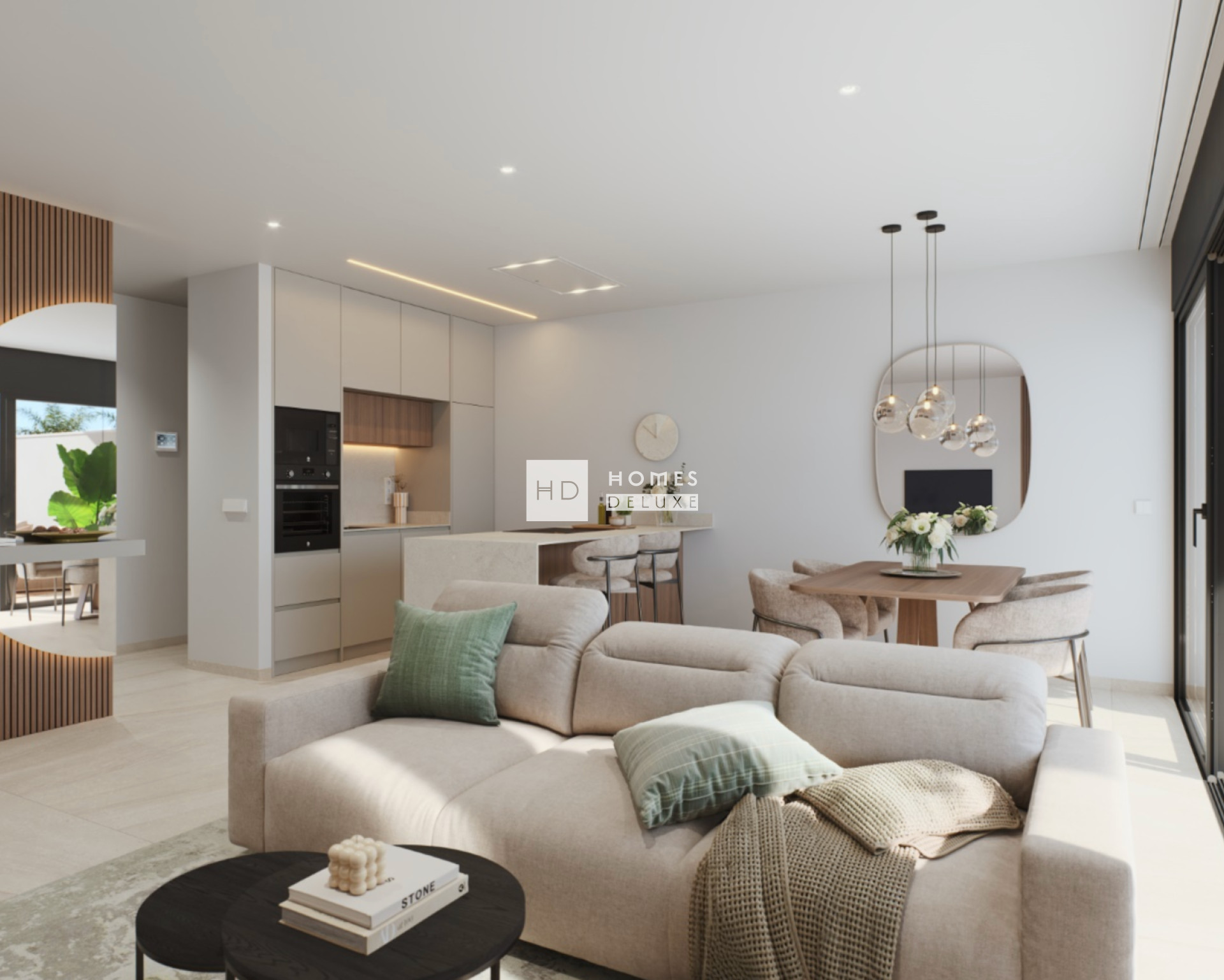 The 4 bedroom villa layout comprises of a spacious open plan lounge and dining area with large windows allowing plenty of natural light throughout the property as well as giving access to the terrace and garden. Within the main living space is a fully fitted modern American style kitchen with high and low cupboards as well as a centre island, and a useful separate laundry room. The ground floor level also has a good sized double bedroom and a separate guest bathroom. The interior staircase leads you to the first floor with the impressive Primary suite including a large bedroom, en-suite bathroom, walk-in-wardrobe / dressing area, and has patio door access onto a private sun terrace overlooking the garden and swimming pool. The first floor also has a further two double bedrooms and a stylish family bathroom. The villas enjoy an ample terrace and garden with private swimming pool to make the most of outdoor living in Spain and there is the optional extra of adding a rooftop solarium to the property to extend the exterior space further.
