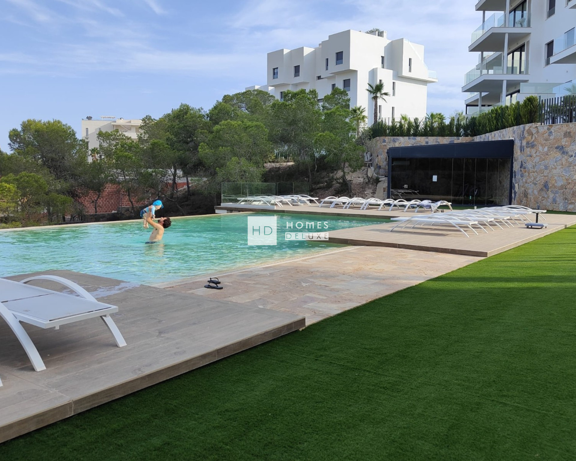 Modern 2 bed 2 bath ground floor apartment in community Nispero in Las Colinas Golf & Country Club. With a spacious terrace, private garden and south facing orientation to enjoy the spanish sun. A/C (hot /cold), floor heating in bathrooms, electric shutters in both bedrooms, landscaped garden, terrace with lounge set and weber electric BBQ as well as Smart Tv with international channels. Surrounded by nature reserve and forest area for a quiet holiday stay and a great golf experience on the award winning course. Walking distance to the local restaurants, sport facilities, GYM//Spa and only 15min drive from the white sandy beaches of campoamor, cabo roig and la zenia among others.