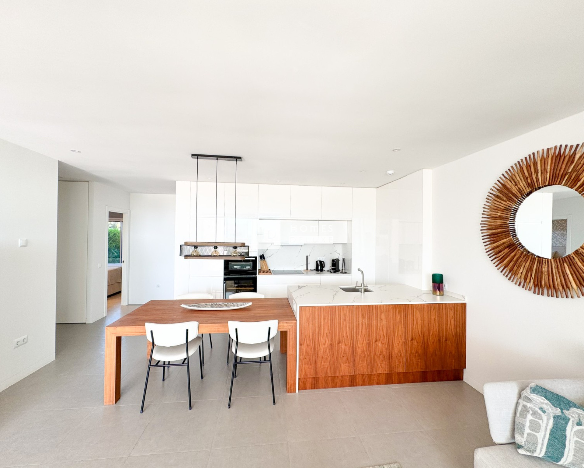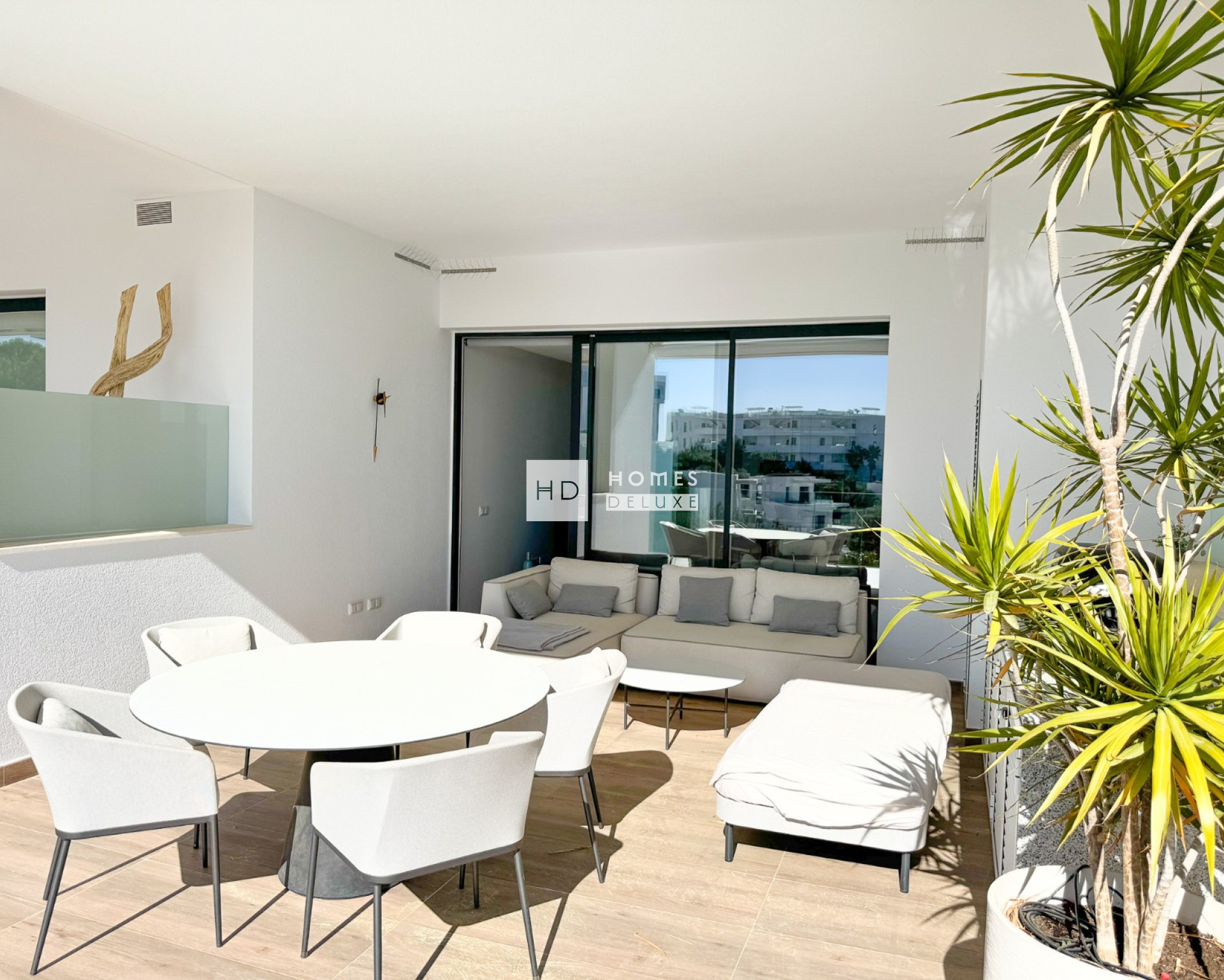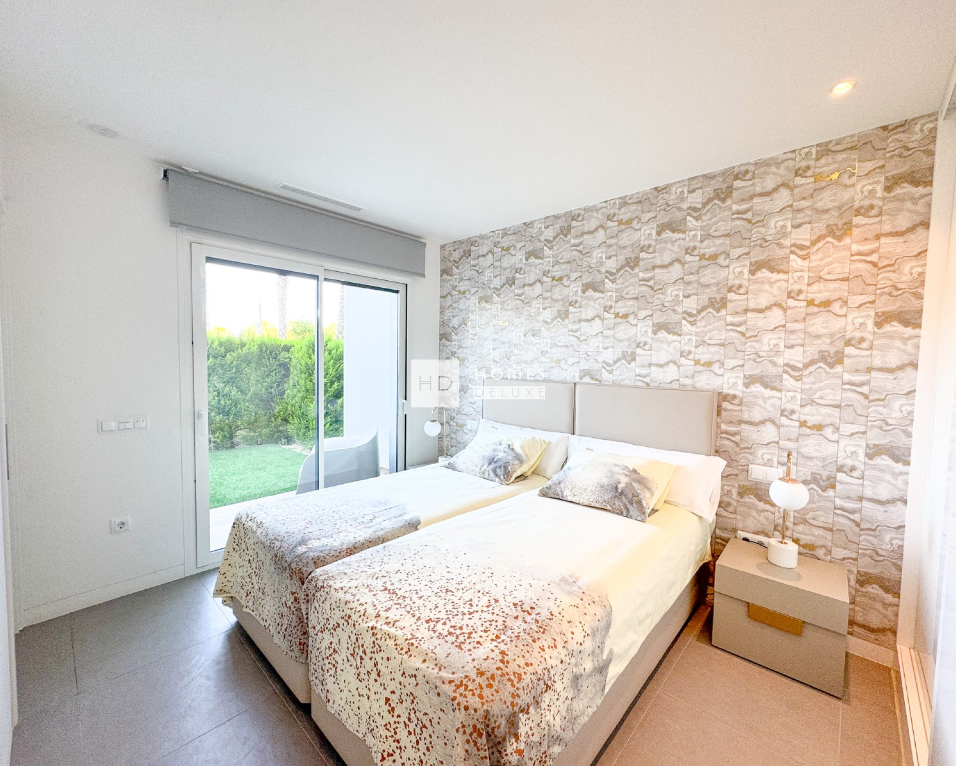 Modern ground floor apartment with 2 bedrooms 2 bathrooms and 2 terraces in community Naranjo, Las Colinas Golf. Spacious front terrace with nice views to the communal green area and the sea and private garden/back terrace for extra privacy and some shade in the summer. Underground garage space and storage as well as nicely designed communal gardens and pool. The building naranjo has recently been painted (2025) and is in very good condition. The property is being sold with all furniture.