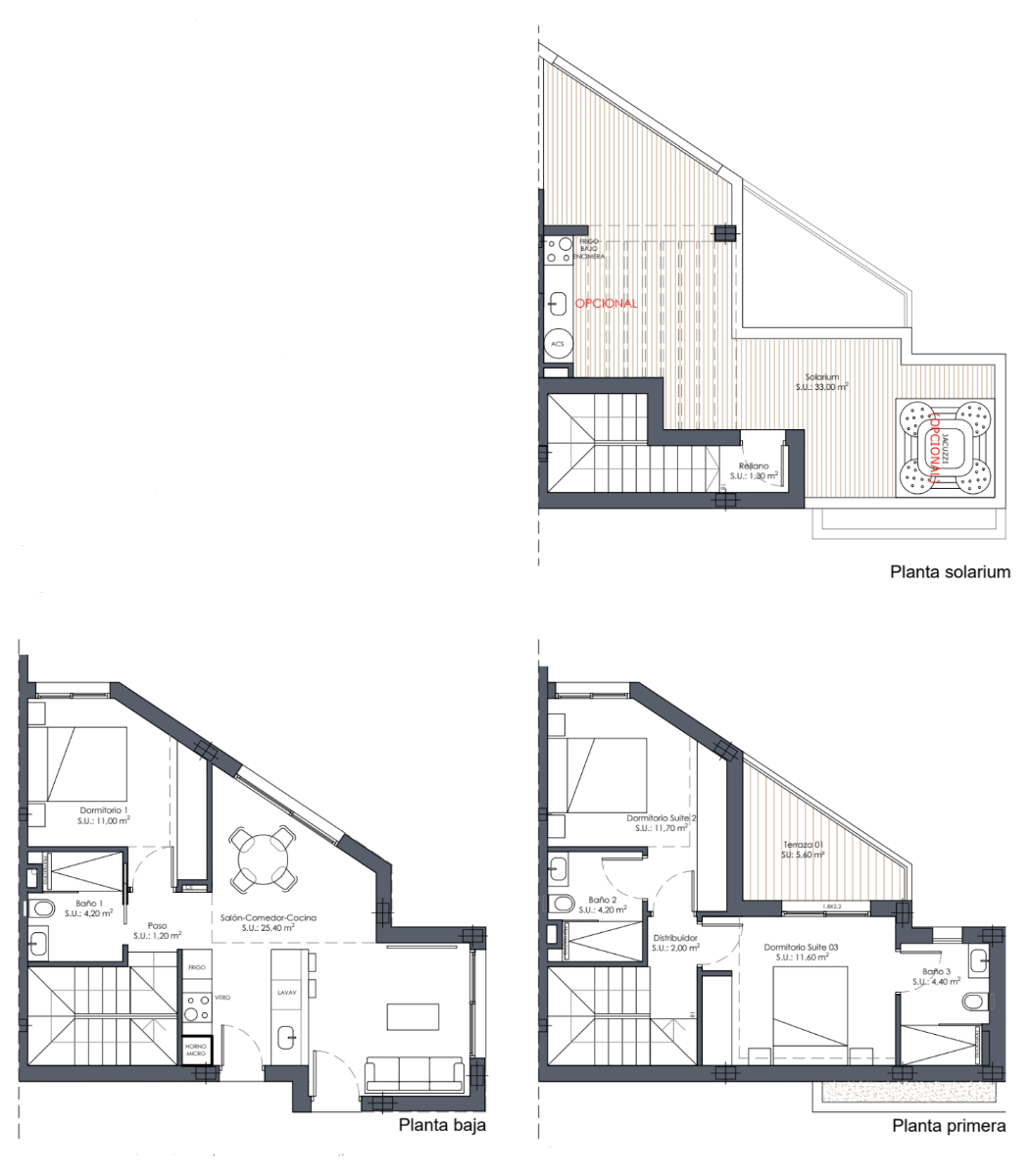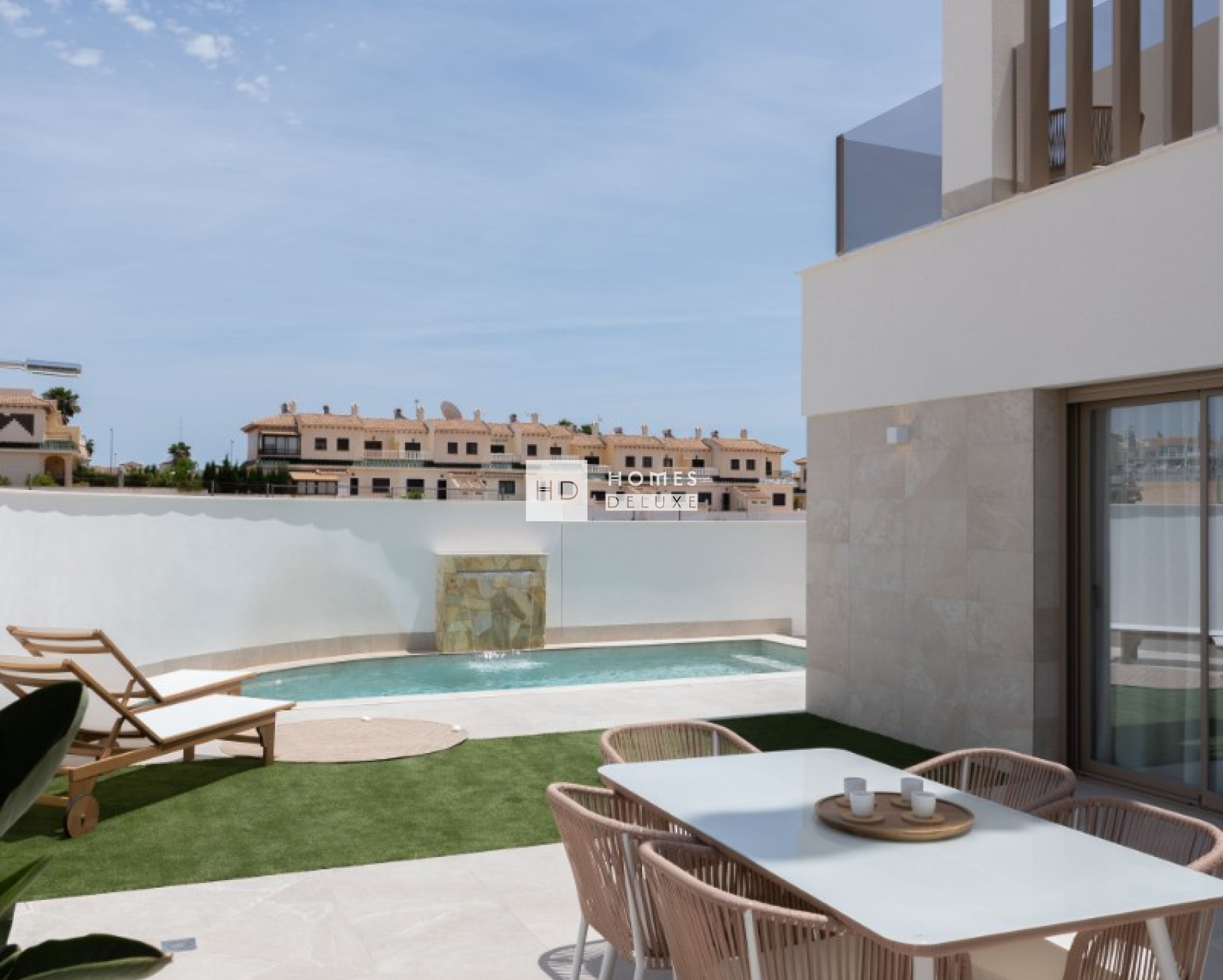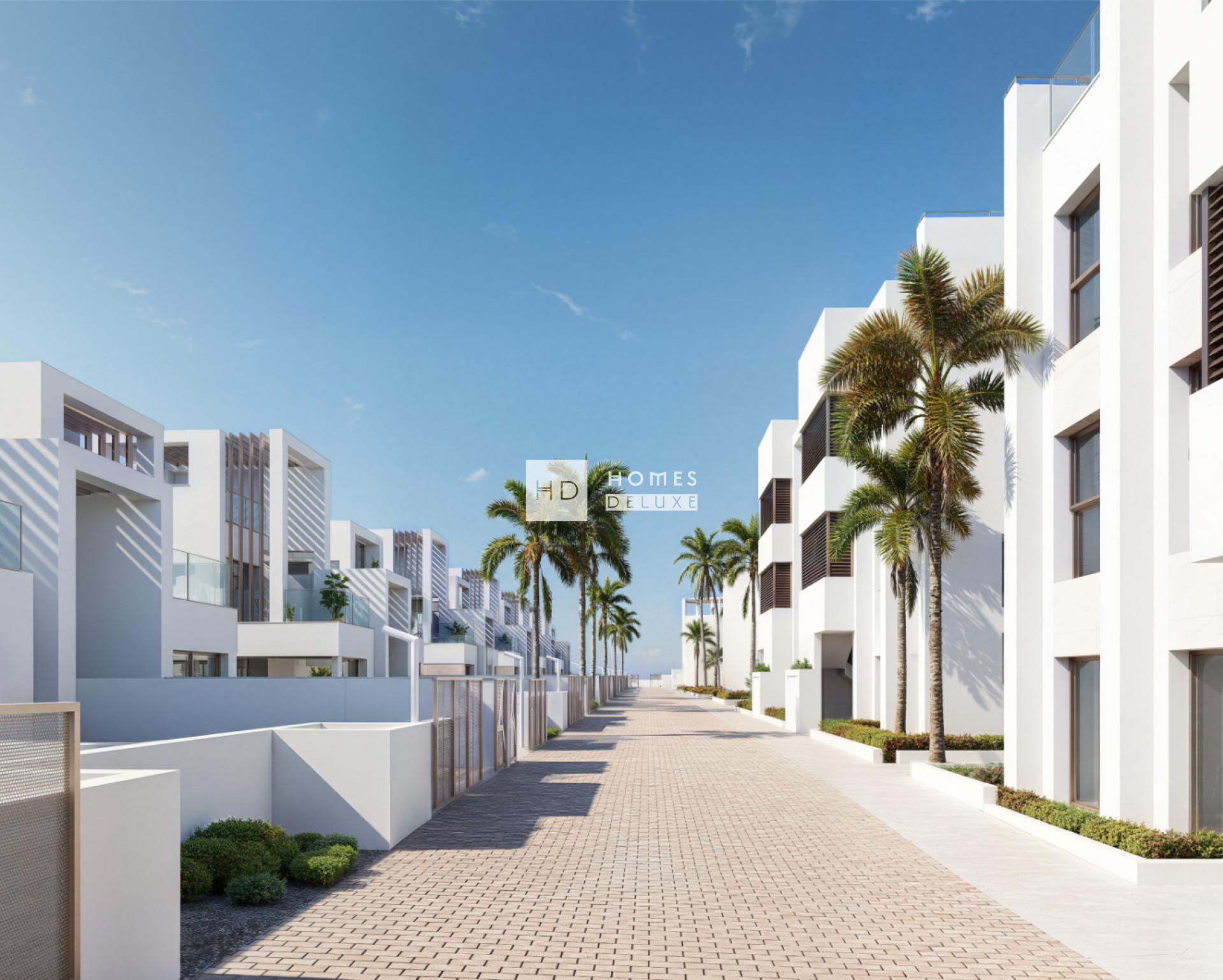The homes are designed for comfortable everyday living, with spacious outdoor areas and surroundings that combine residential quality and amenities. The interior layouts comprise of an entrance hallway leading to the bright and spacious open plan lounge and dining area with large windows throughout the space which give access to the terrace and garden. Within the main living space is a fully fitted modern designer American style kitchen with high-quality cabinetry, including upper and lower cabinets as well as a centre island, and there is a useful guest toilet. The ground floor level also includes the large Primary bedroom with en-suite bathroom and ample wardrobe space. The interior staircase leads you to the first floor level with two good sized double bedrooms and both have door access to the family bathroom. The first floor enjoys a sun terrace just under 18m2 which has an exterior staircase leading up to the extensive rooftop solarium of just under 30m2 which is a perfect addition to outdoor space with pre-installation for a Summer kitchen and jacuzzi. The exterior has all well-connected spaces that allow you to enjoy the Mediterranean climate and panoramic views.