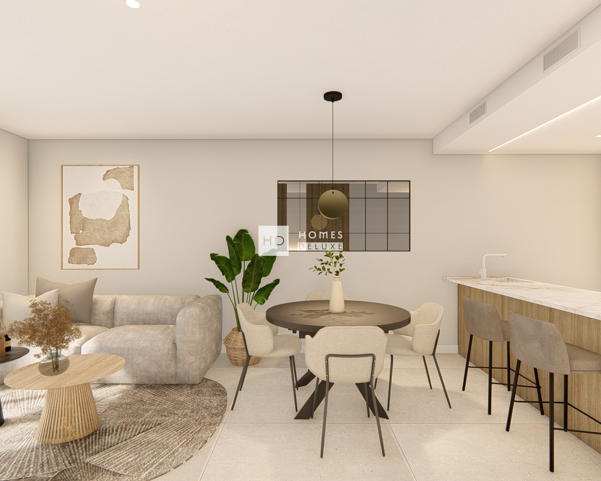 There is the choice of ground floor apartments with a private garden, middle floor apartments with a spacious terrace or penthouses with a large rooftop solarium. The exteriors have all well-connected outdoor spaces that allow you to enjoy the Mediterranean climate all year around, and thanks to the three-story layout of the buildings that make up the complex, all boast either a South or South-East orientation, ensuring excellent natural light and ventilation, as well as sea views. Each home features bright interiors with quality finishes and functional layouts designed for everyday comfort. The interior layouts comprise of an entrance hallway leading to the bright and spacious open plan lounge and dining area with large windows opening onto the terrace. Within the main living space is a fully fitted modern designer American style kitchen with high-quality cabinetry, including upper and lower cabinets with finishes available in matte white or taupe with various decorative wood options. The large Primary bedroom includes an en-suite bathroom and dressing area. There are a further two good sized double bedrooms and a separate guest bathroom. The penthouses have an exterior staircase on the terrace leading up to the extensive rooftop solarium of 80m2 which is a perfect addition to outdoor space with pre-installation for a Summer kitchen and jacuzzi.