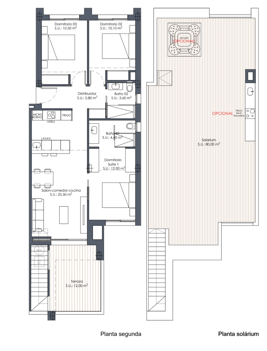There is the choice of ground floor apartments with a private garden, middle floor apartments with a spacious terrace or penthouses with a large rooftop solarium. The exteriors have all well-connected outdoor spaces that allow you to enjoy the Mediterranean climate all year around, and thanks to the three-story layout of the buildings that make up the complex, all boast either a South or South-East orientation, ensuring excellent natural light and ventilation, as well as sea views. Each home features bright interiors with quality finishes and functional layouts designed for everyday comfort. The interior layouts comprise of an entrance hallway leading to the bright and spacious open plan lounge and dining area with large windows opening onto the terrace. Within the main living space is a fully fitted modern designer American style kitchen with high-quality cabinetry, including upper and lower cabinets with finishes available in matte white or taupe with various decorative wood options. The large Primary bedroom includes an en-suite bathroom and dressing area. There are a further two good sized double bedrooms and a separate guest bathroom. The penthouses have an exterior staircase on the terrace leading up to the extensive rooftop solarium of 80m2 which is a perfect addition to outdoor space with pre-installation for a Summer kitchen and jacuzzi.