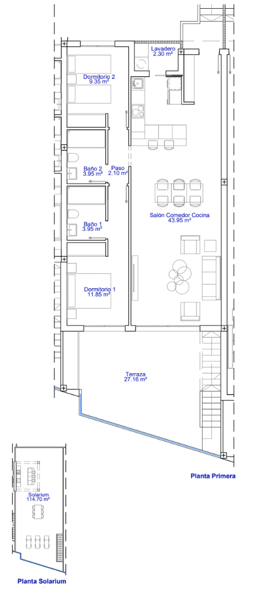 The interior layouts comprise of an entrance hallway leading to the spacious open plan lounge and dining area with large windows opening onto the terrace. Within the main living space is modern American style kitchen with high and low cupboards, and there is a useful separate laundry room. The ample Primary bedroom has patio doors opening onto the terrace and includes an en-suite bathroom and built in wardrobes. There is another good sized double bedroom with built in wardrobes, and a separate guest bathroom. The penthouses options have an exterior staircase by the front door leading up to the rooftop solarium of 78m2, and the top floor bungalows have an exterior staircase on the terrace which gives access to the rooftop solarium of more than 113m2.