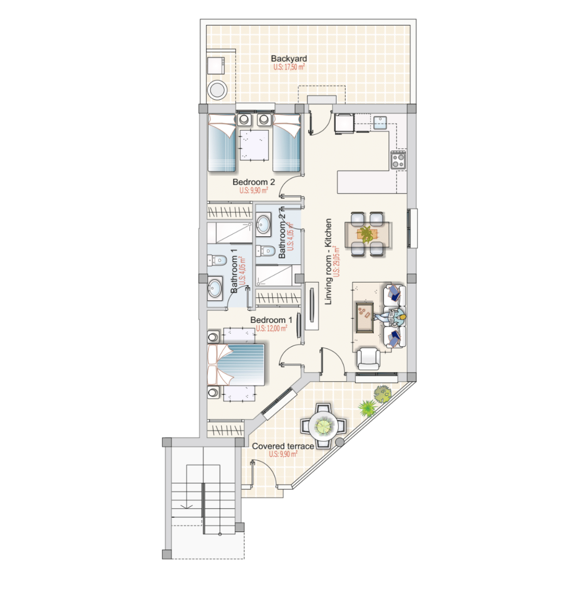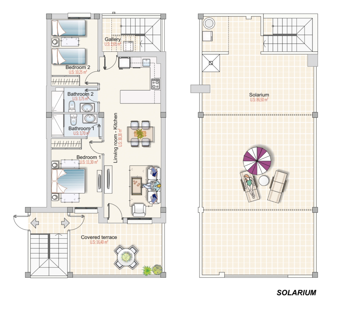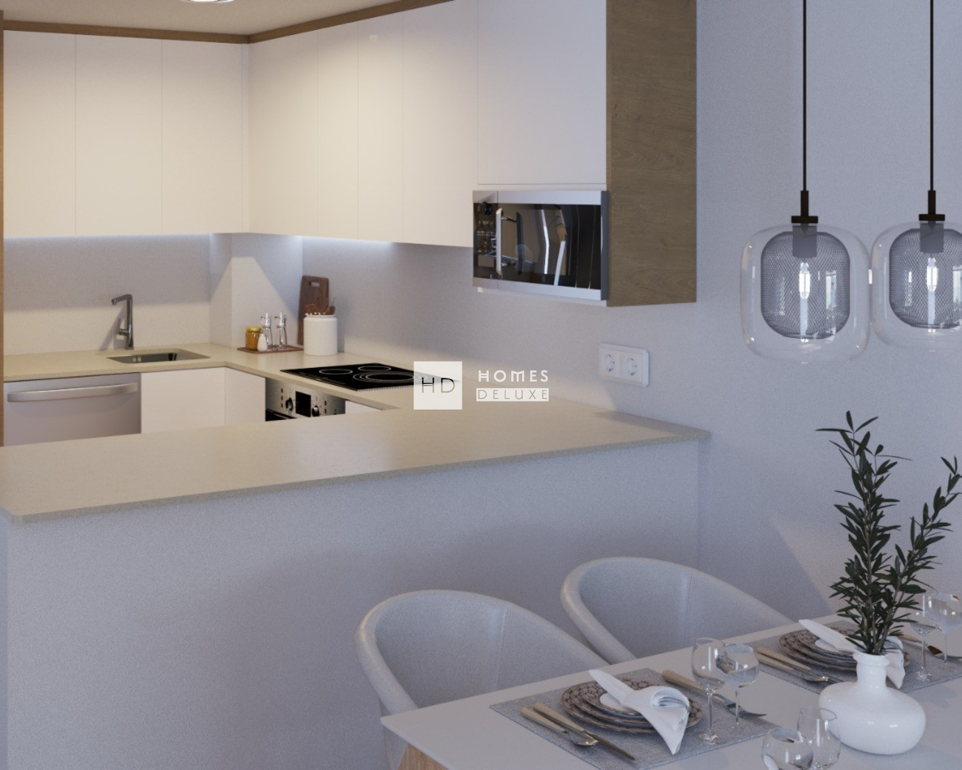 These particular apartments are the bungalow style offering the choice of ground floor apartments with front and rear terraces, or top floor apartments with a large rooftop solarium. The interior layouts comprise of a spacious open plan lounge and dining area with patio doors opening onto a covered terrace. Within the main living space is a modern "U" shape American style kitchen with high and low cupboards in a sleek white finish and plenty of worktop space. There is a good sized Primary bedroom with en-suite bathroom, another double bedroom and a separate guest bathroom. The top floor apartments have an exterior staircase leading up to the extensive rooftop solarium of 81m2 or 87m2 to enjoy the sun all day long. The properties come including ducted air conditioning, built in wardrobes in all bedrooms, interior LED lighting, intercom system, and private parking for all apartments.