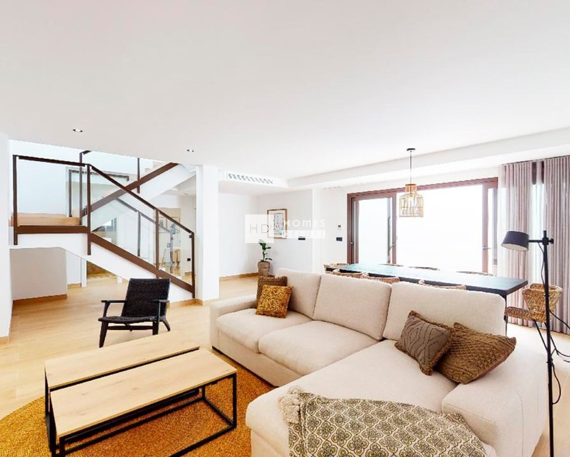 The interior layout comprises of an entrance hallway leading to the spacious open plan lounge and dining area with feature high ceilings and large windows opening on to the terrace and garden, within the main living space is a fully fitted modern American style kitchen, and a separate utility room. The ground floor level also includes the impressive Primary suite with a large bedroom, en-suite bathroom, and walk-in wardrobe / dressing area. The interior staircase leads you to the first floor level with a further two good sized double bedrooms and a separate guest bathroom. The property also includes a finished basement level including a large multi-purpose room to make into a second lounge, gym, games rooms, etc. to suit your needs and requirements. There is also a bodega area, another double bedroom bedroom and a second guest bathroom, perfect for guests or larger families. The basement enjoys plenty of natural light thanks to the the English patio and large windows.