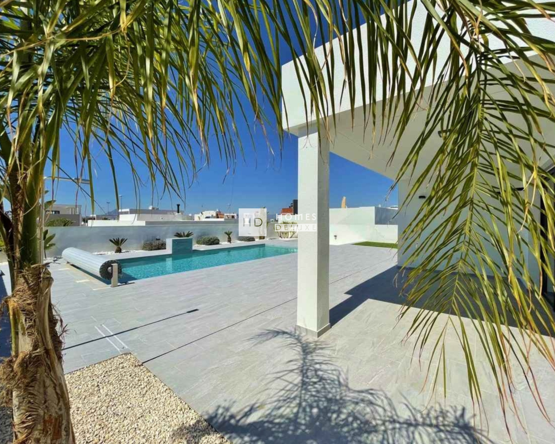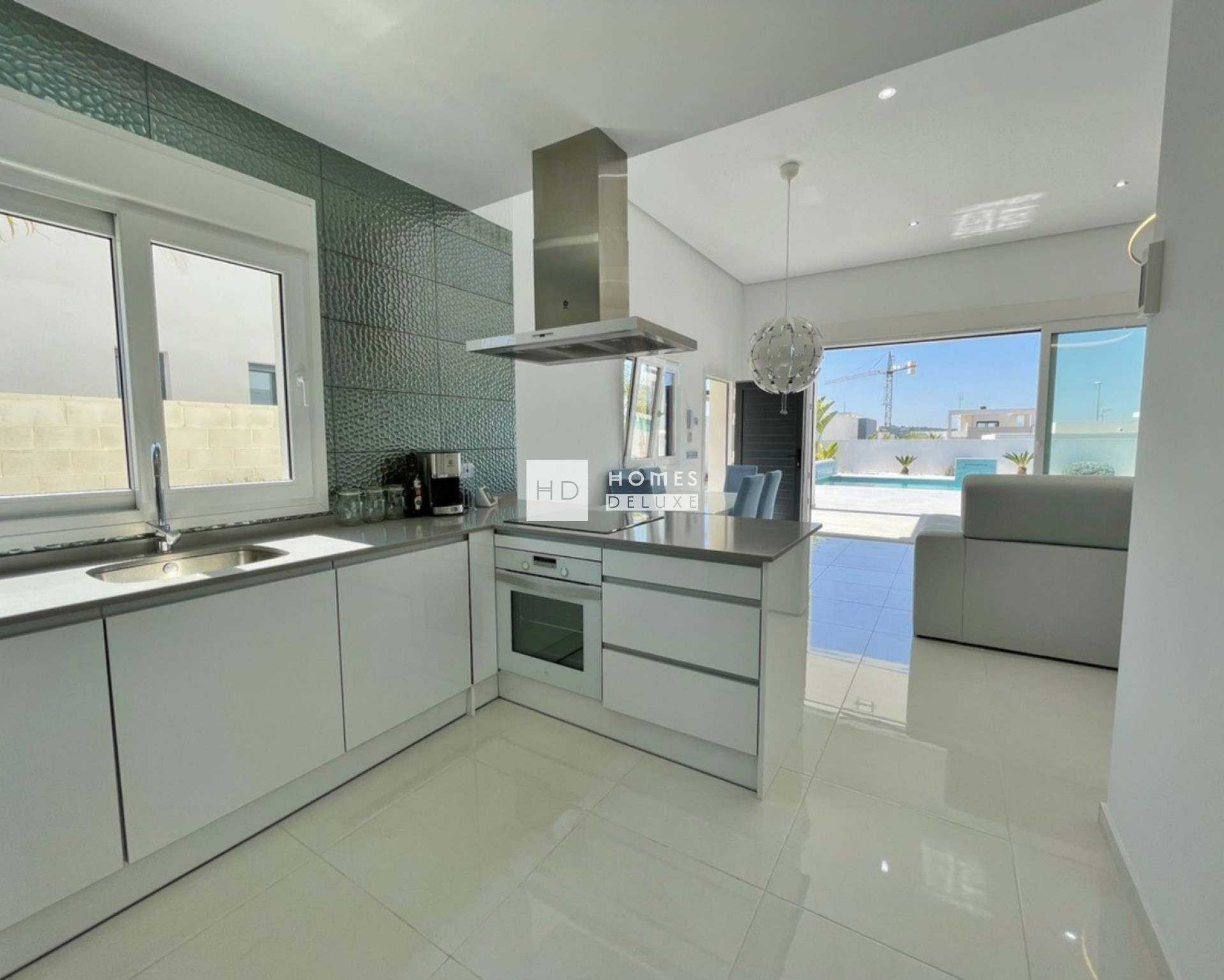 The interior layouts comprise of a bright and spacious open plan lounge and dining area with large windows opening onto the terrace and garden. Within the main living space is a modern high quality American style kitchen with breakfast bar and choice of finishes, and there is also a useful utility room. The large Primary bedroom includes an en-suite bathroom, there are a further two good sized double bedrooms and a separate guest bathroom. The properties come including pre-installation for ducted air conditioning, a photovoltaic solar panel system, underfloor heating in the bathrooms, built in wardrobes in all bedrooms, landscaped garden with irrigation system, private swimming pool, and private parking on the plot with a motorised entrance gate. The builder offers a choice of floor tiles throughout the house as well as the exterior, and wall tiles in the bathrooms and kitchen. There is also the optional extra of a rooftop solarium with a storage room.