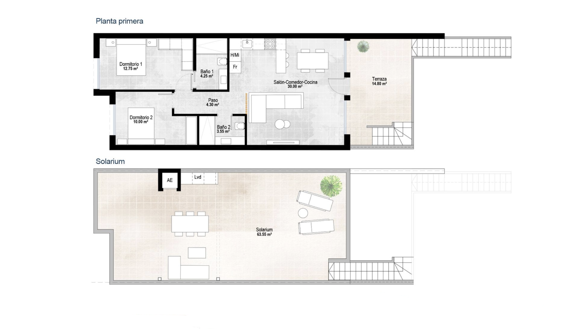 The interior layouts comprise of a spacious open plan lounge and dining area with large windows opening onto the private terrace. Within the main living space is a fully fitted American style kitchen with breakfast bar (depending on model of apartment some include a separate utility room). The large Primary bedroom includes an en-suite bathroom, there is another good sized double bedroom and a separate guest bathroom. The top floor apartments have an exterior staircase on the terrace leading up to the extensive rooftop solarium to enjoy the sun all day long.