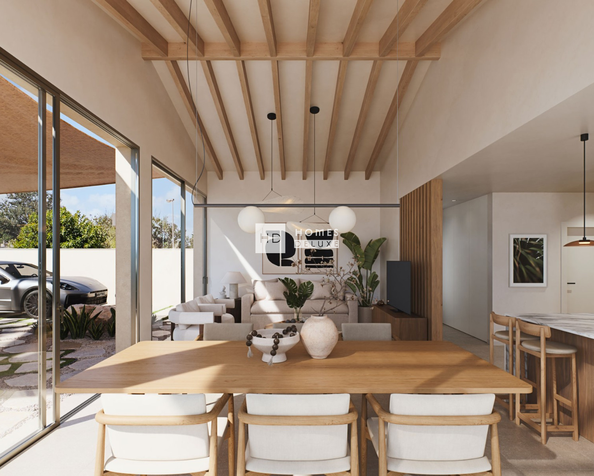 With a total built area of 130.6 m², the property has been thoughtfully laid out to maximise comfort. The interior layout comprises of an entrance hallway leading to the bright and spacious open plan lounge and dining area with large windows, providing natural light and direct connection to the garden. Within the main living space is a modern, fully equipped kitchen with centre island offering different models and colours to choose from. There is also a useful separate laundry room and guest toilet. The large Primary bedroom includes an en-suite bathroom and dressing area. There are a further two good sized double bedrooms, all bedrooms having patio door access onto the main terrace, and there is a separate family bathroom. The rooftop solarium is accessed via an exterior staircase at the side of the property.