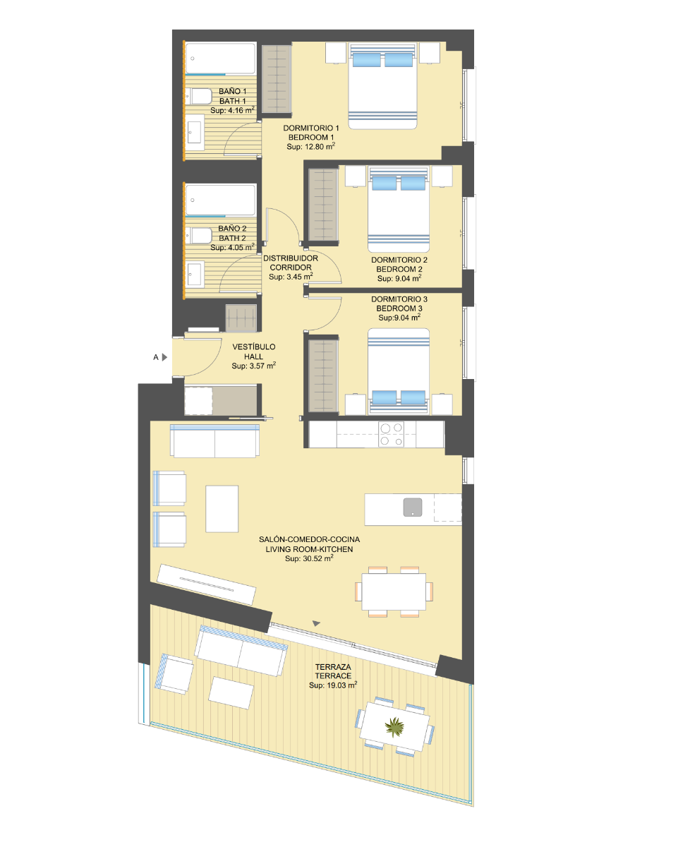 The interiors consist of a spacious lounge and dining area, open plan kitchen, Master bedroom with en-suite bathroom, another two double bedrooms (all bedrooms include built in wardrobes) and guest bathroom. The patio doors in the lounge area has access to a beautiful large terrace to enjoy outdoor living in Spain. Each apartment will be delivered with full installation of ducted air conditioning and kitchen electrical appliances.