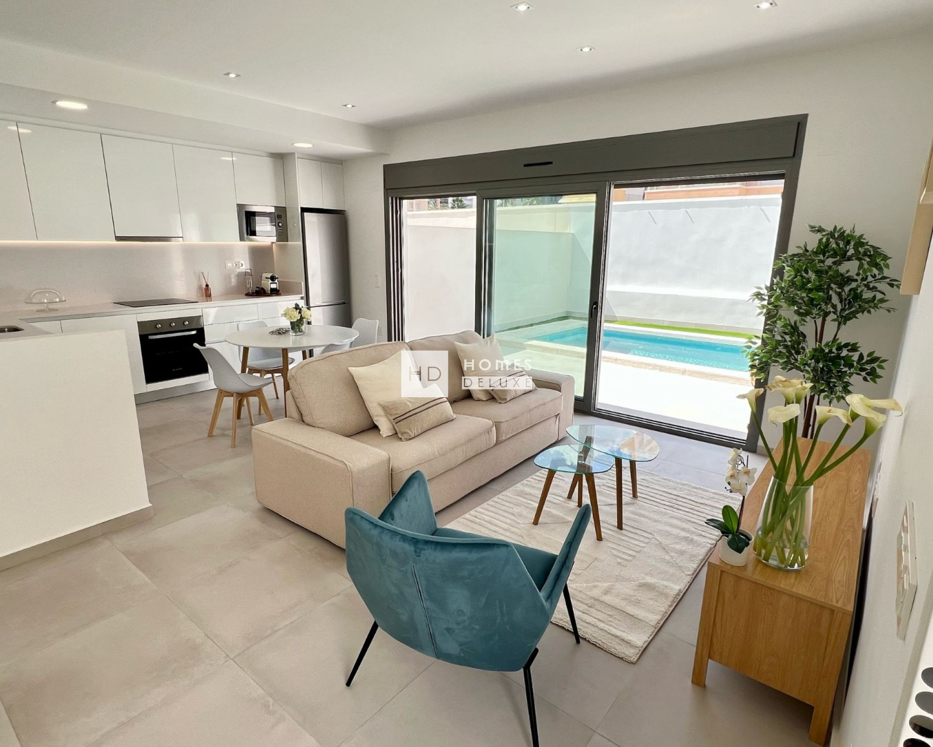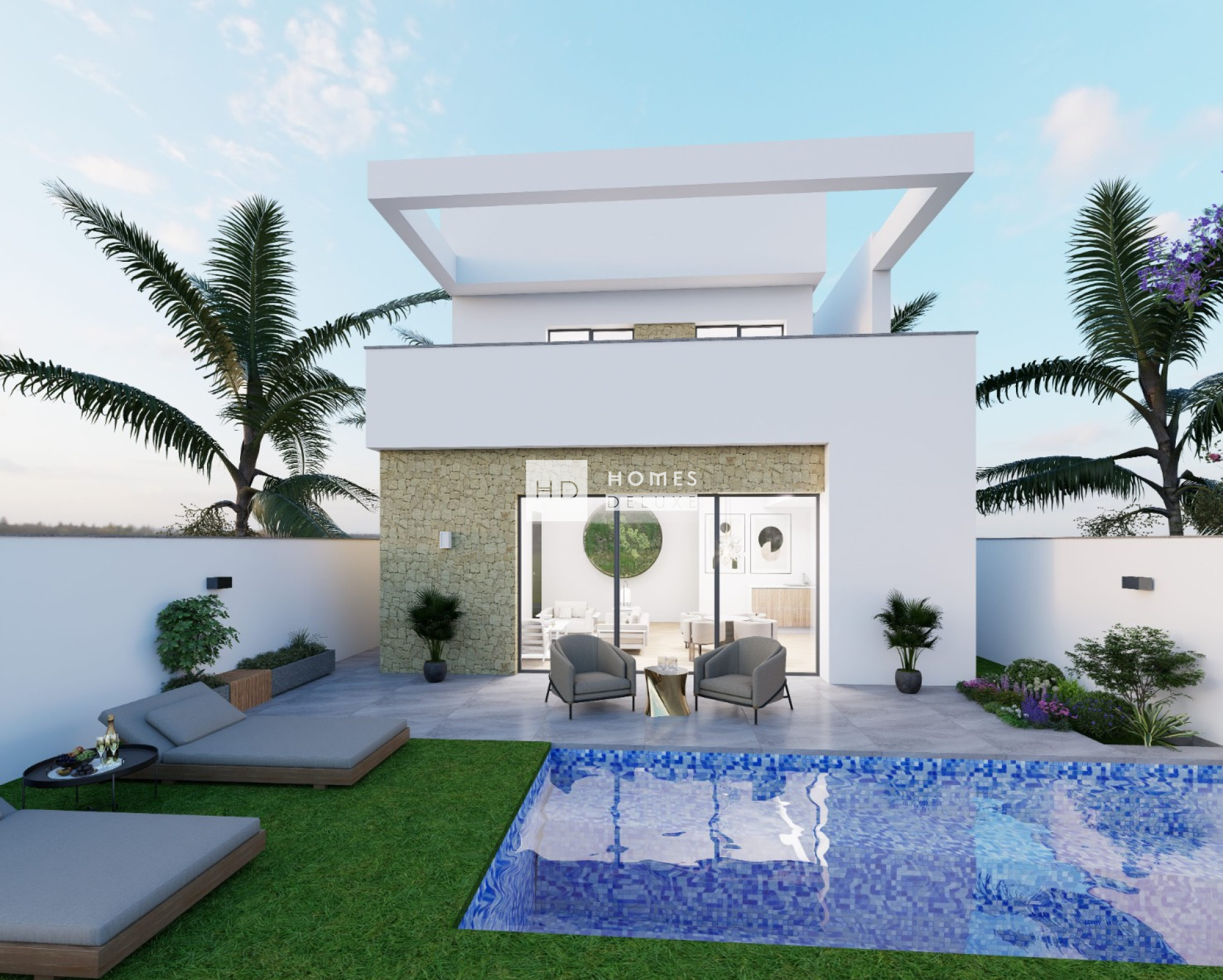 The interiors layouts comprise of a spacious open plan lounge and dining area with patio doors opening on to the terrace, within the main living space is a modern American style kitchen finished in lacquered white gloss. The ground floor level also includes a good sized double bedroom and a separate guest bathroom. The interior staircase leads you to the first floor level with a further two double bedrooms and a second separate guest bathroom. Both bedrooms on the first floor have access to a large sun terrace and there is an option to have a private rooftop solarium. The ground floor exterior enjoys a large terrace and garden area with an optional private swimming pool to make the most of outdoor living in Spain. Some of the villas within the project have the option to add a basement level to the property creating extra living space to suit your needs and requirements.