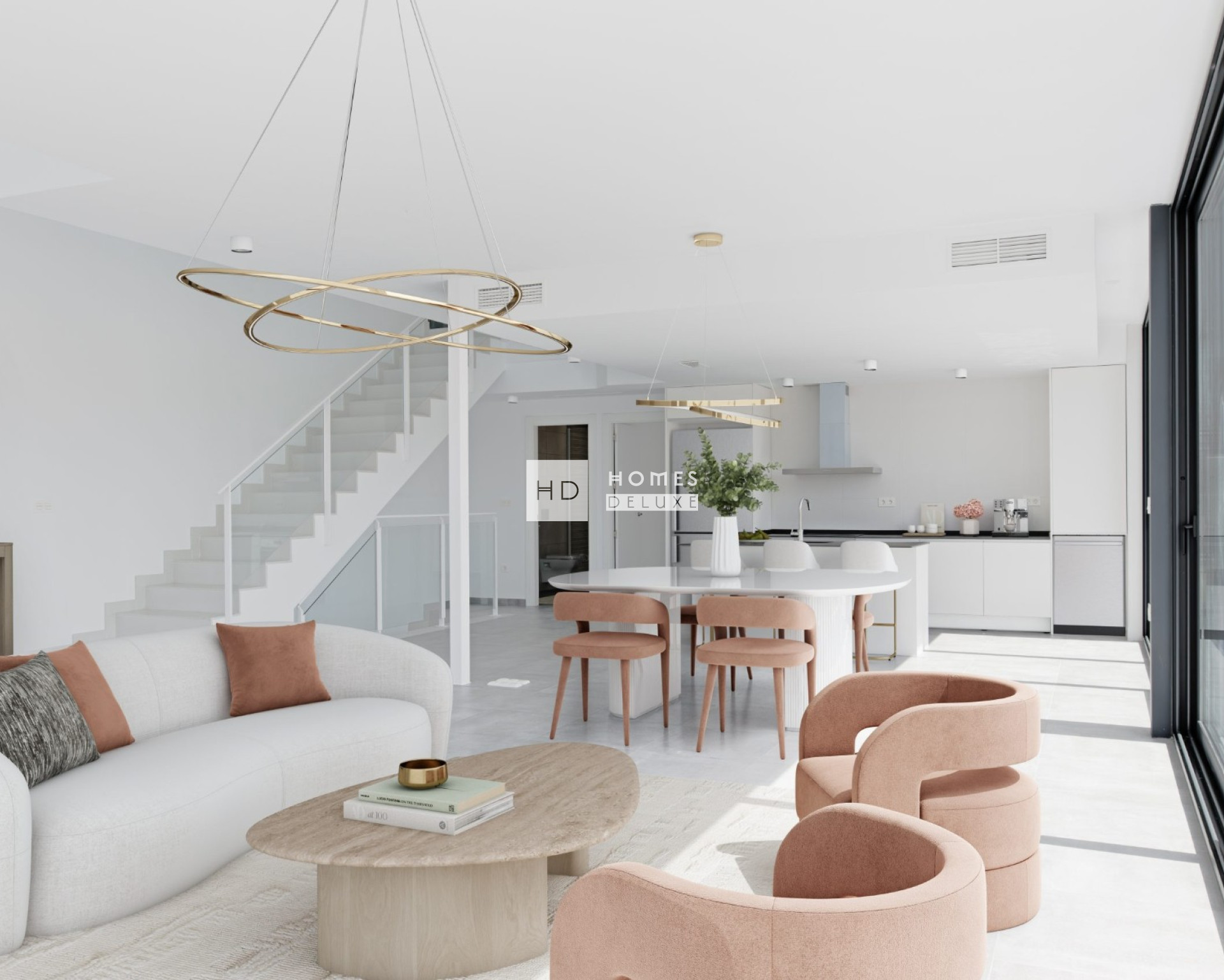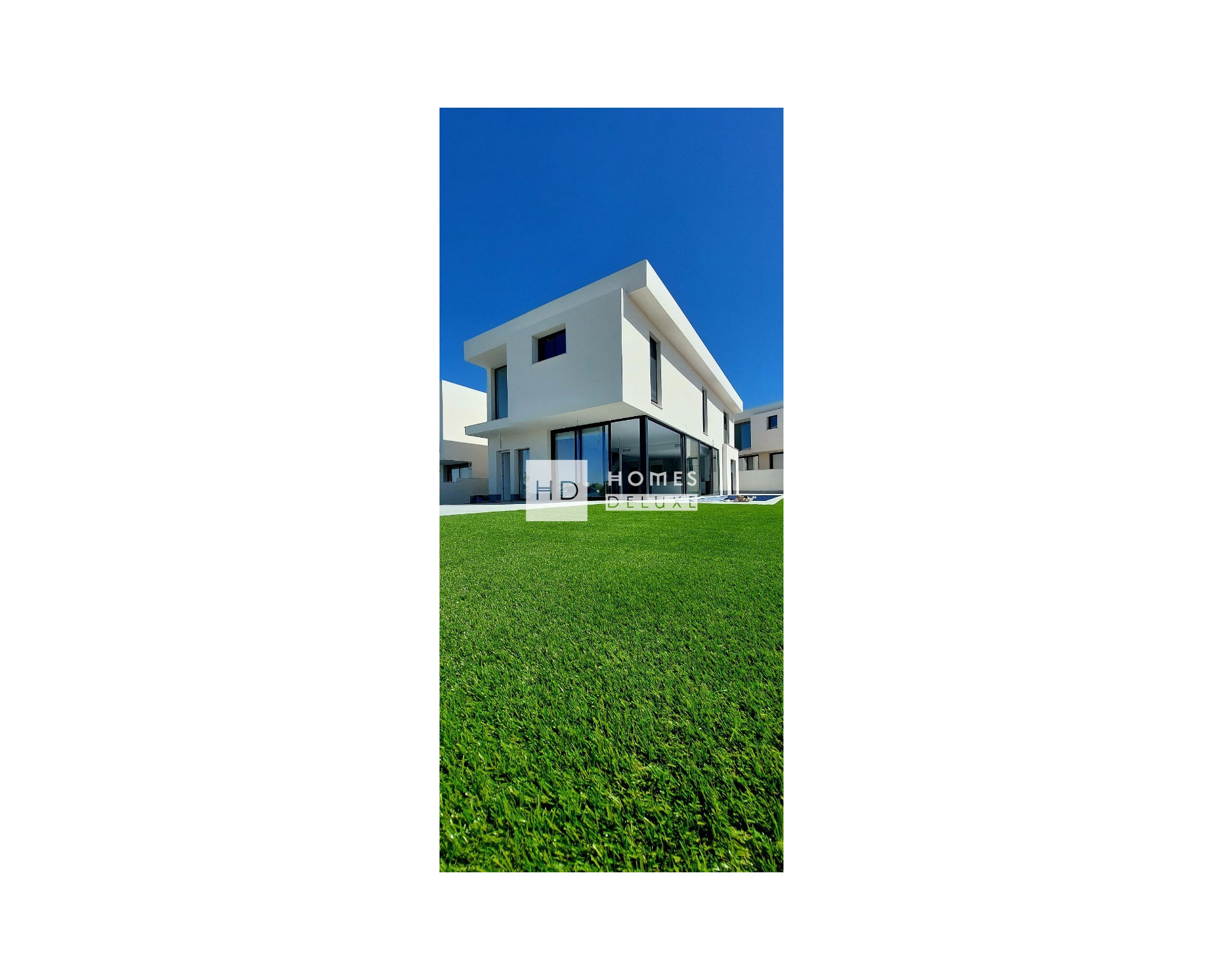 The villas are on plot sizes of 331m2 and the villa itself is distributed over two floors with 4 bedrooms, 3 bathrooms, has a double height distribution and is characterised by the huge windows, whose main objective is to capture as much natural light as possible achieving a comfortable atmosphere in the home.