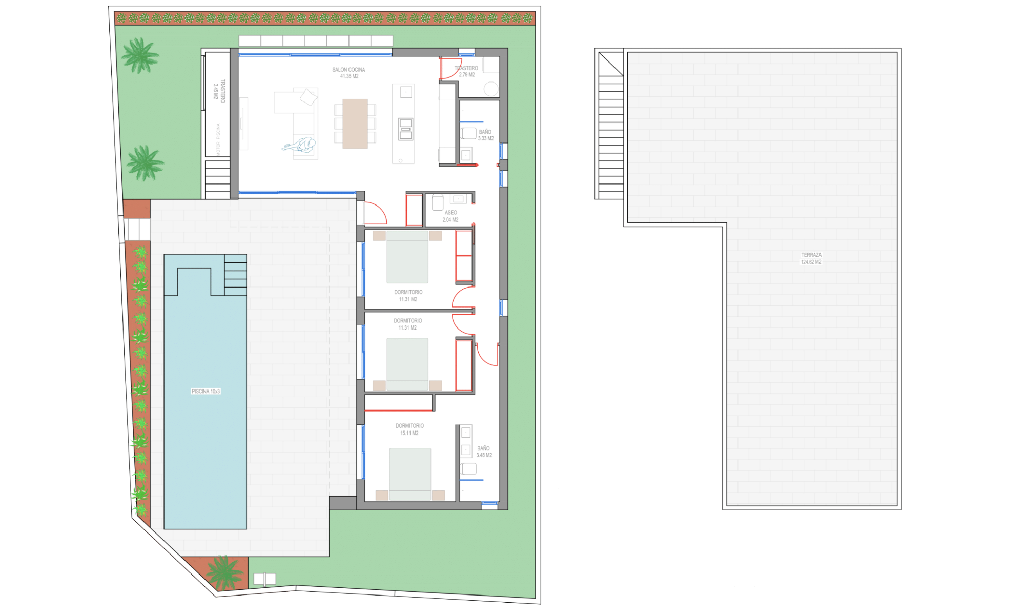 Brand new contemporary style detached villas with 3 bedrooms 3 bathrooms and private swimming pool located in San Javier (Murcia), surrounded by all amenities, sports facilities, near several golf courses and close to the beautiful sandy beaches.